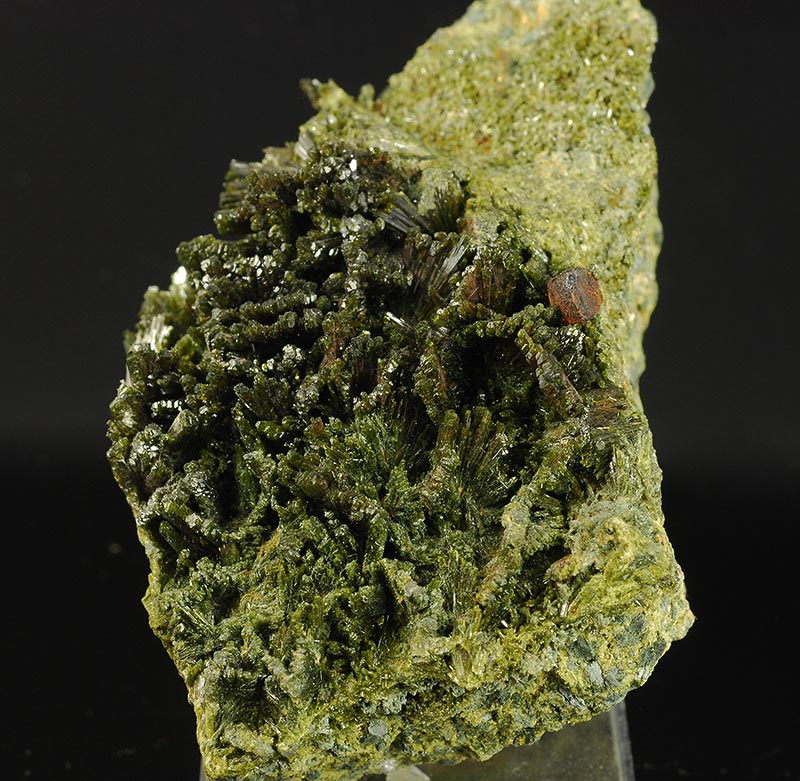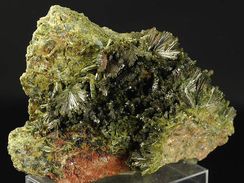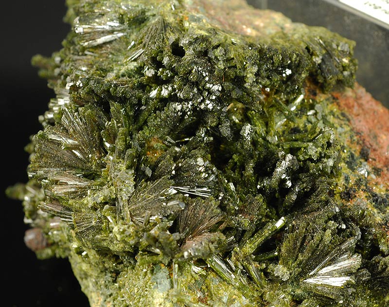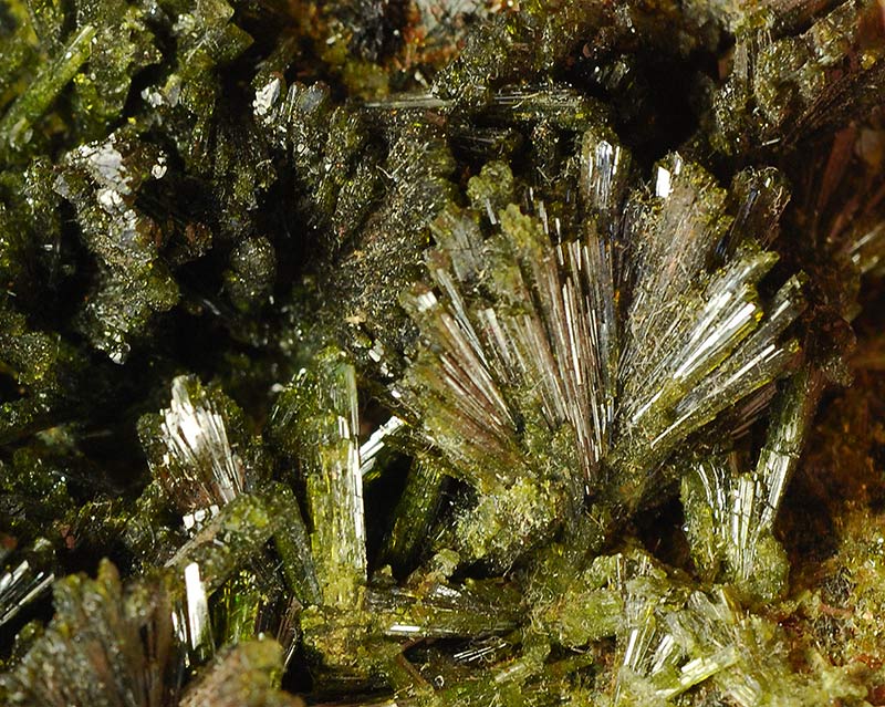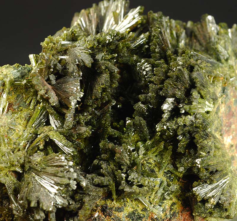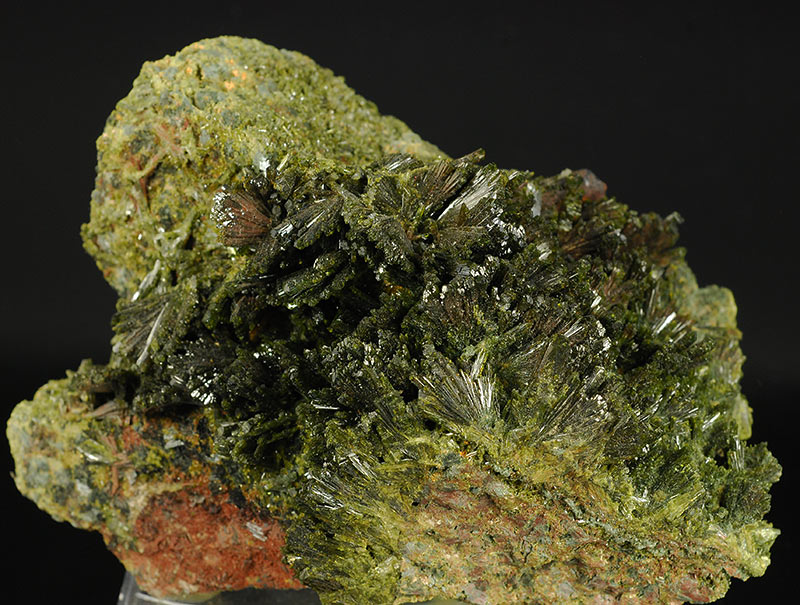 Several fans are made by long, dark green colored crystals of epidote anda are seeded over a large area of the matrix.