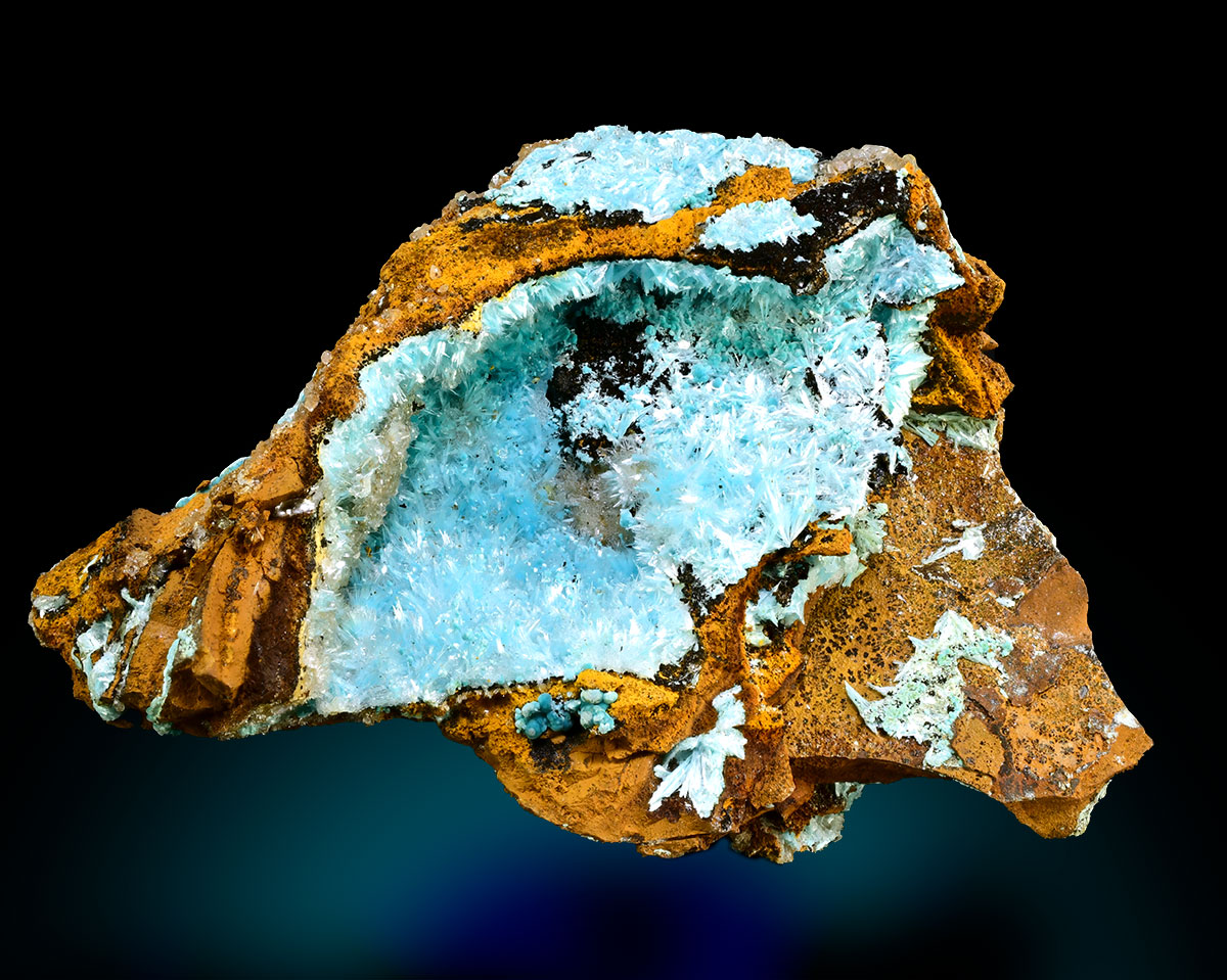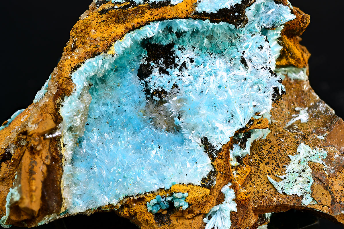 Very nice deep light blue aurichalcite in acicular crystals up to 2 mm on limonite matrix.