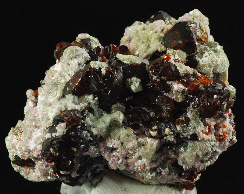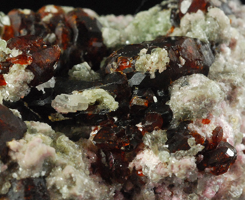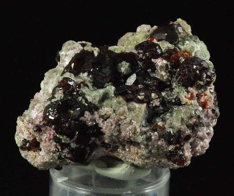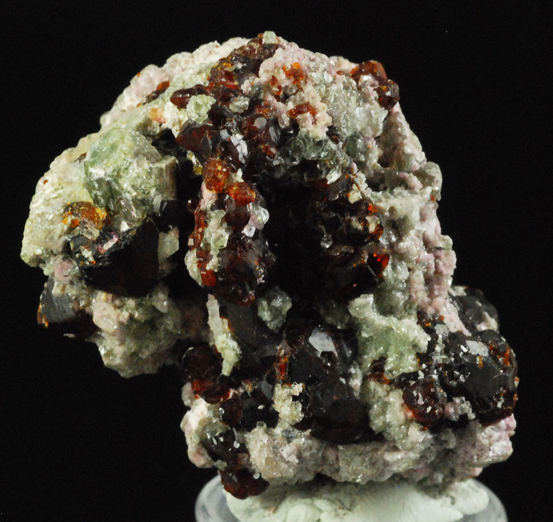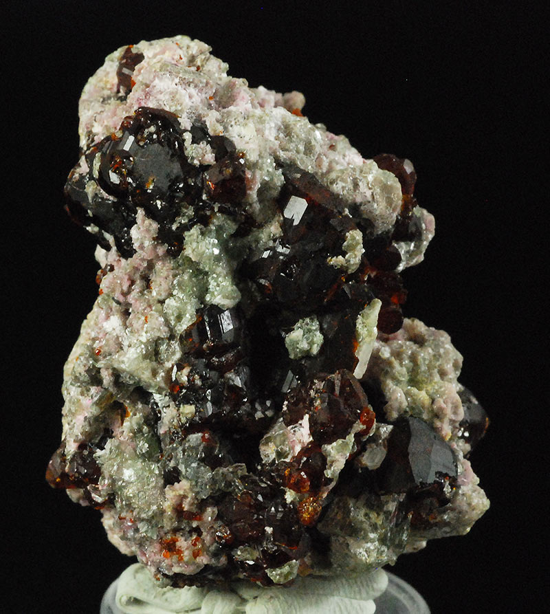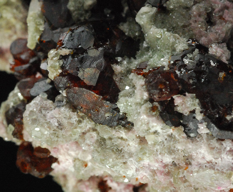 Numerous dark brown chondrodite crystals are prominently displayed on the surface of this specimen. The lighter ones have reddish reflections and are semitransparent. Former mineralogical collection of Sandro Maggia: no. C-25.