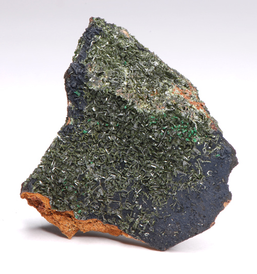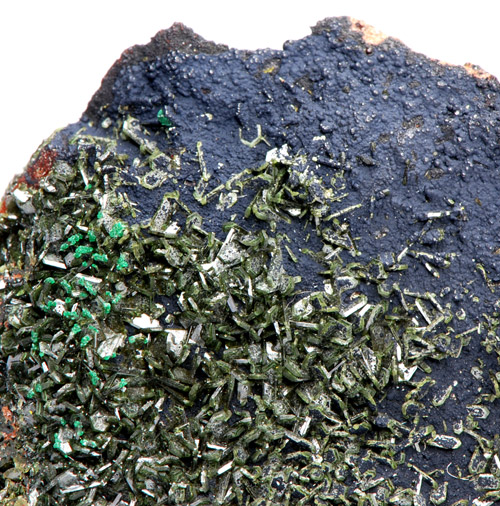 Nice miniature, with rich coverage of sharp Olivenite xls showing the characteristic olive-green color.