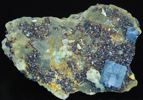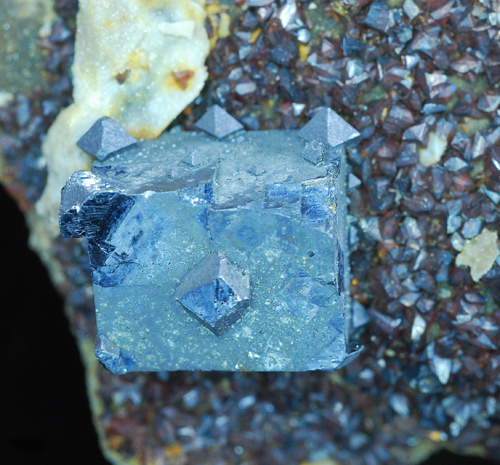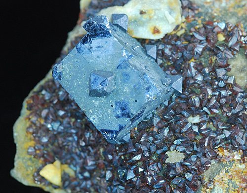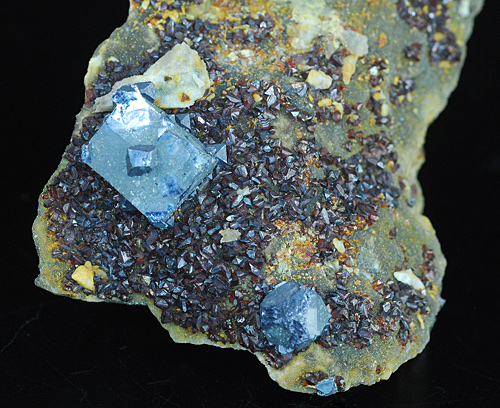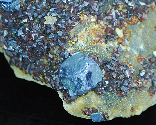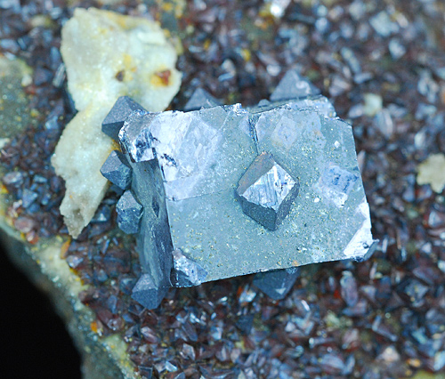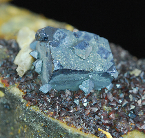 Several dark red litlle crystals of sphalerite are spread all over the surface of the matrix, with some crystals of whitish dolomite. A grey big crystal of galena is in good evidence, and is surrounded by some little octahedrycal crystals of galena too.