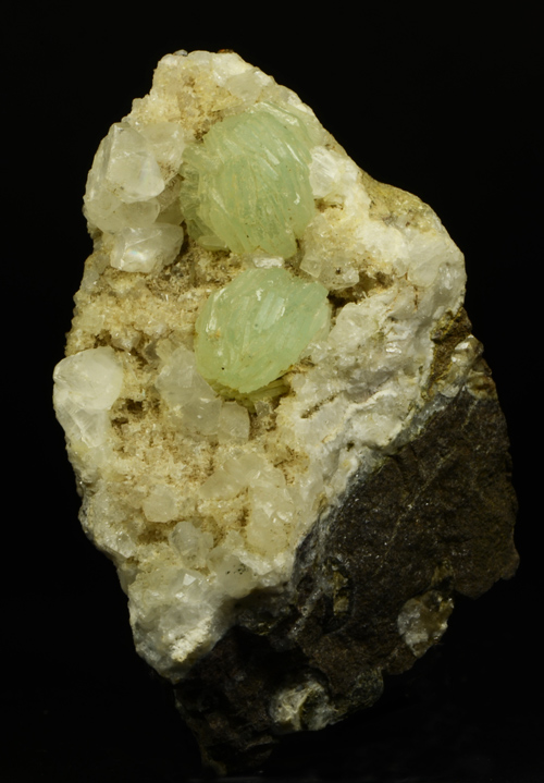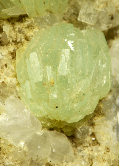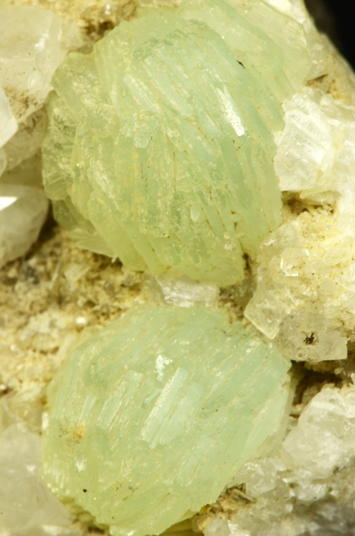 Bright green, spherical aggregates of Prehnite Xls on a bed of white quartz.
