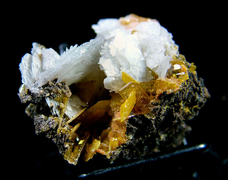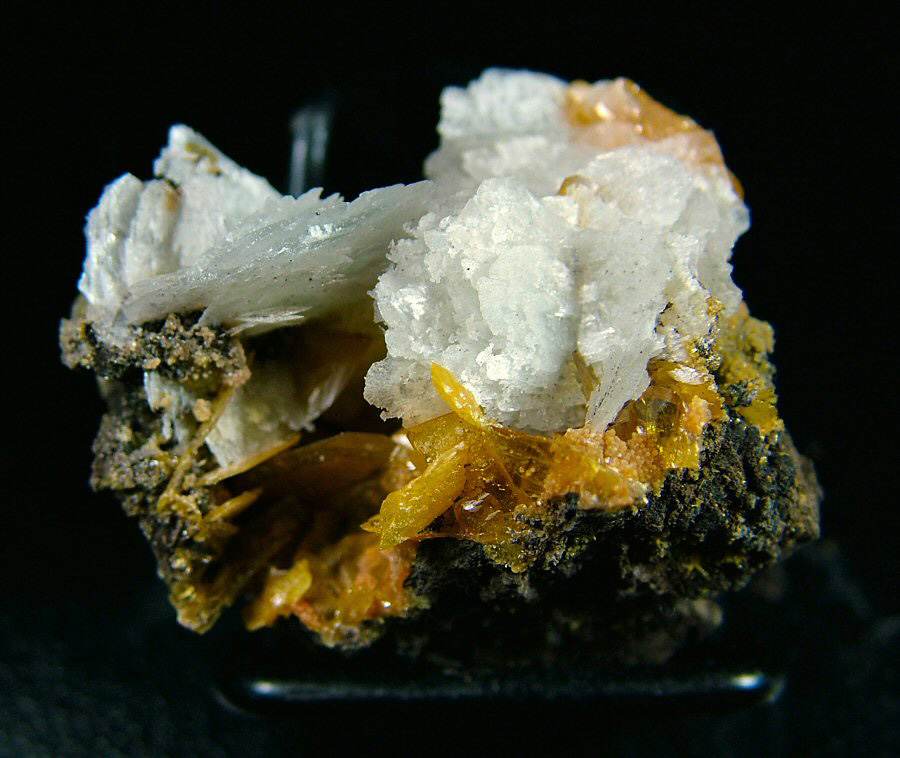 Up to 13 mm yellow Wulfenite, with white Baryte's crystals and orange Mimetite. Aesthetic sample from this locality, with classical paragenesis.