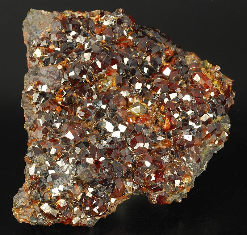 The surface of this excellent cluster is completely dressed by brilliant and dark red colored crystals of spessartine garnet. The faces of the crystals are absolutely natural mirror polished and reflect the light. An high quality specimen that becomes from an old collection and is very aesthetic !