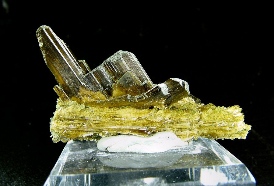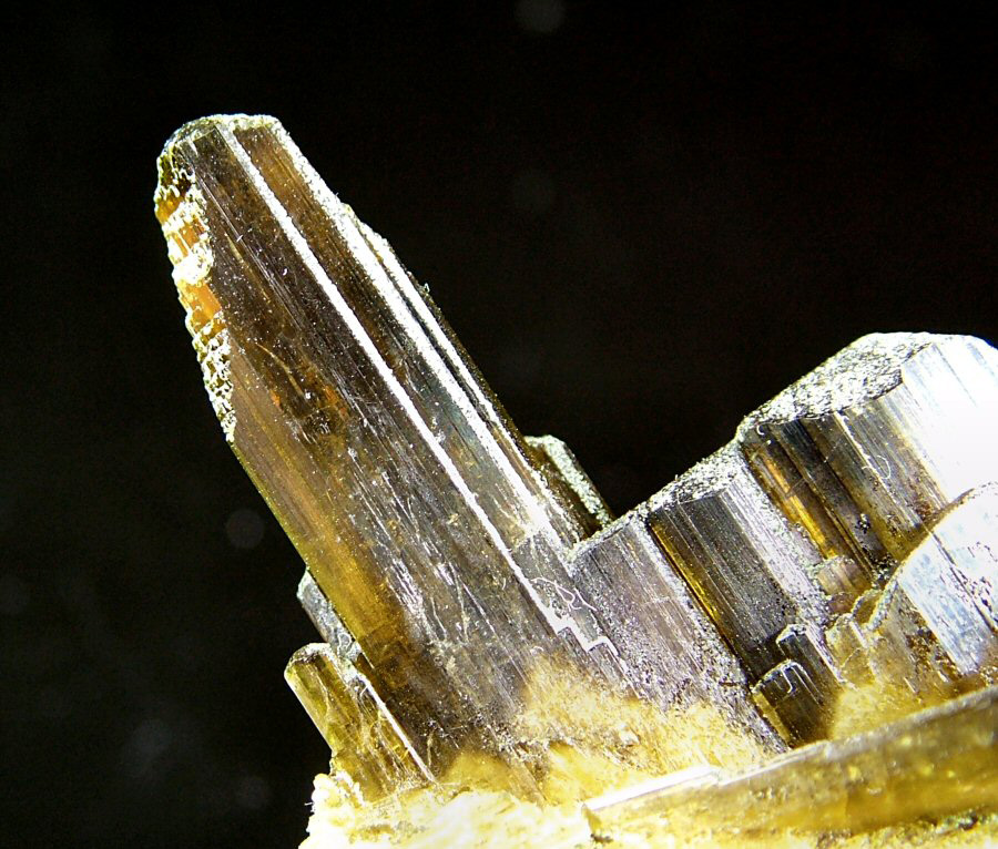 This nice sample shows sharp, glossy, gemmy, olive green crystals, with well defined faces and numerous twinnings. It shows also a slight pleochroism. In very good conditions.