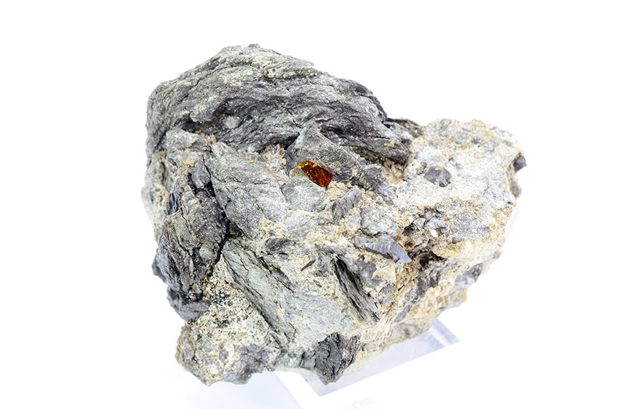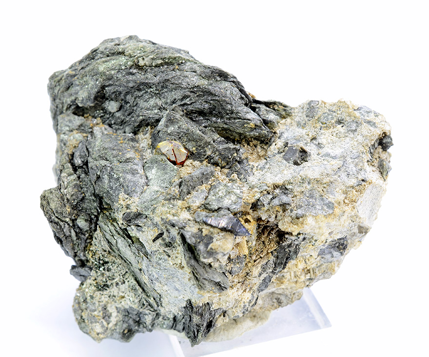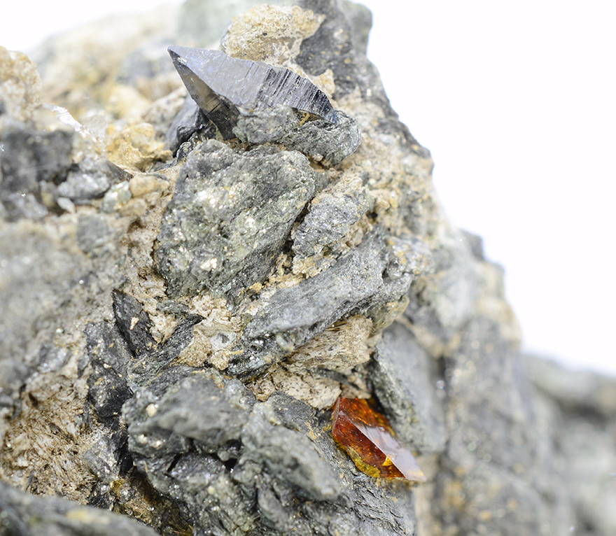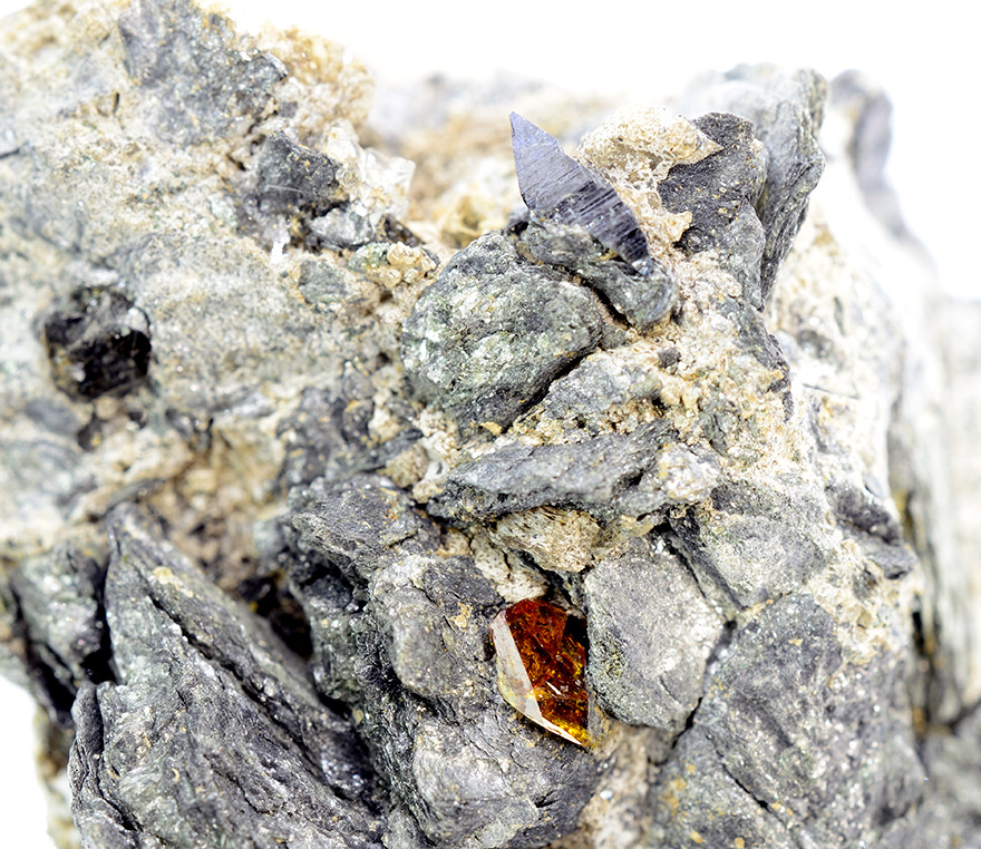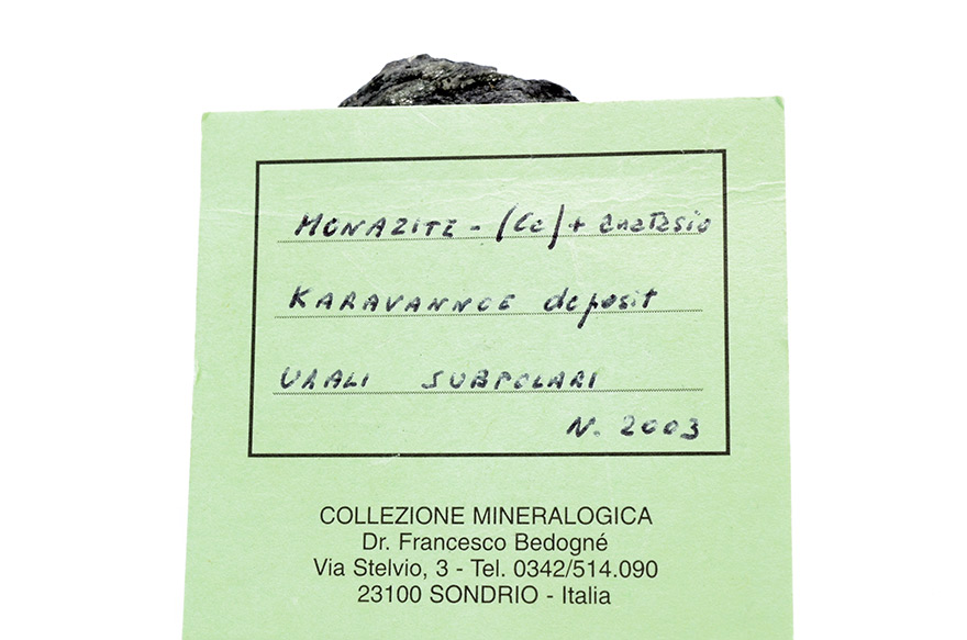 A Monazite-(Ce) crystal with adamantine luster 4,5 mm wide is set nicely on matrix with Anatase 6 mm tall in assocation. Nice combo from a remote location. Ex Francesco Bedognč coll. n. 2003 with label.