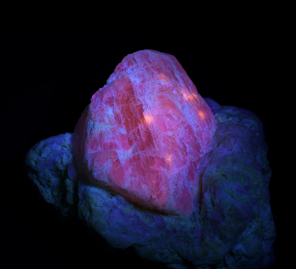 Specimen with Hackmanite crystal 3,0 cm tall on bulky quartz matrix. Strong fluorescen of UV.