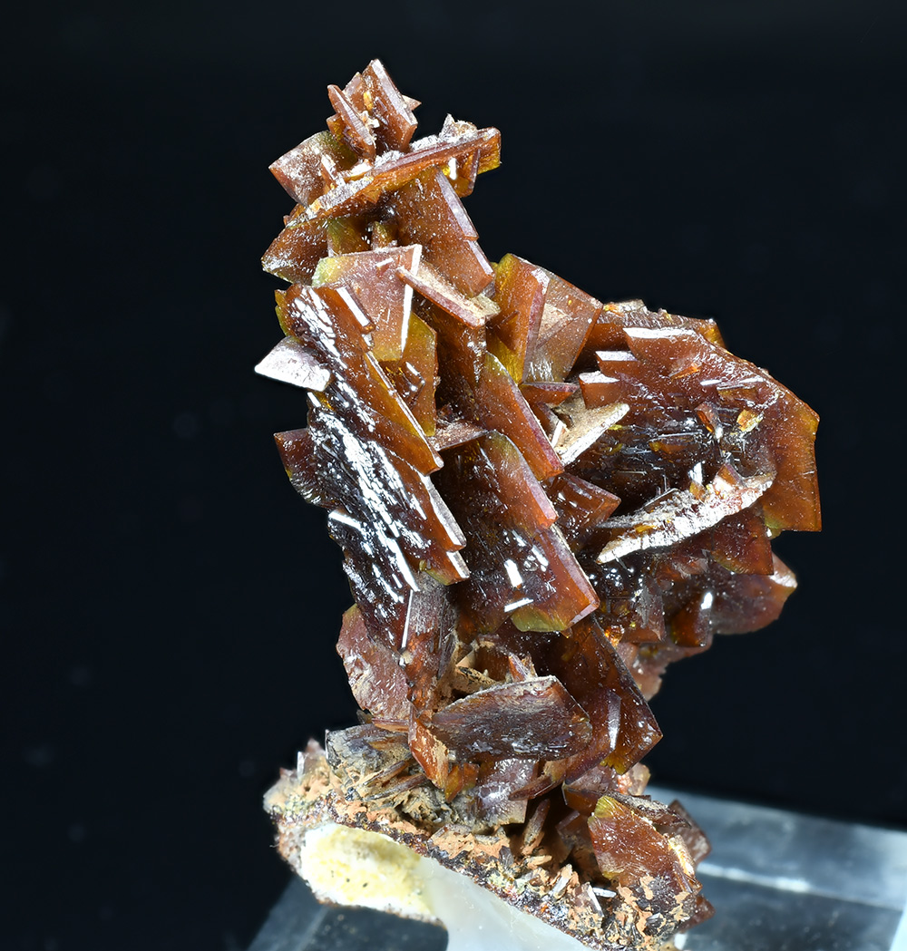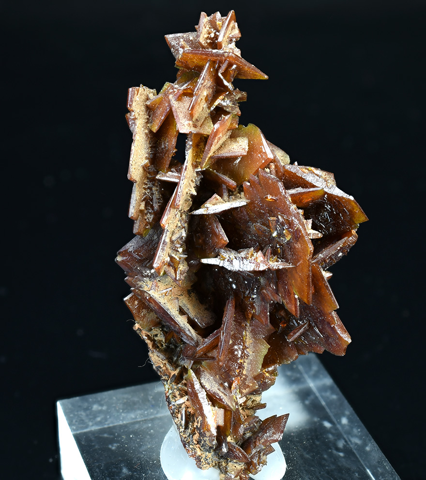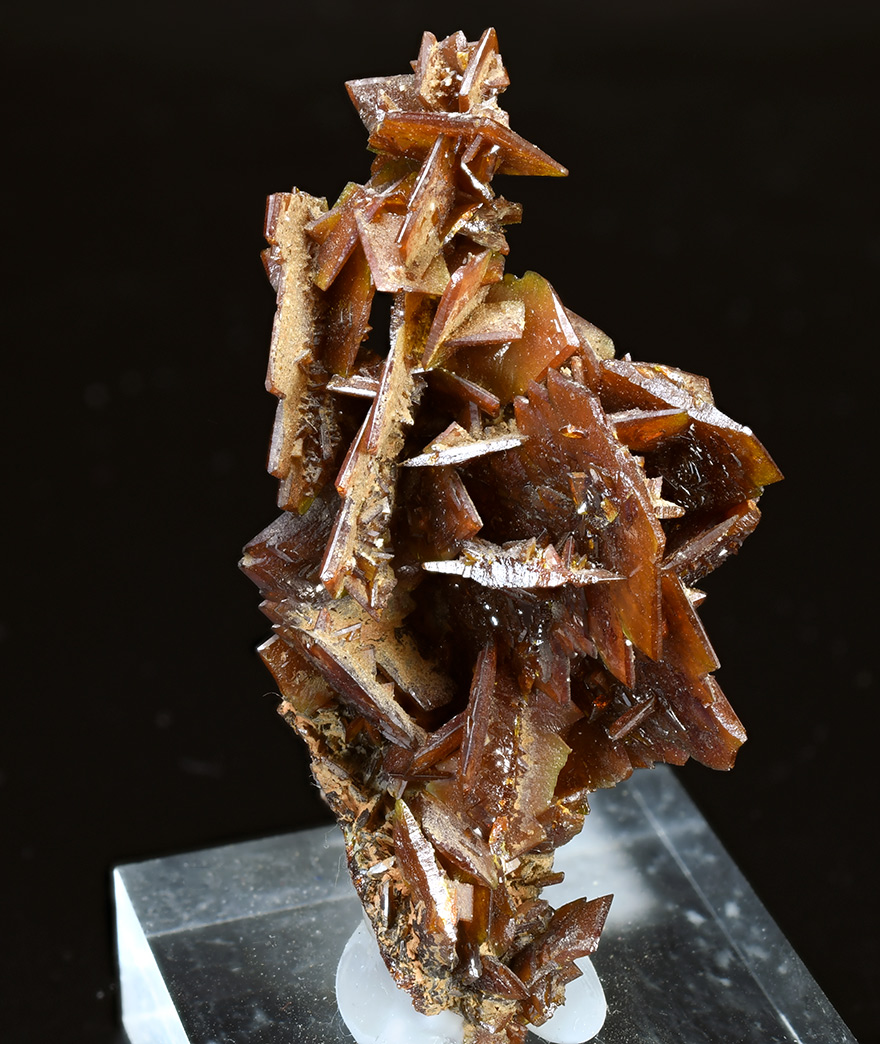 Cluster of many brown descloizite crystals in a branching formation of arrowhead-shaped crystals up to 1,5 cm. The descloizite is translucent with good crystal development and lustrous faces in areas.