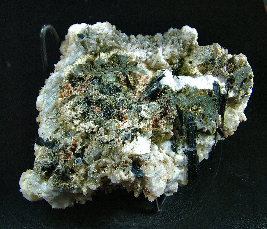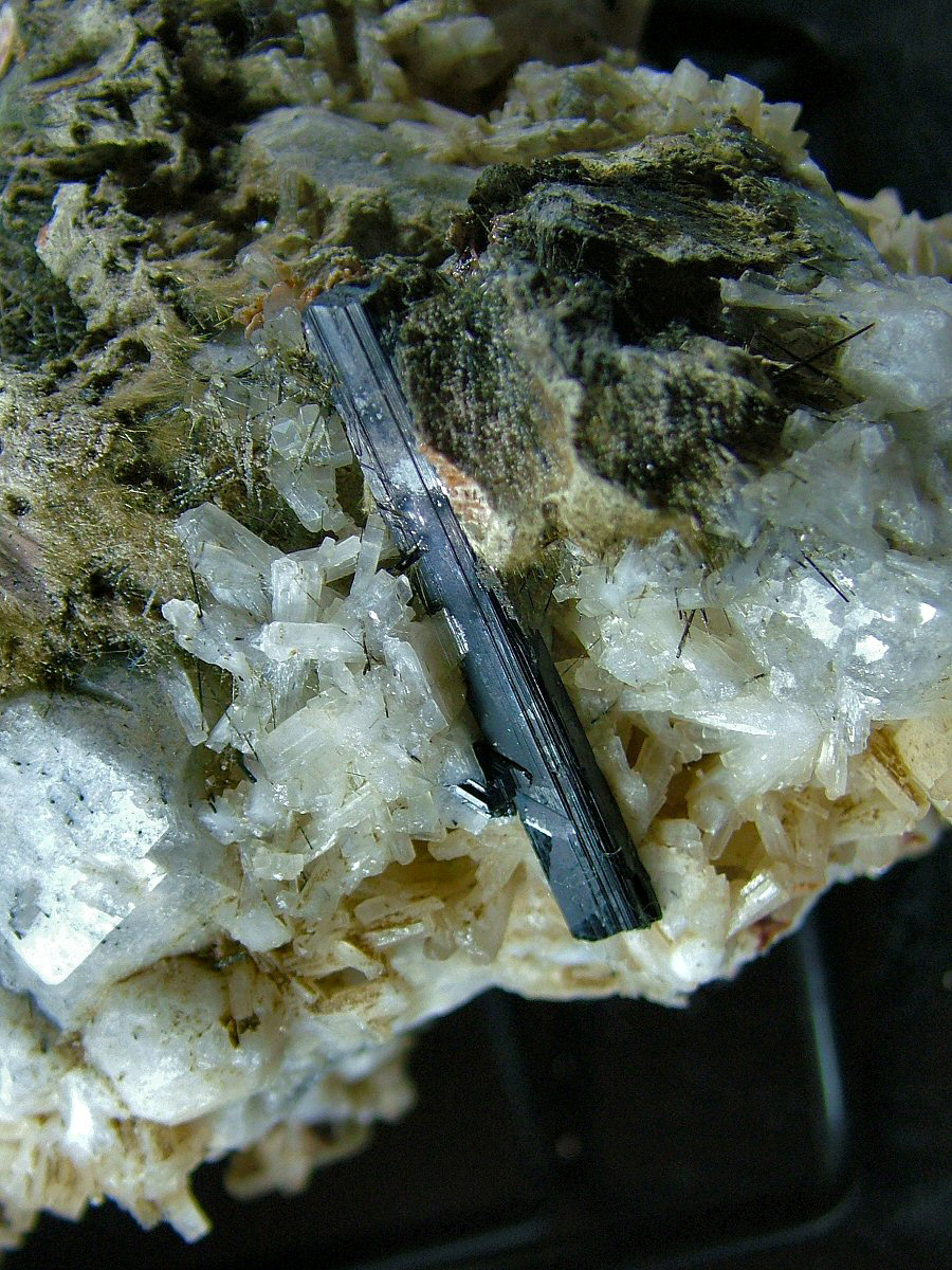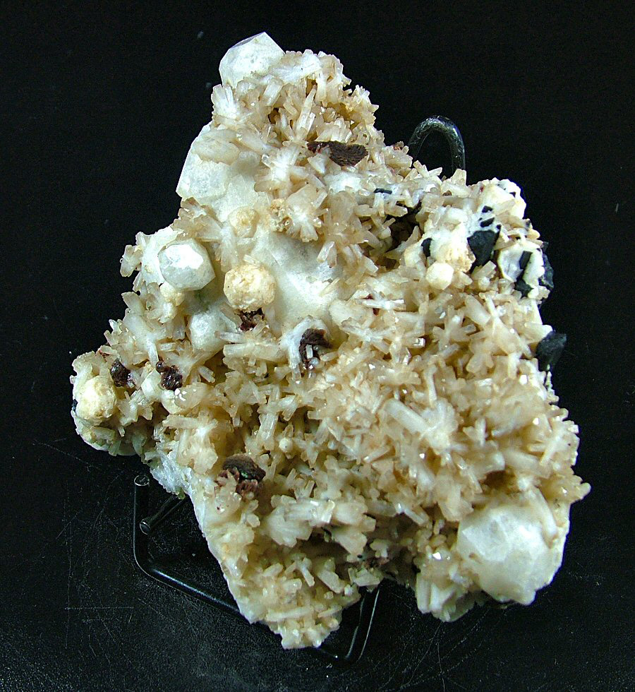 Analcime's crystals, the biggest of 50 mm, are partially covered by 22 mm Natrolite's crystals, also biterminated, nice well formed Rhodochrosite's rosettes up to 15 mm and Aegirine, both in big crystals up to 38 mm and in small, slender, filiform crystals to cover the rear side of the sample. Only an adjective: wonderful. Not to be missed.