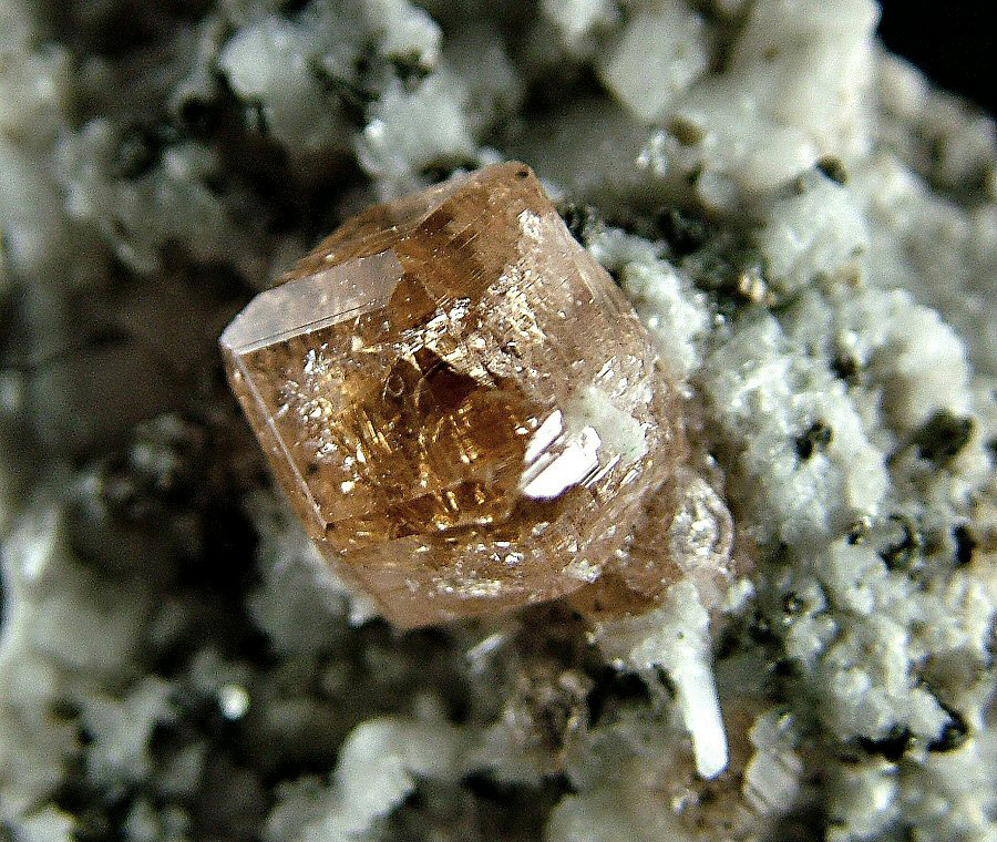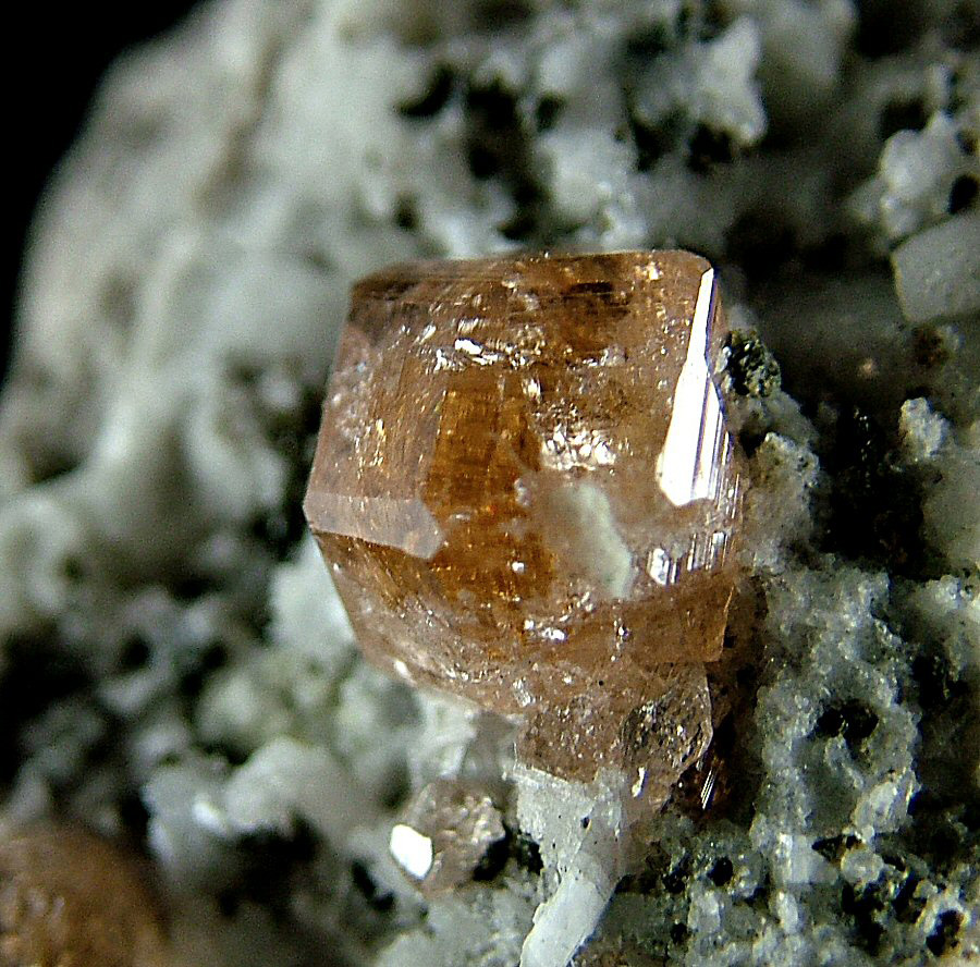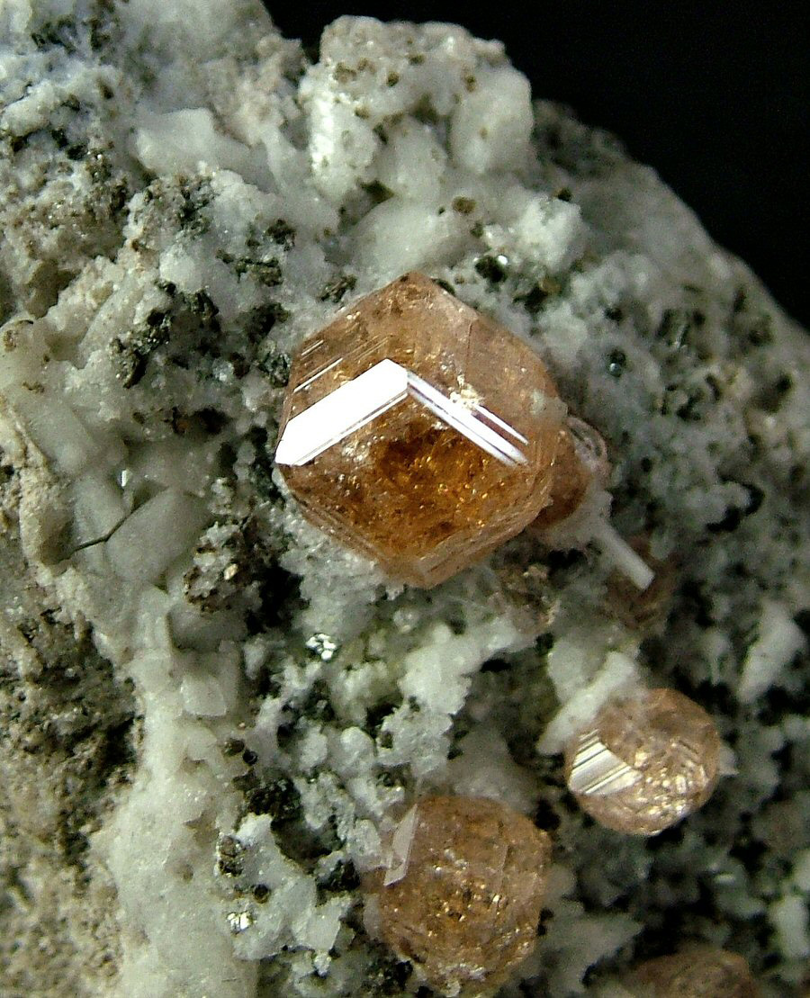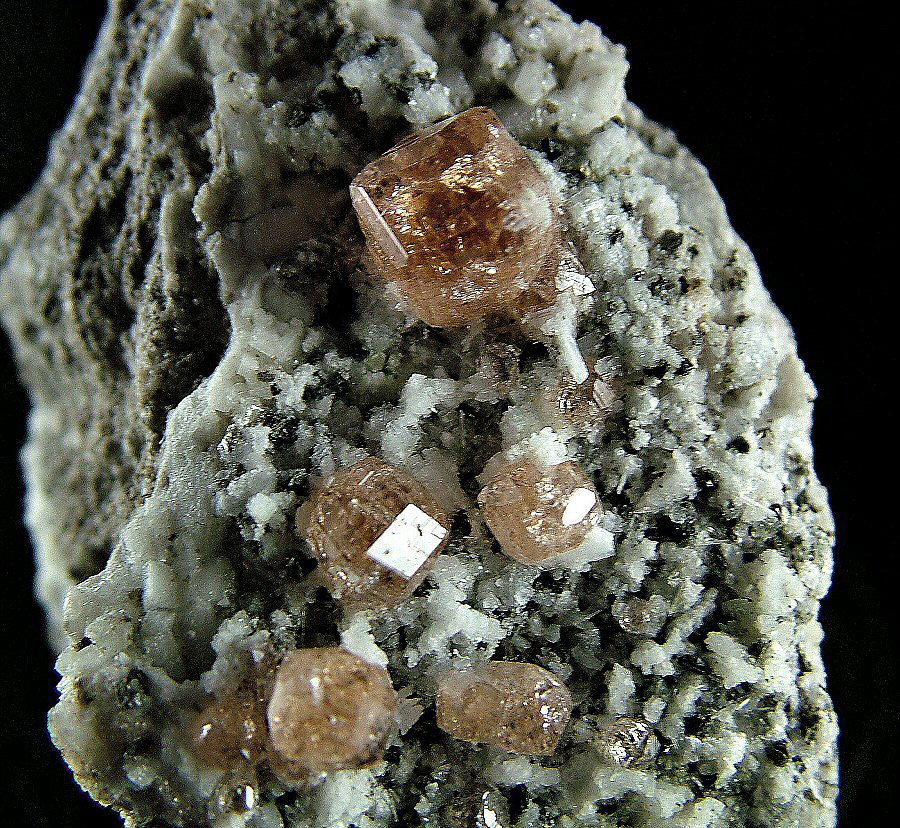 On a carpet of Pectolite's crystals are implanted very glossy and gemmy Grossular's crystals, with a pleasant cognac color and good dimensions (up to 9 mm). Very nice piece, in very good conditions.