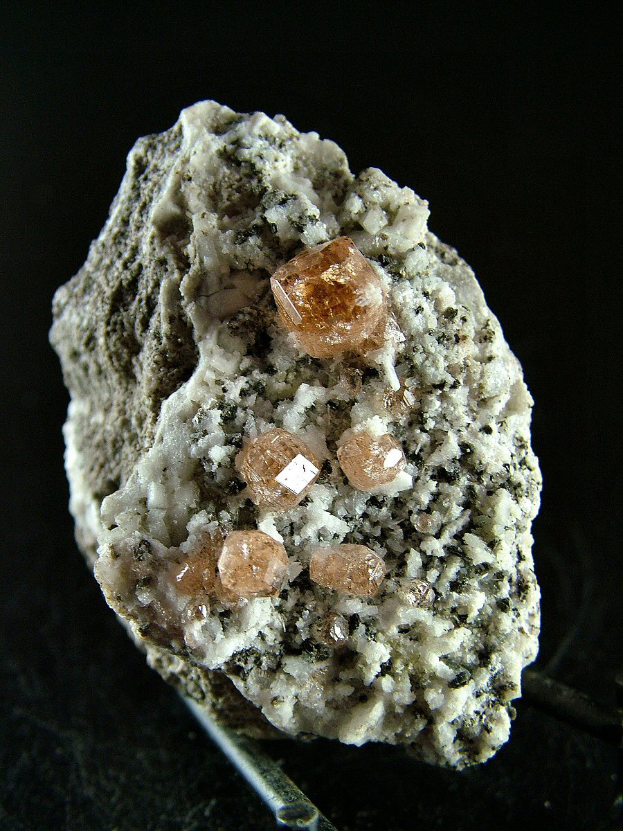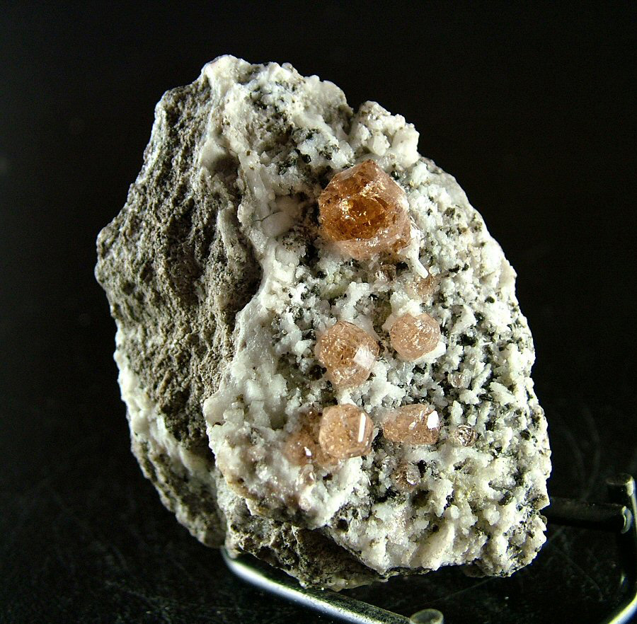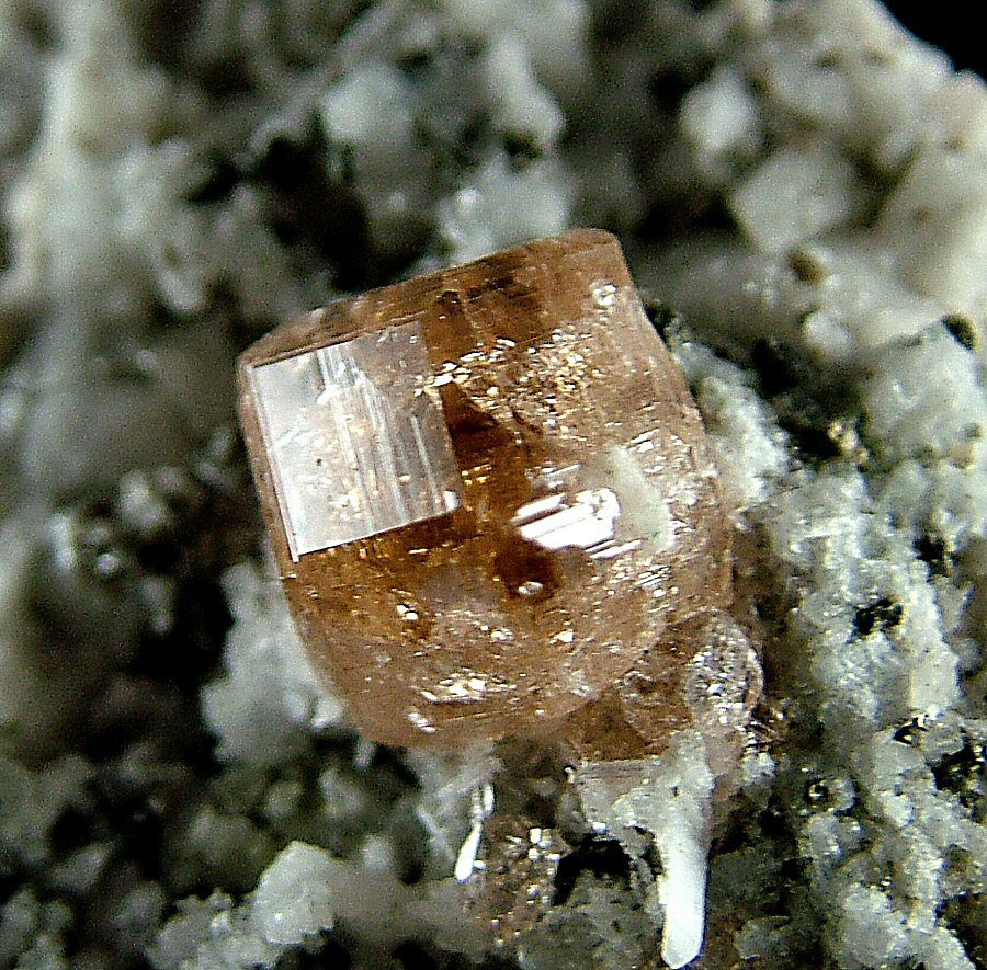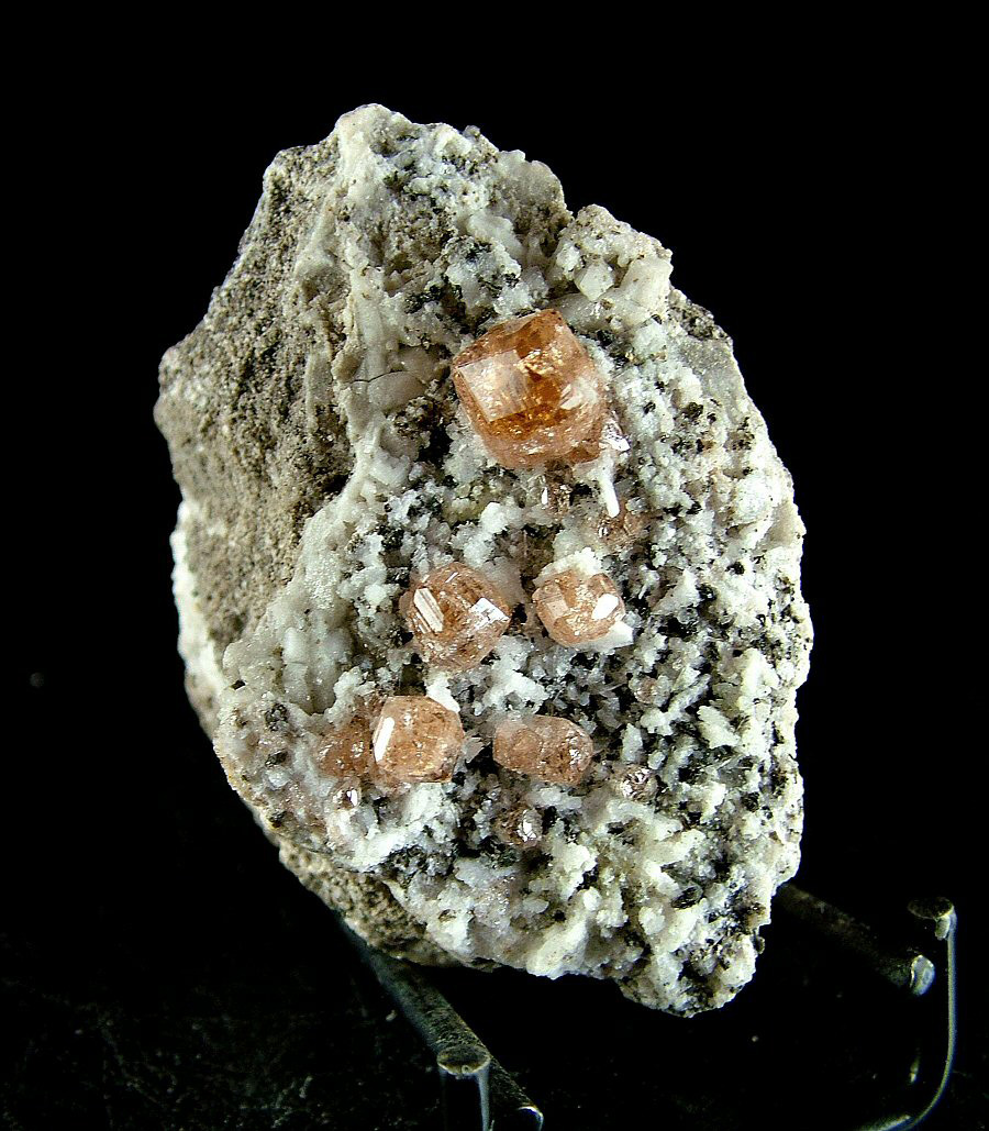 On a carpet of Pectolite's crystals are implanted very glossy and gemmy Grossular's crystals, with a pleasant cognac color and good dimensions (up to 9 mm). Very nice piece, in very good conditions.