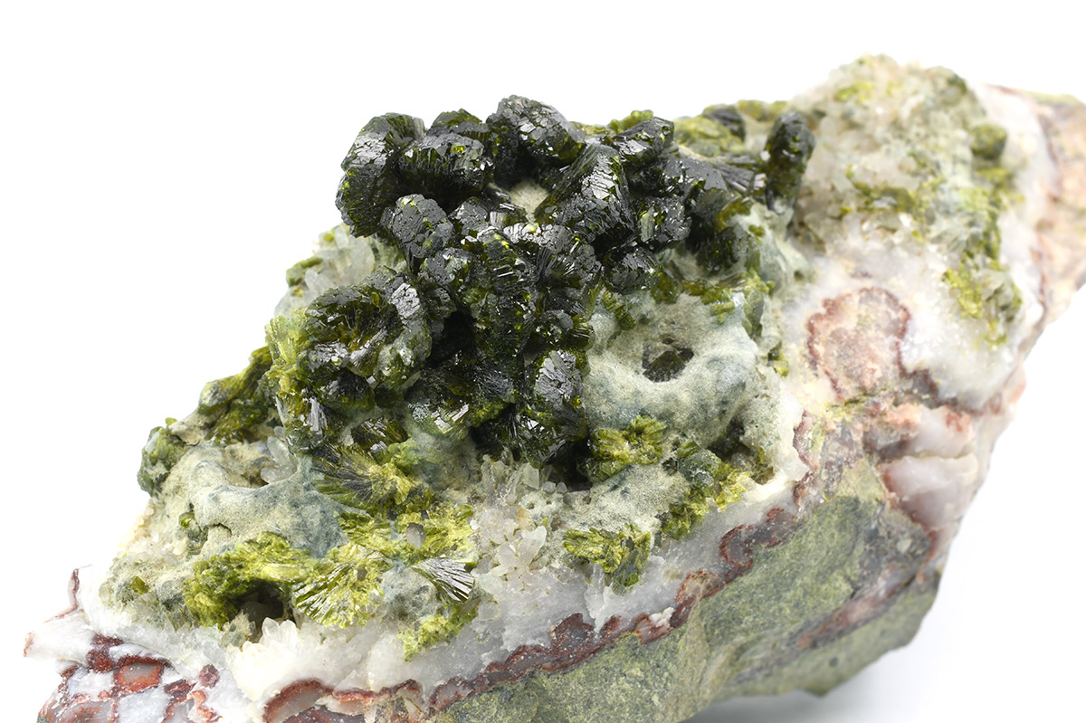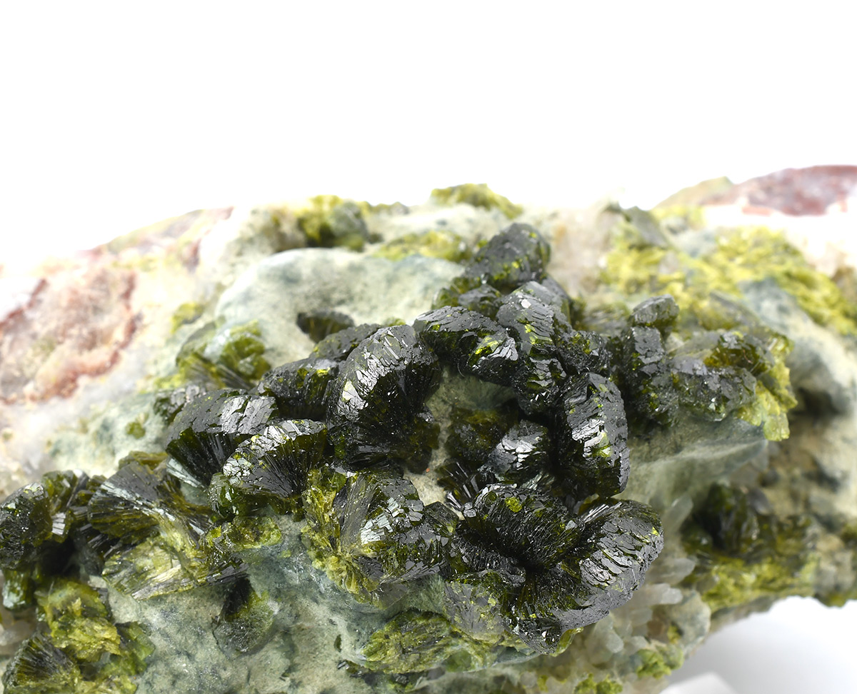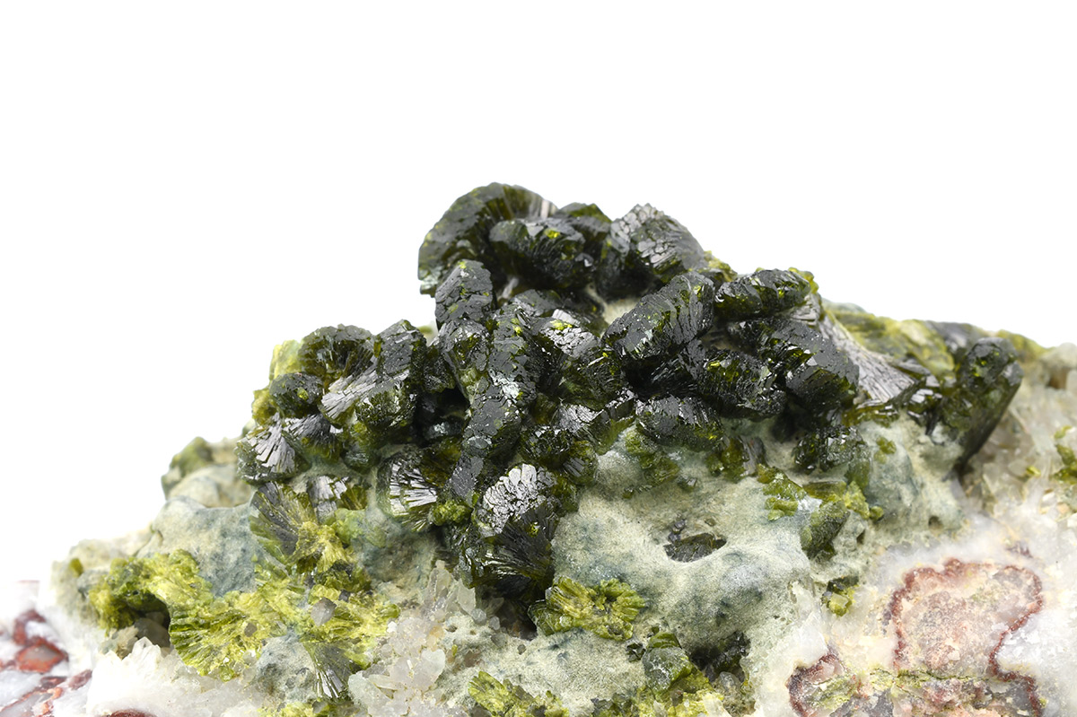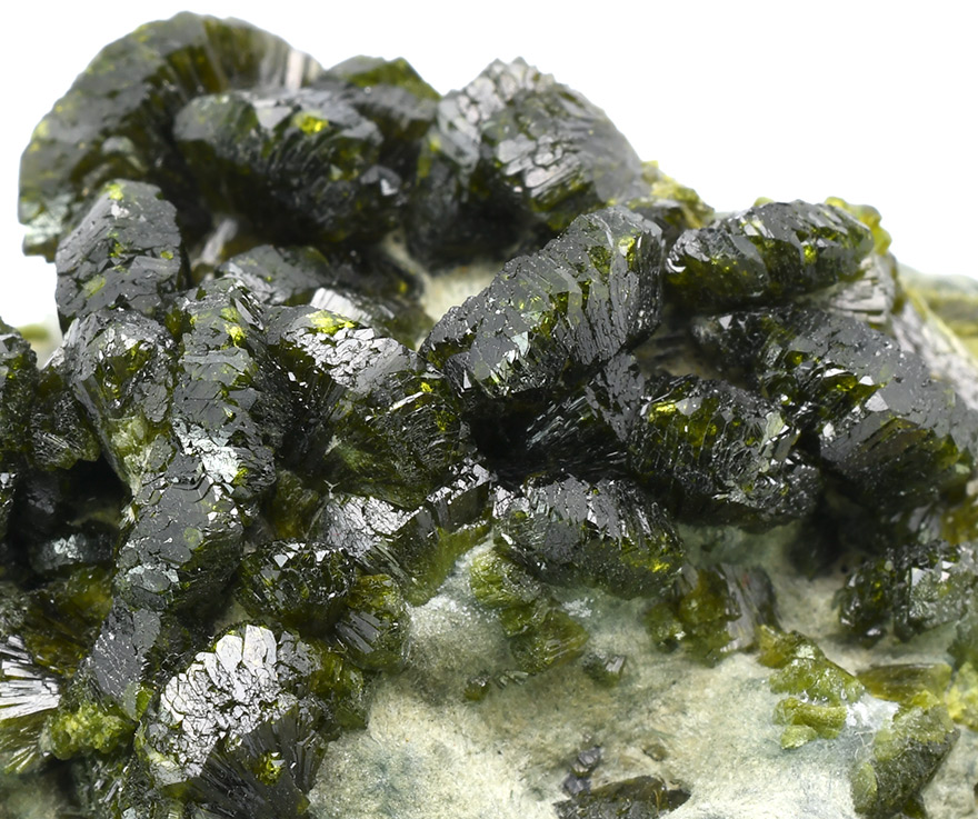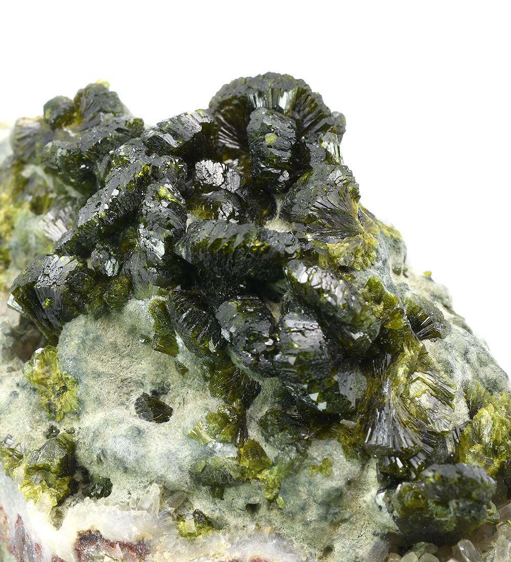 A very attractive specimen of sharp, lustrous, translucent, prismatic Epidote crystals up to 1,0 cm wide in "fan"-shaped aggregates on Quartz matrix.