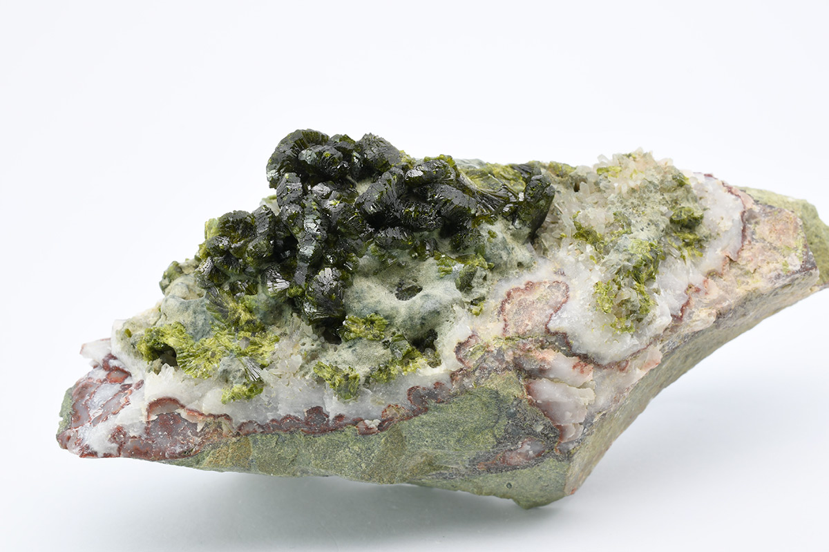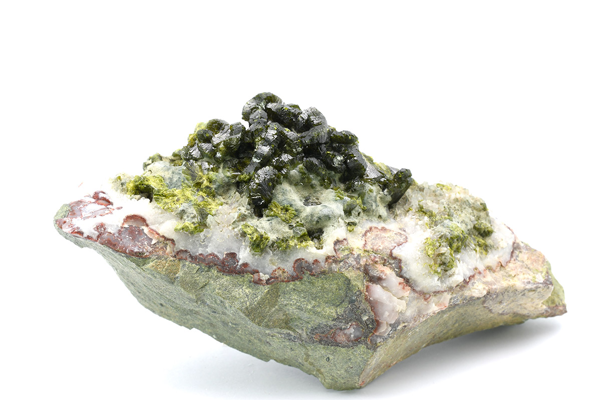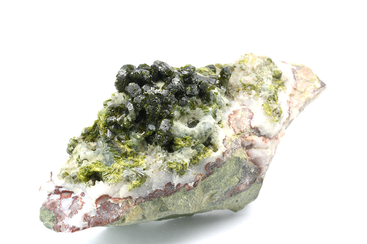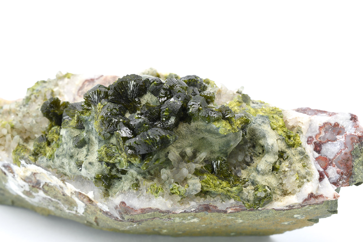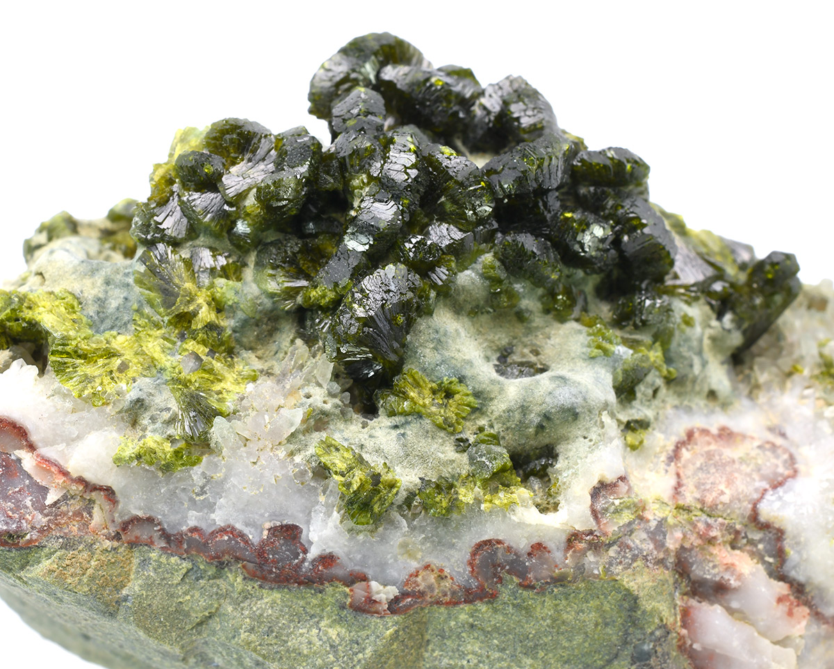 A very attractive specimen of sharp, lustrous, translucent, prismatic Epidote crystals up to 1,0 cm wide in "fan"-shaped aggregates on Quartz matrix.