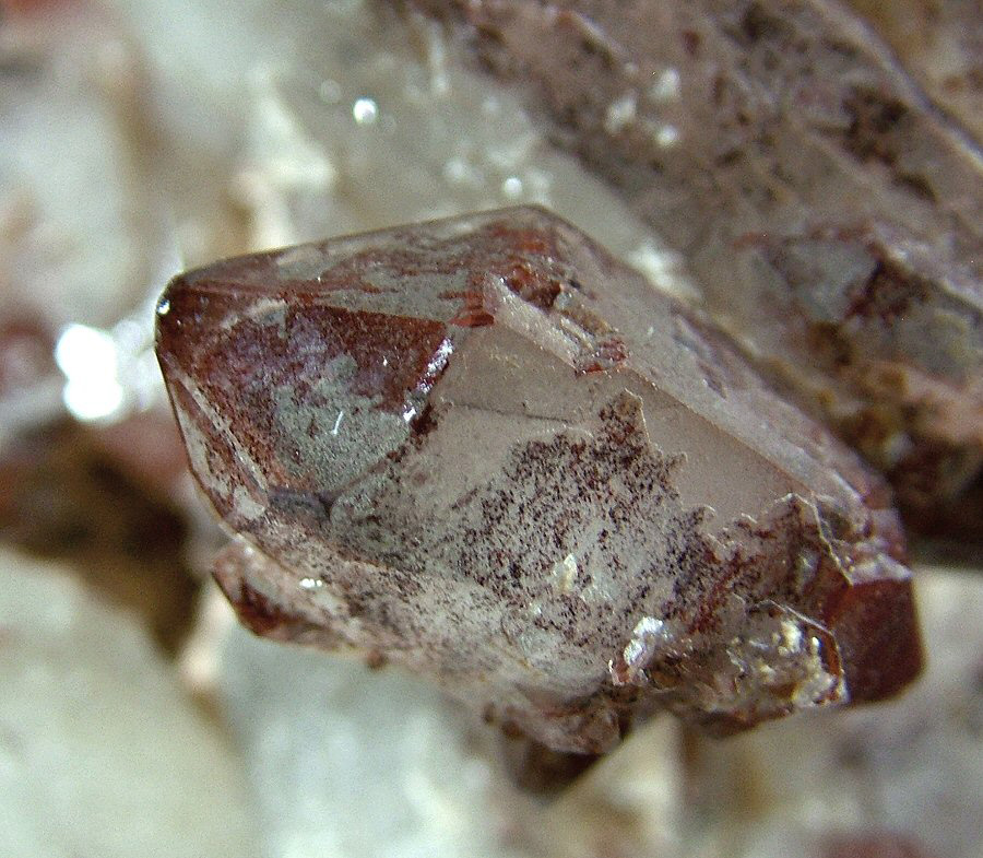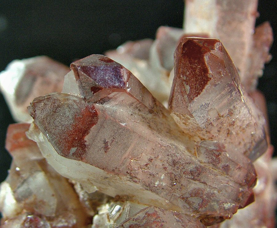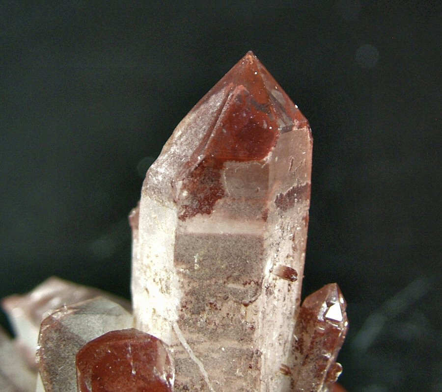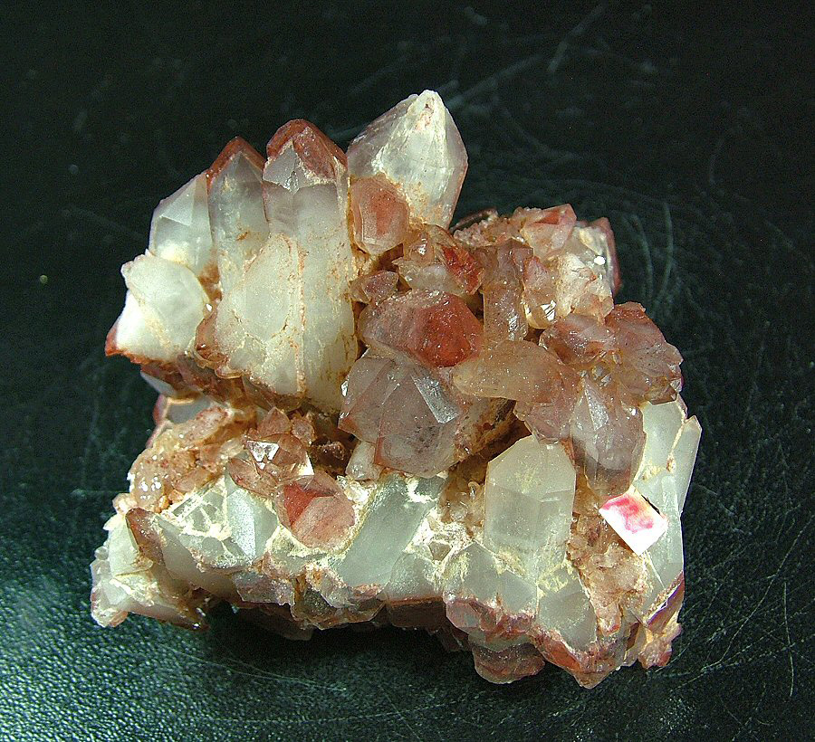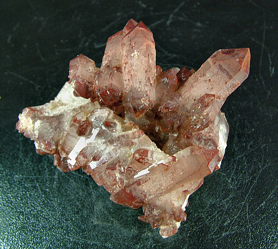 Elegant group of Quartz's crystals, some biterminated, up to 40 mm in lenght, partially covered by a second generation of Hematoide Quartz, that gives the sample its reddish appearance. Crystallized on every side, elegant and aesthetic. Phographed under strong light.