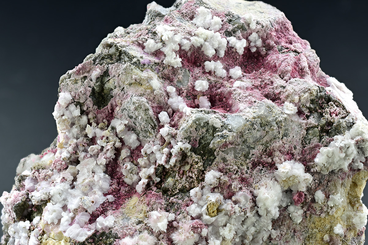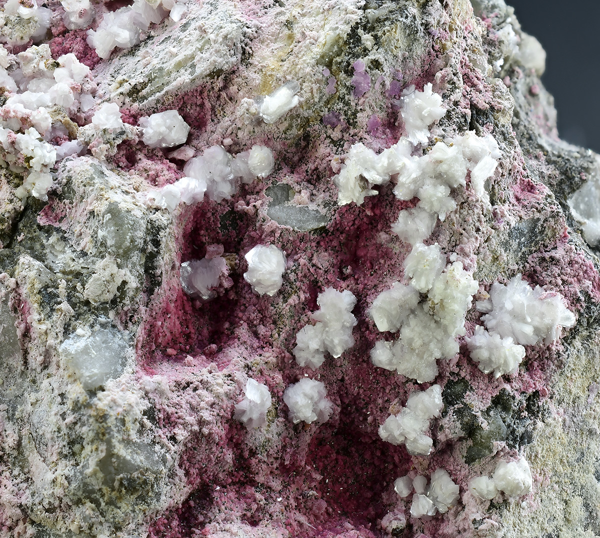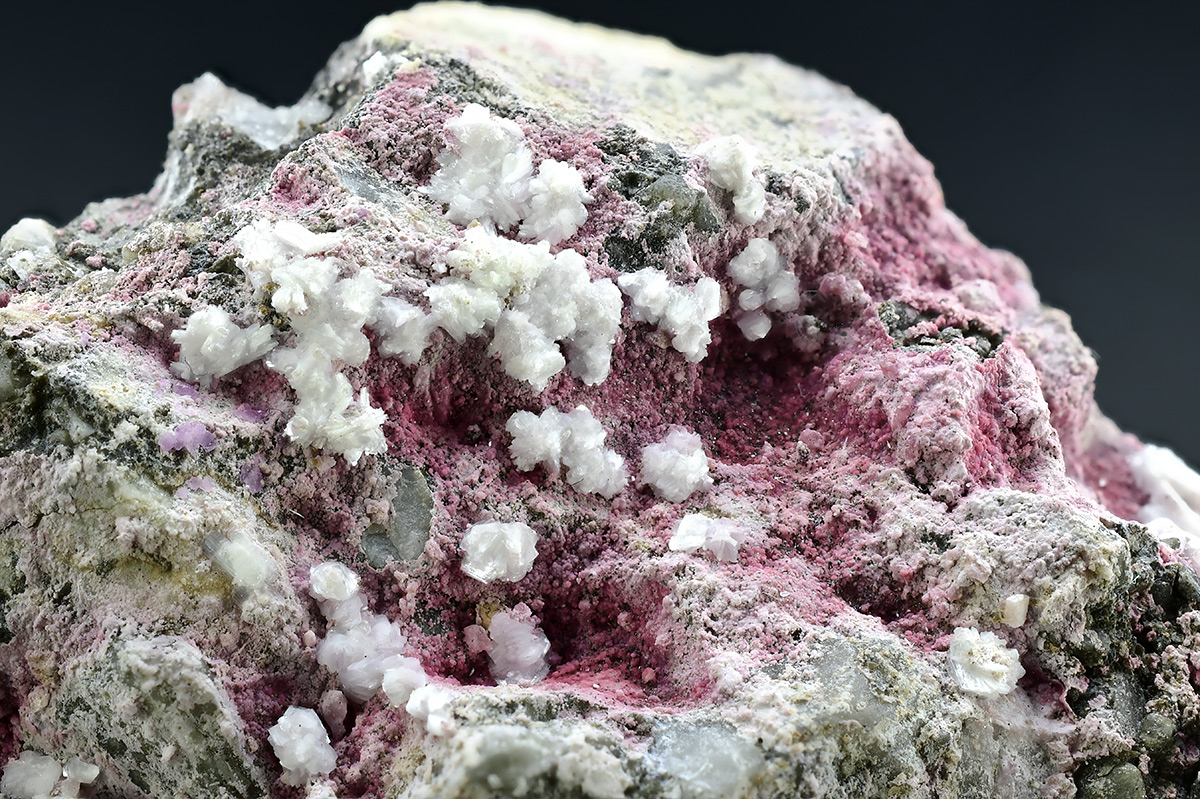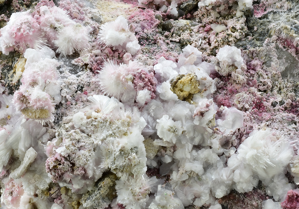 Tabular, thin, white, Guérinite crystals up to 1.5 mm richly scattered on matrix with sprays of Picropharmacolite and red Erythrite in association.