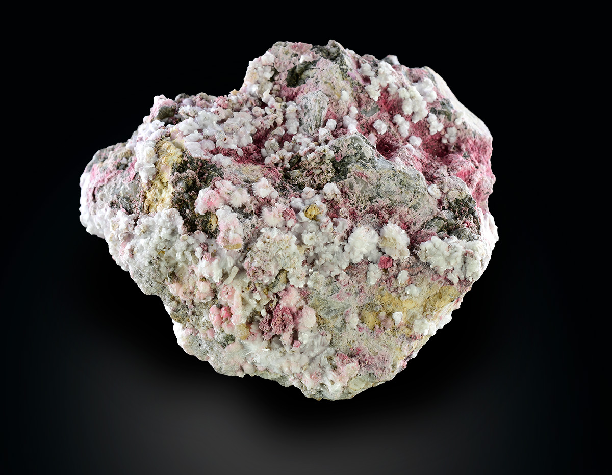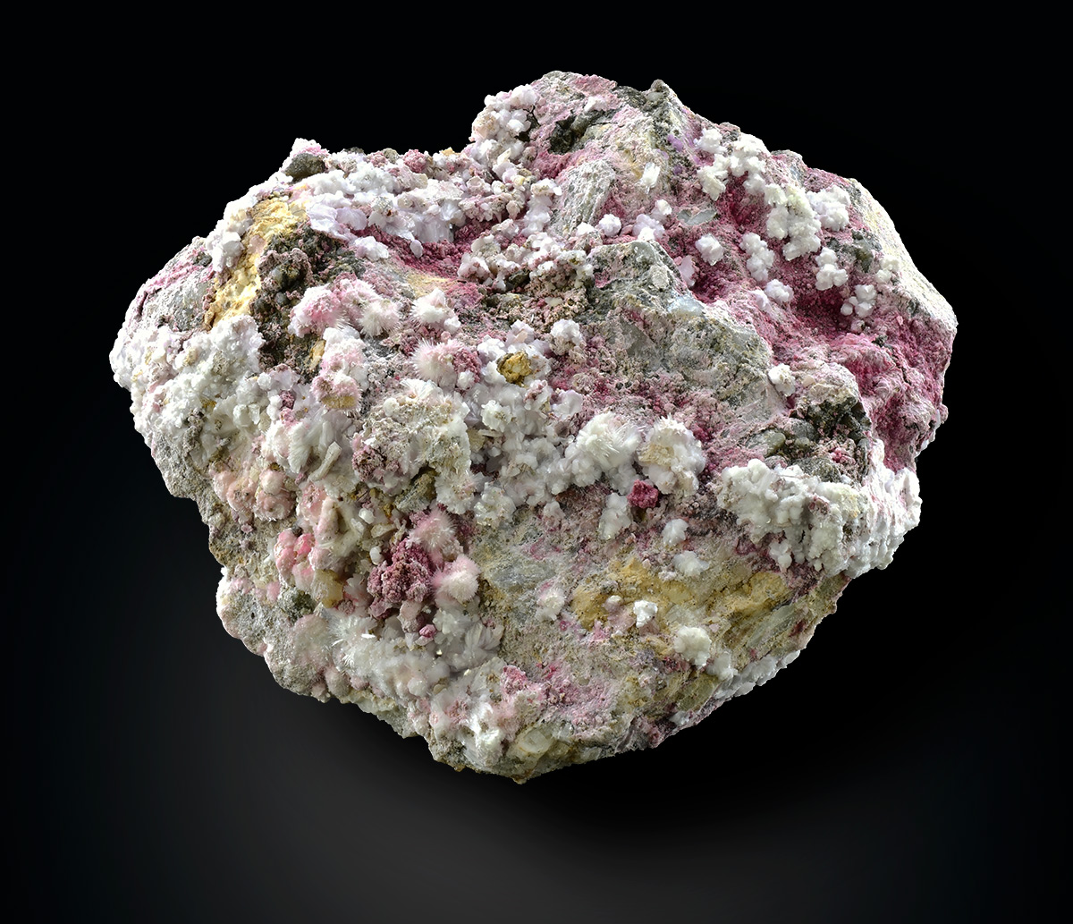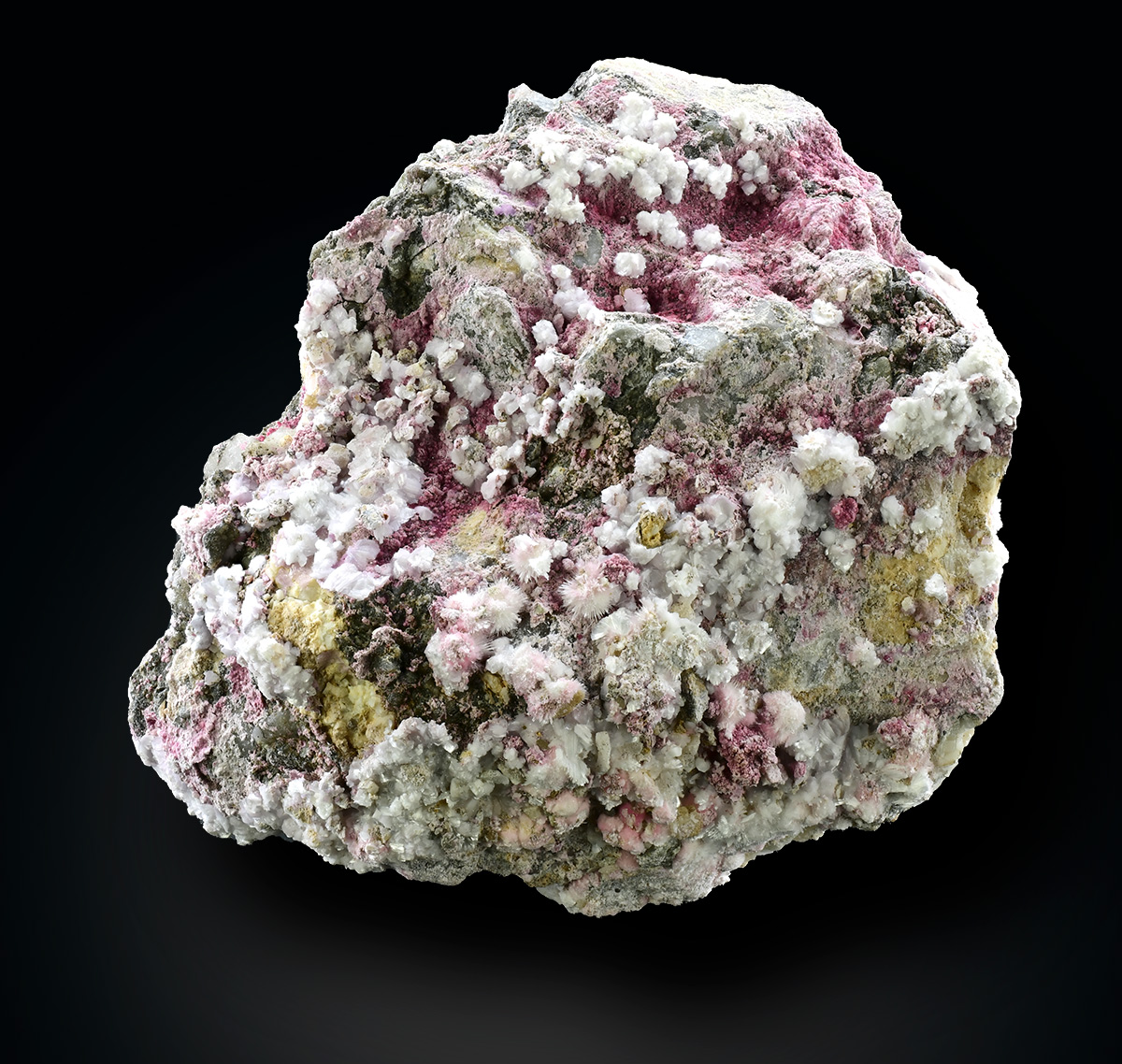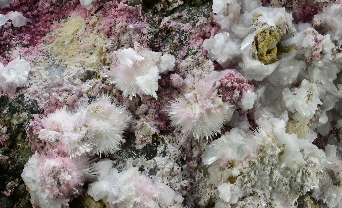 Tabular, thin, white, Guérinite crystals up to 1.5 mm richly scattered on matrix with sprays of Picropharmacolite and red Erythrite in association.
