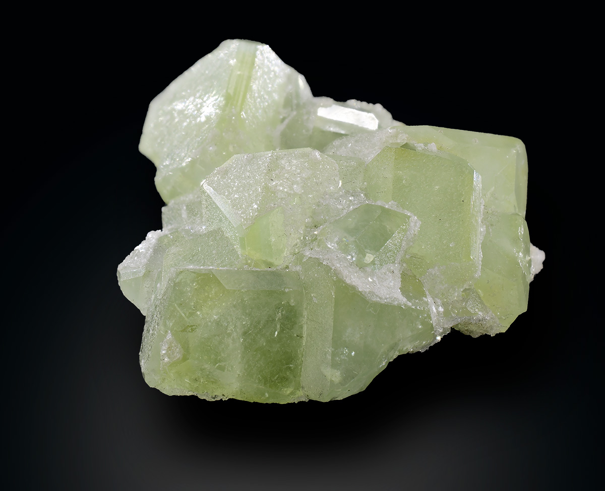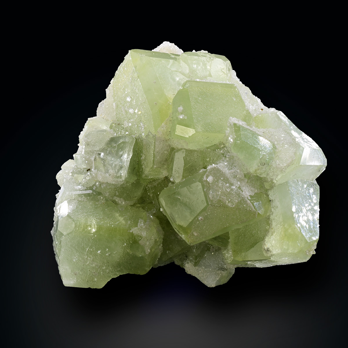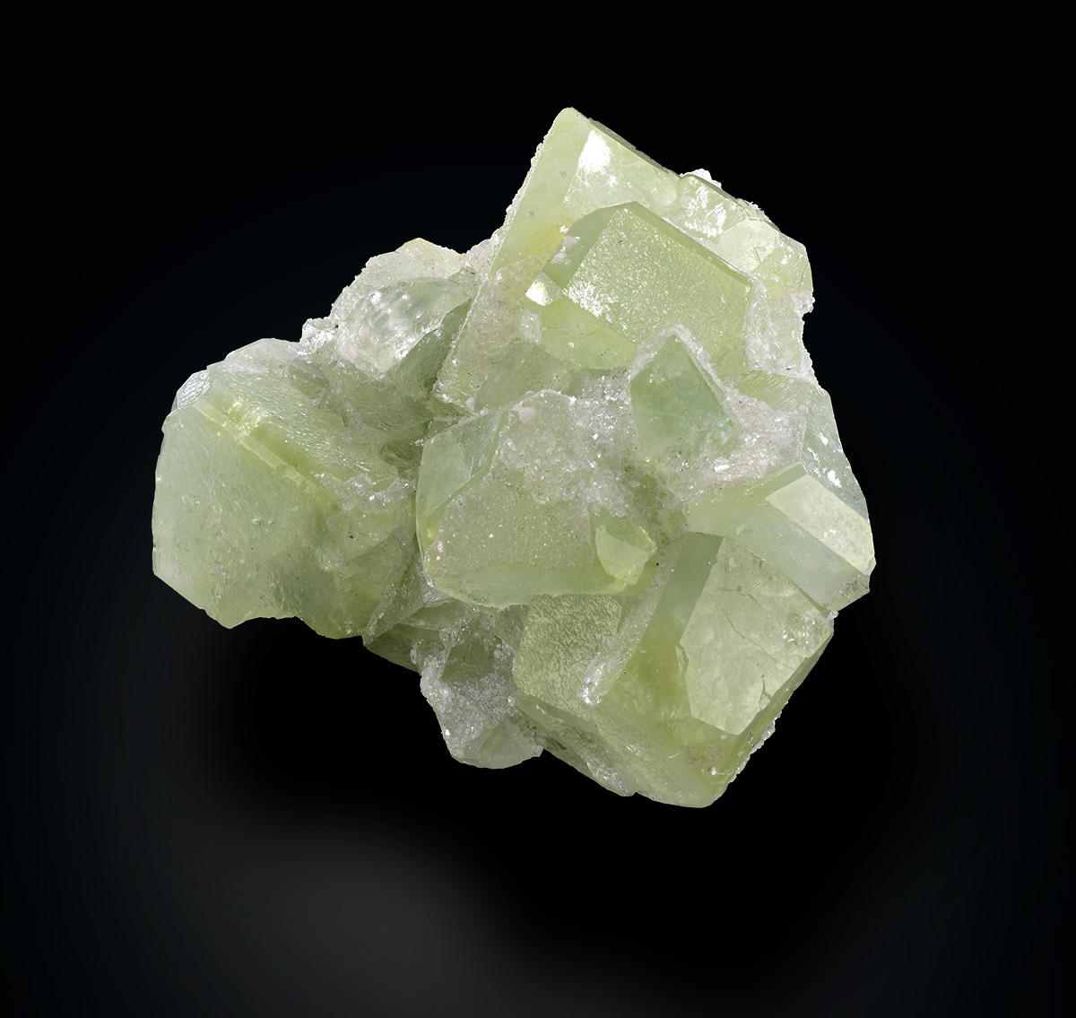 Cluster of glassy, sghaped Datolite xls up to 2,0 cm wide with classi green color that is typical for the specie from this famous localitty, with microcrystal of quartz in association.