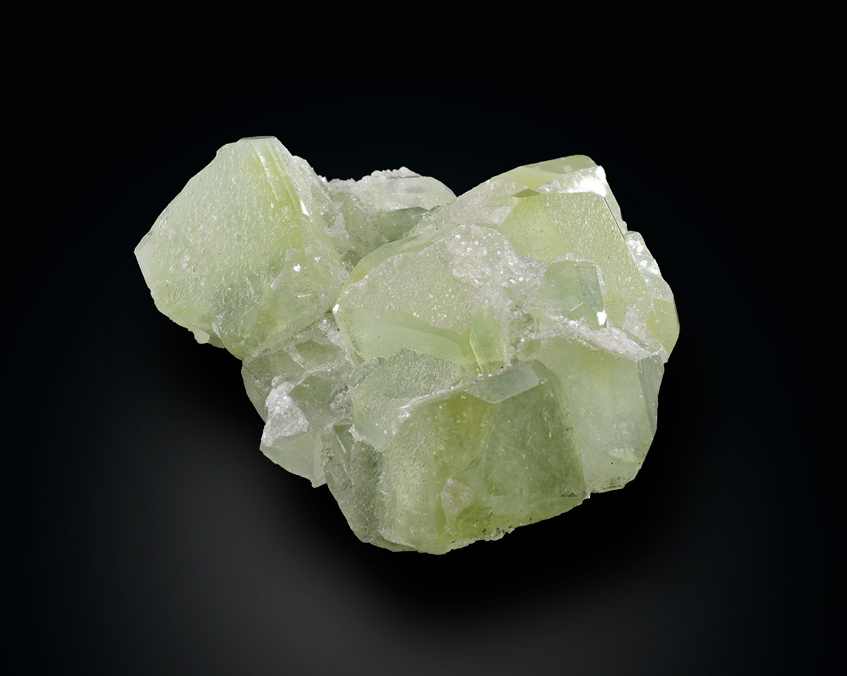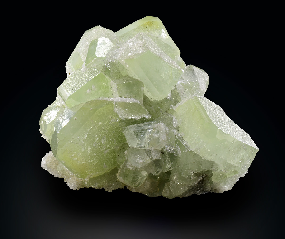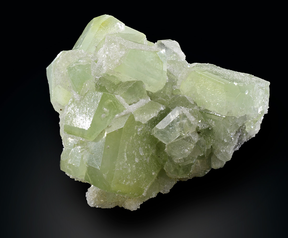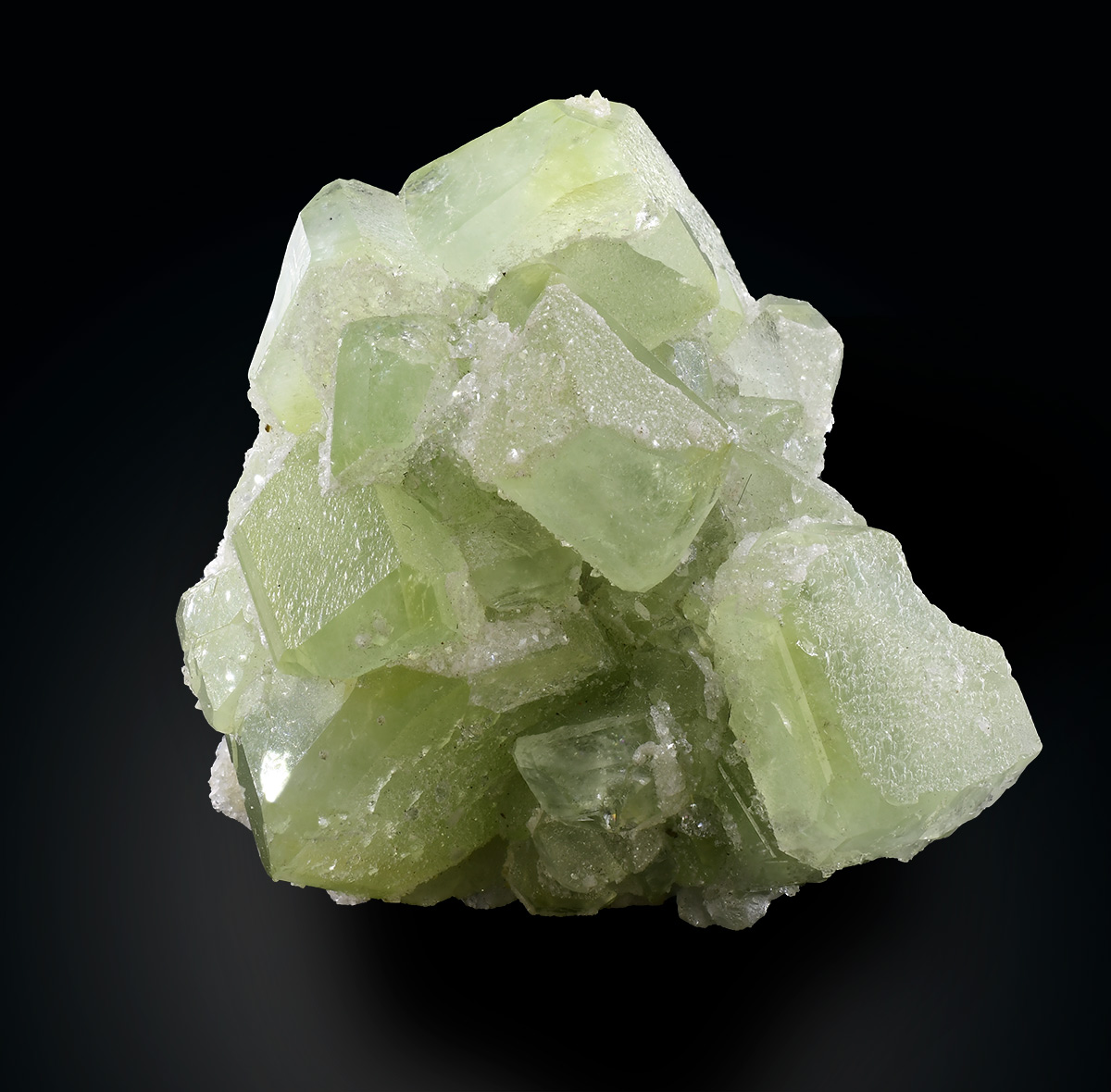 Cluster of glassy, sghaped Datolite xls up to 2,0 cm wide with classi green color that is typical for the specie from this famous localitty, with microcrystal of quartz in association.