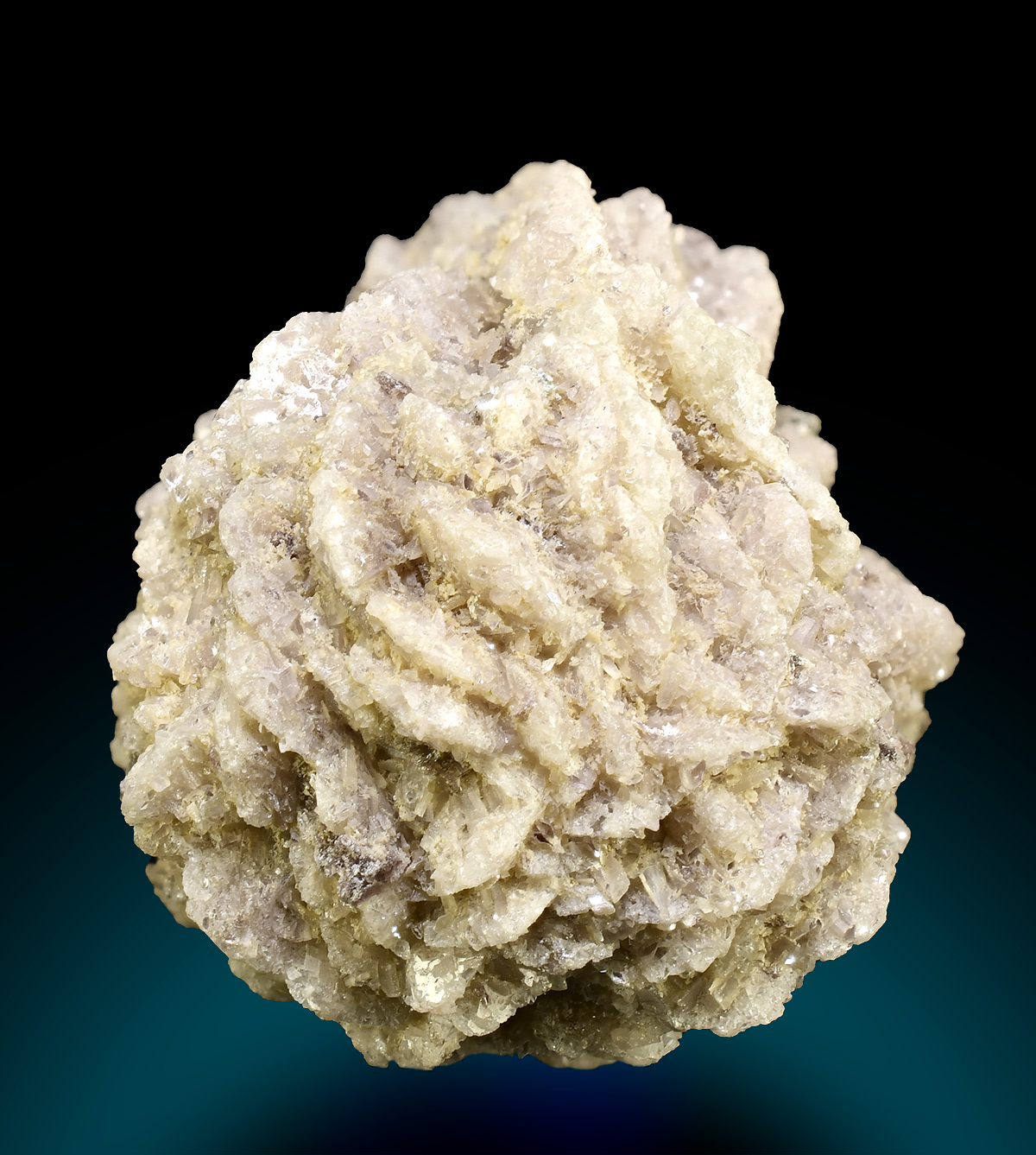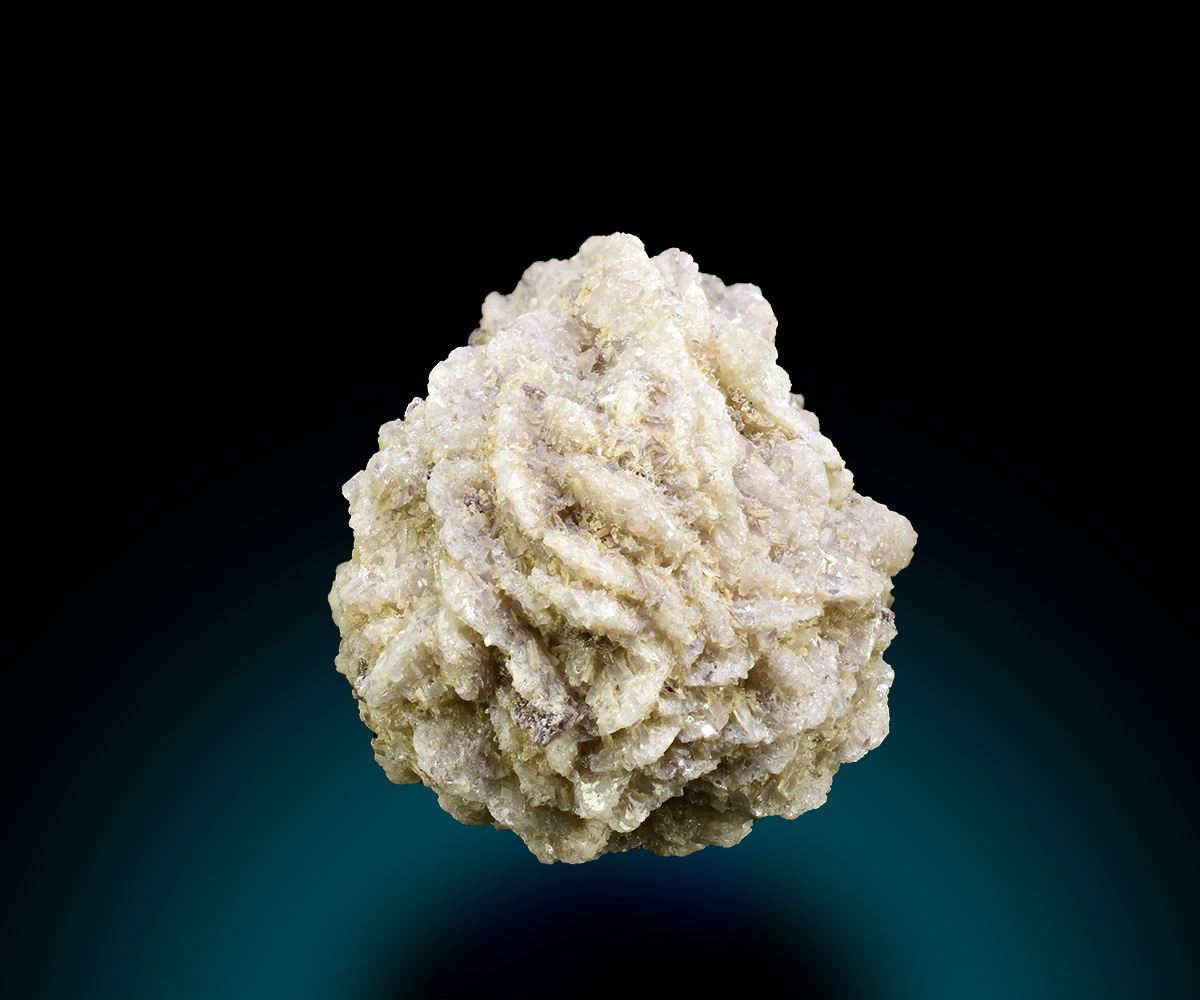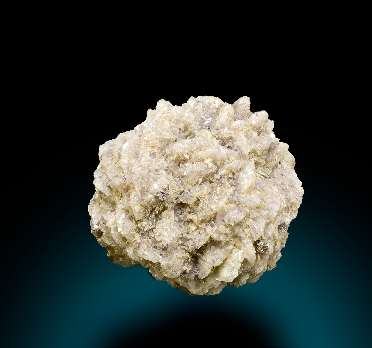 Globular growth, practically spherical, a floater, of platy crystals. The development of the crystals and their luster are excellent for this rare calcium and tin silicate.