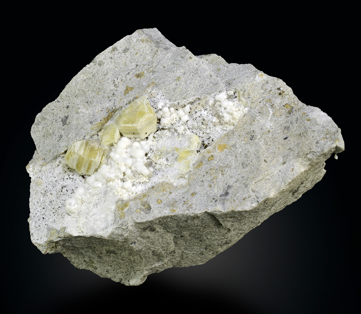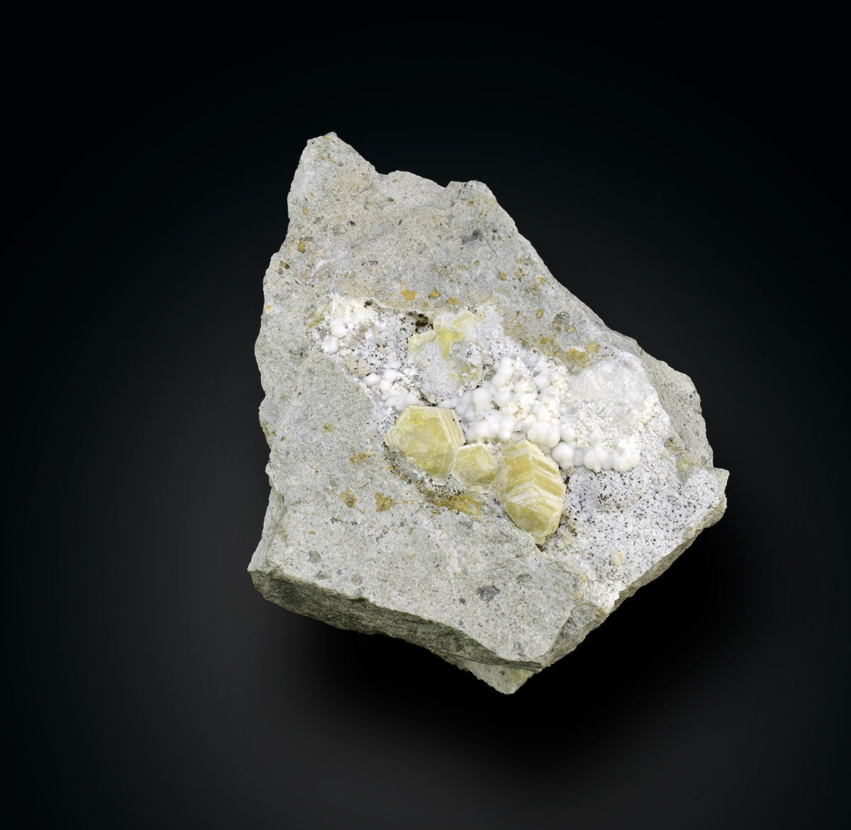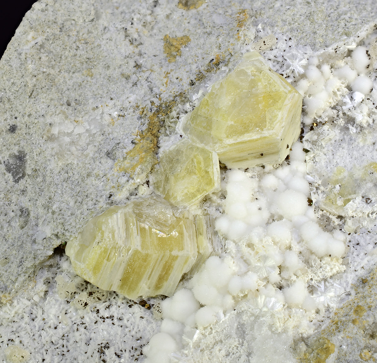 Sharp, bright yellow Weloganite xl up to 9 mm set nicely on matrix with the typical layered prismatic shape with rare white Dresserite crystals in balls up to 3 mm in association set on matrix from the type locality.
