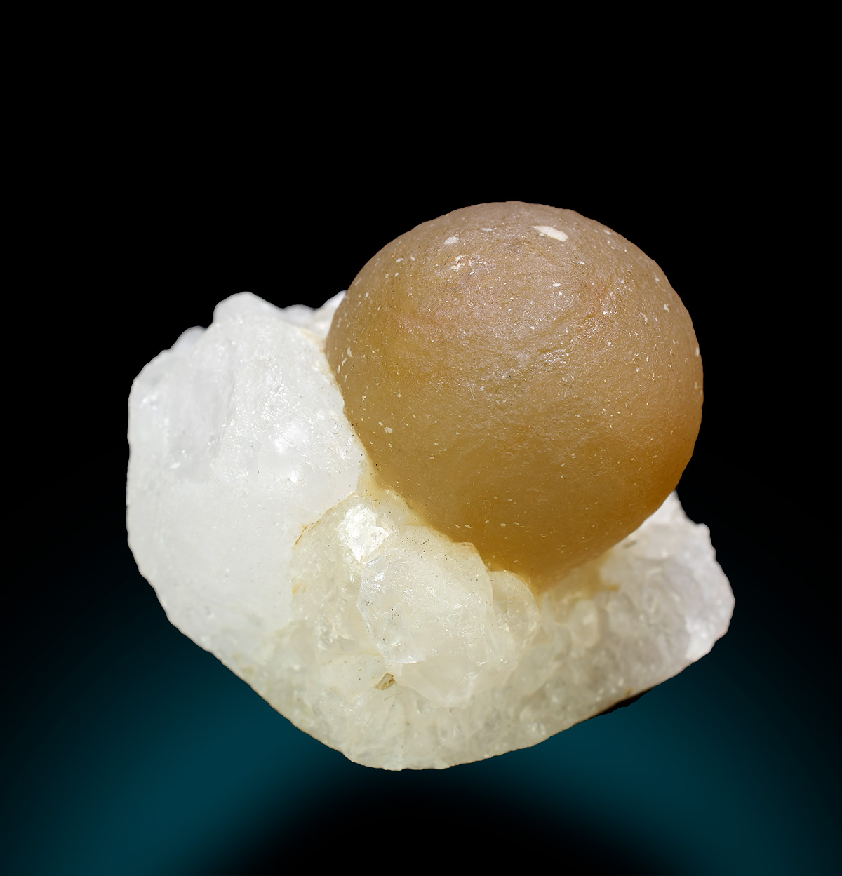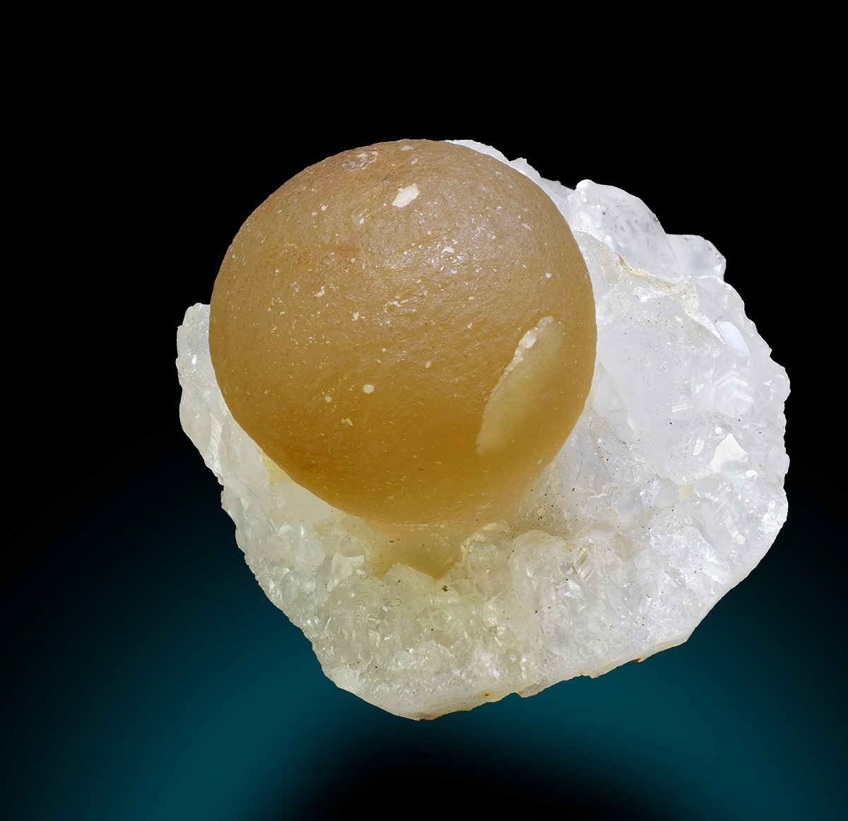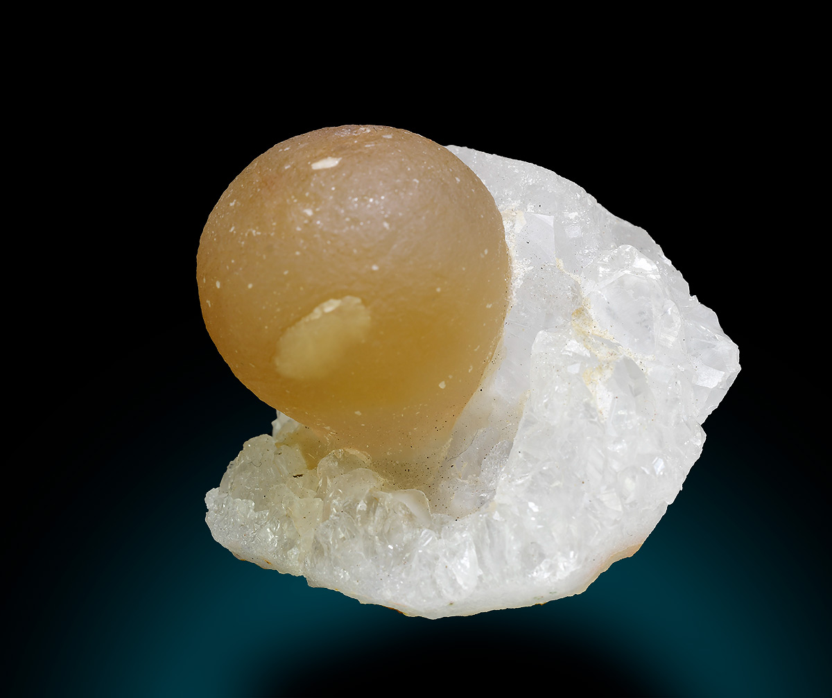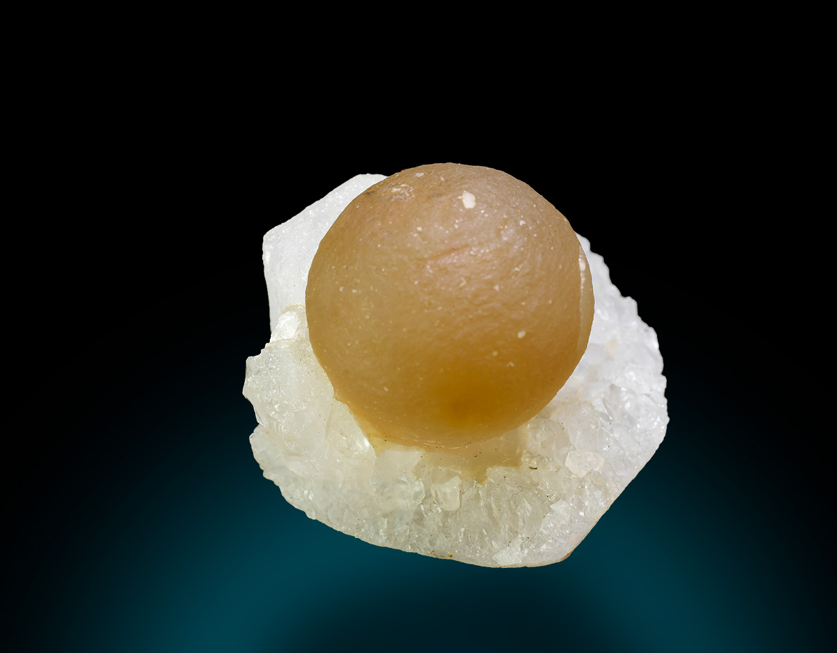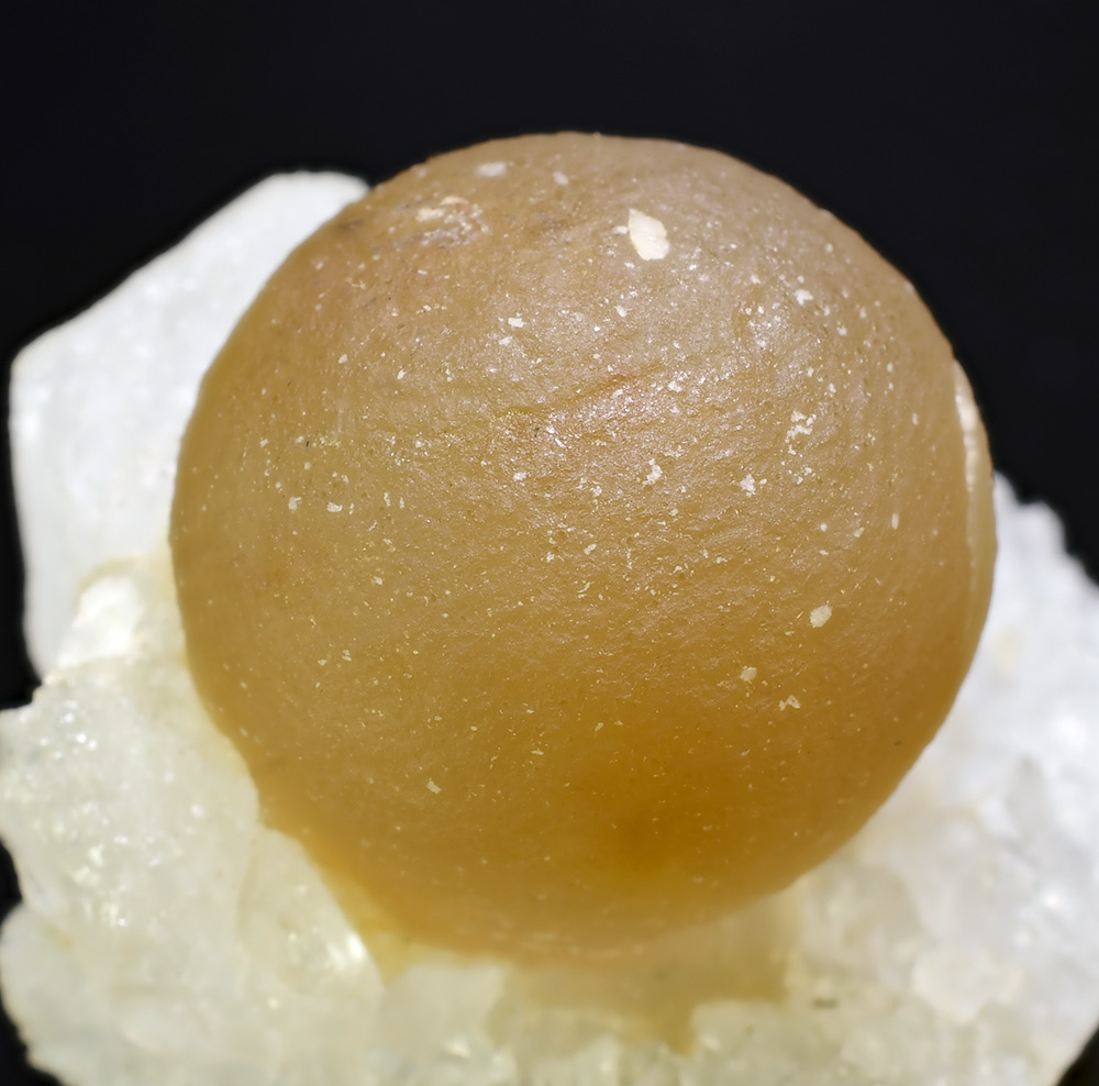 Translucent, yellow fluorite ball 2,2 cm wide aesthetically set on crust of sparkly quartz crystals.