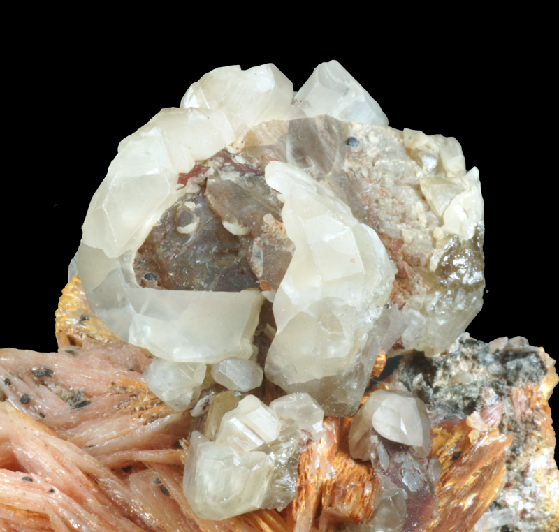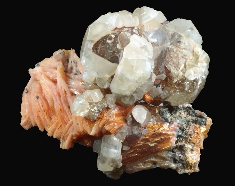 Nice specimen offering transparent cerussite xx and pink baryte blades. Classic combo.