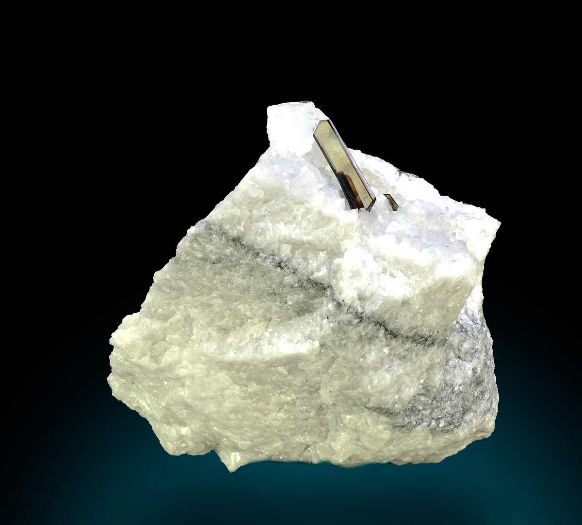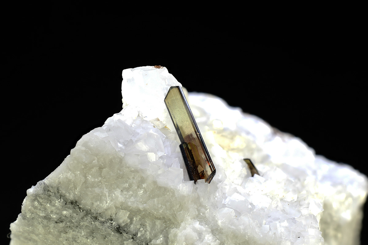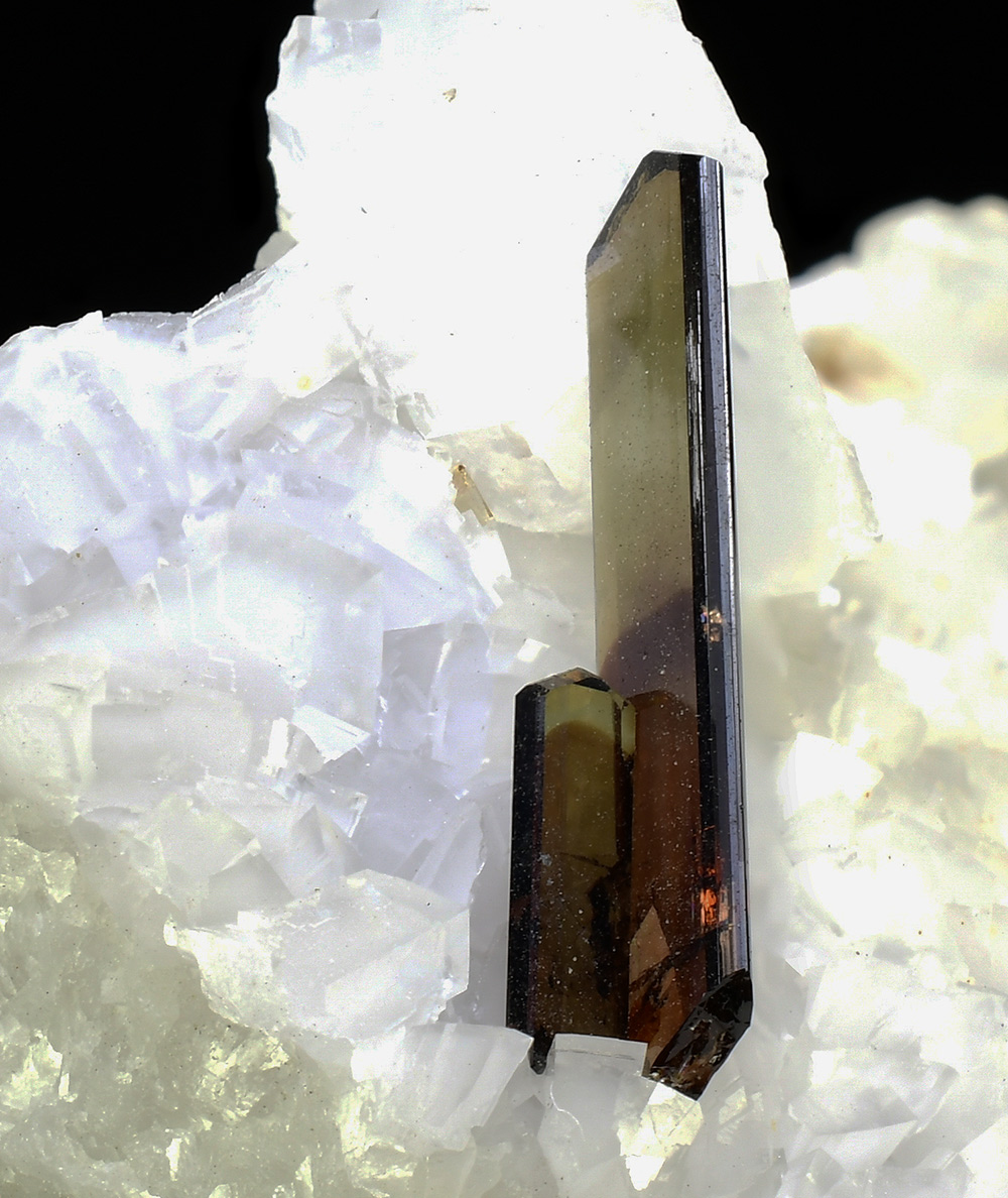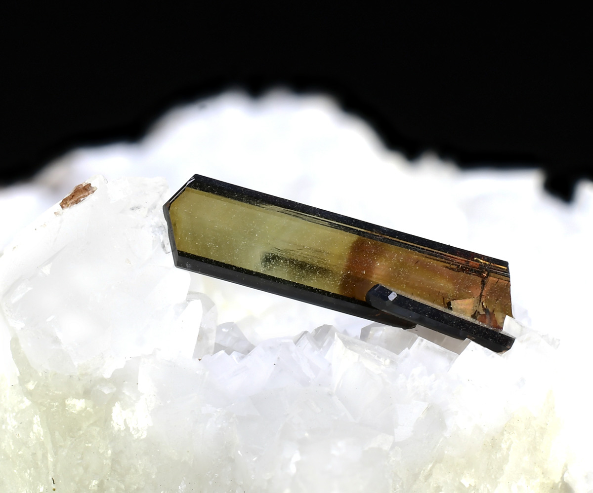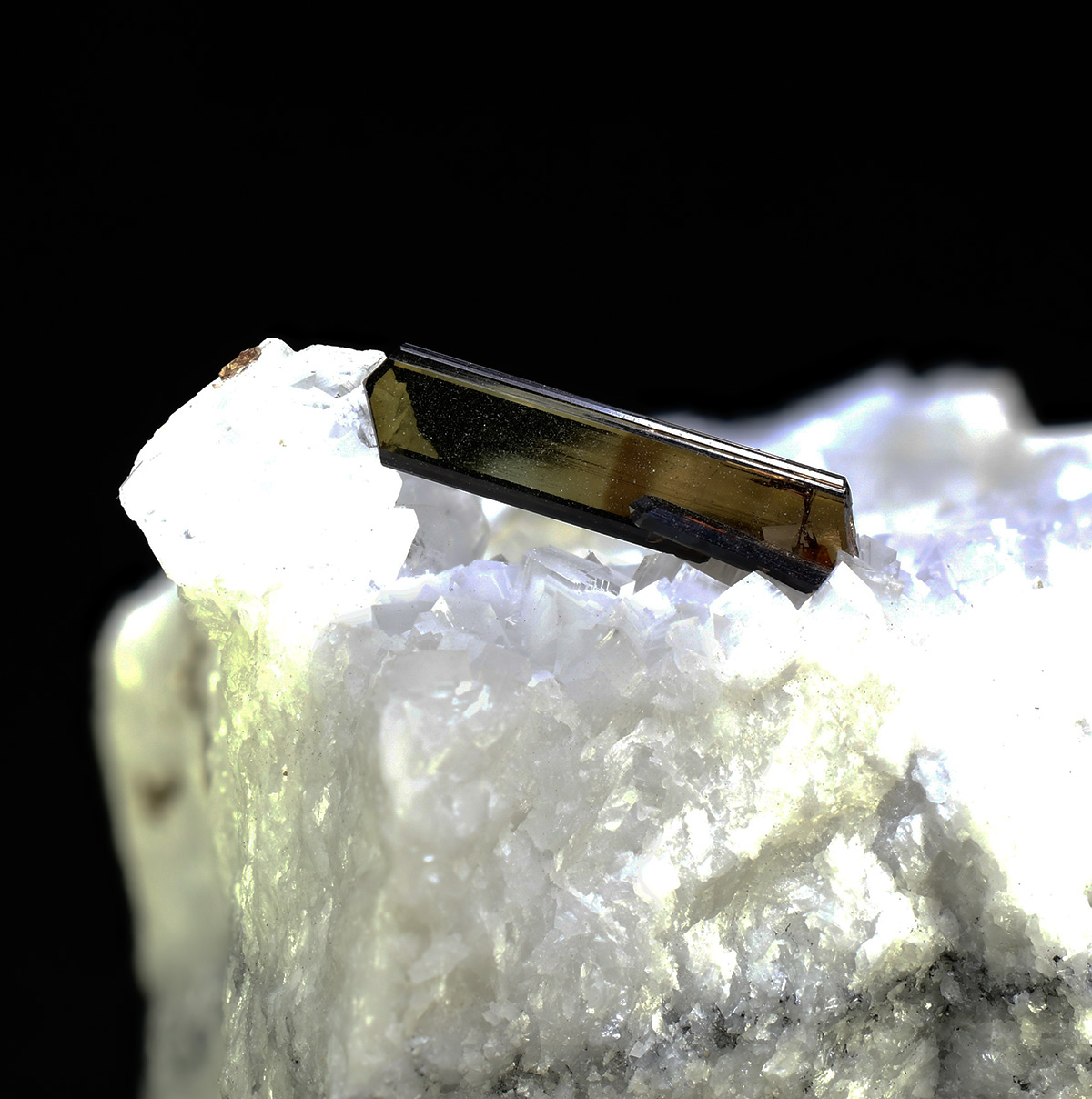 A well shaped 9 mm crystal of this REE , perched in contrasting matrix from this classic locality. All former Allanites-Ce from Trimouns seem to be Dissakisite-Ce.
