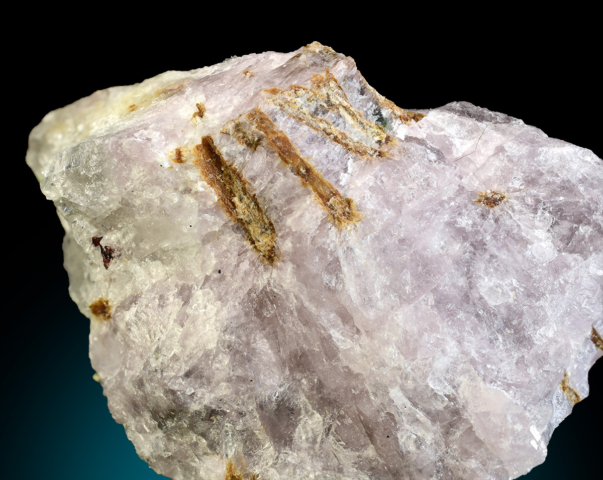 Spray of brown prysmatic crystals of Phosinaite-(Ce) into violet Ussingite matrix.
