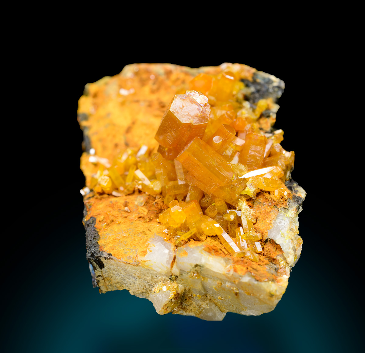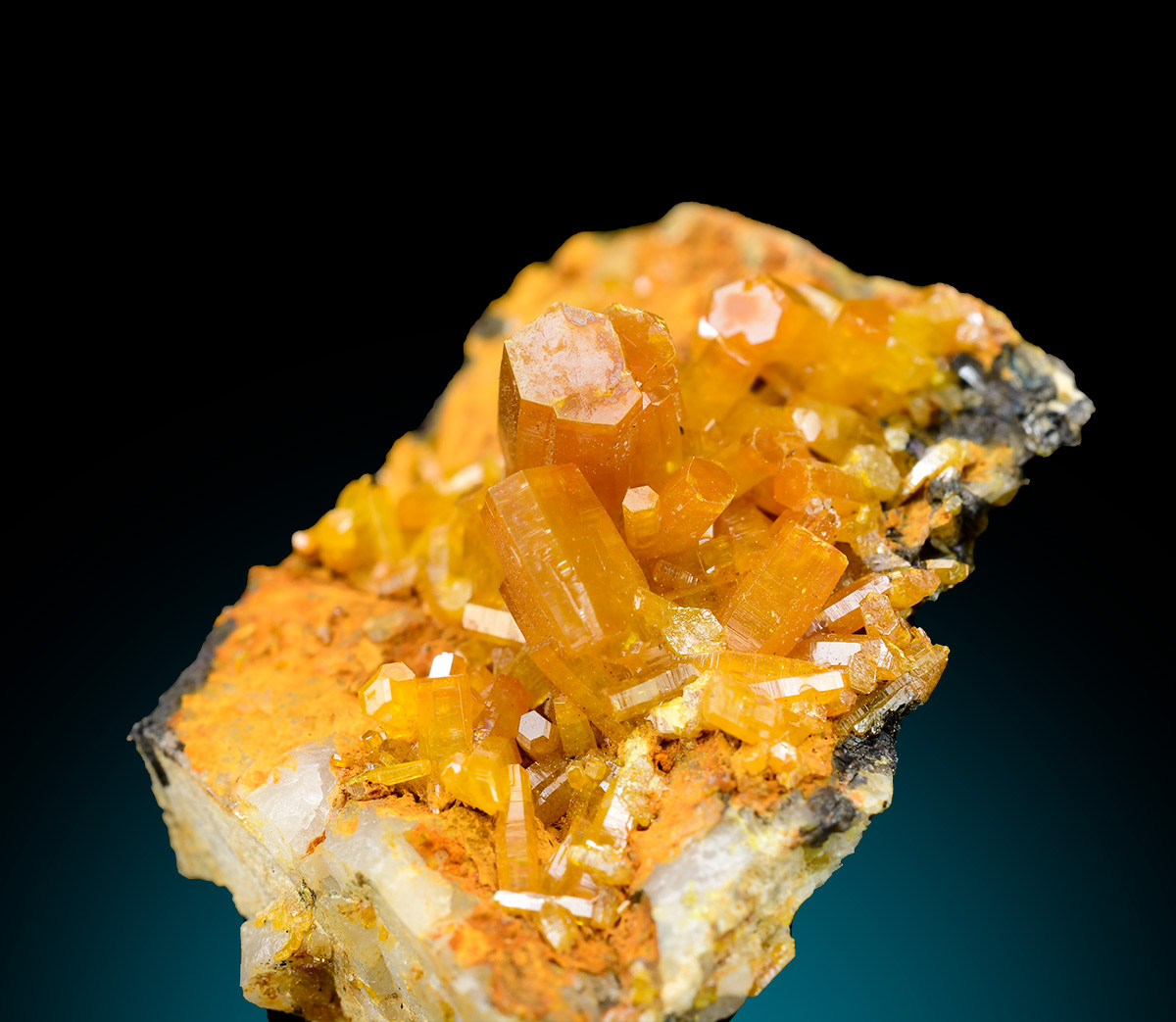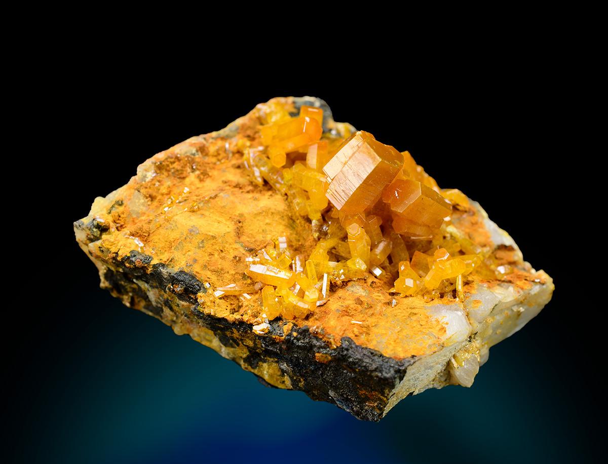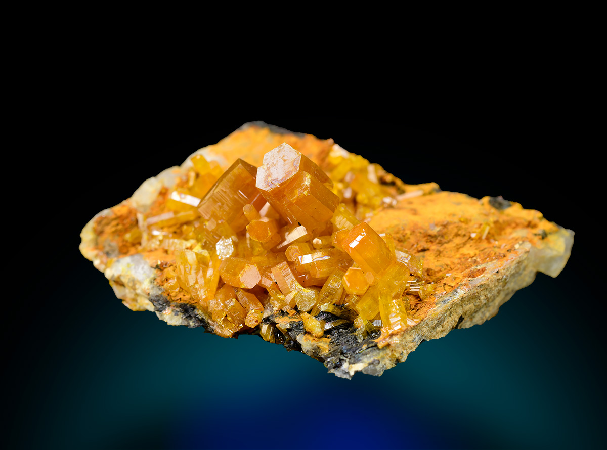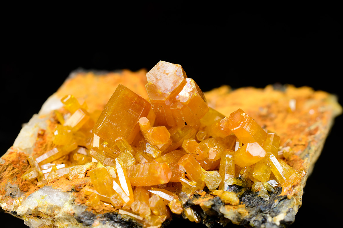 Lustrous, golden-yellow mimetite crystals up to 6 mm richly and aesthetically cover the matrix.