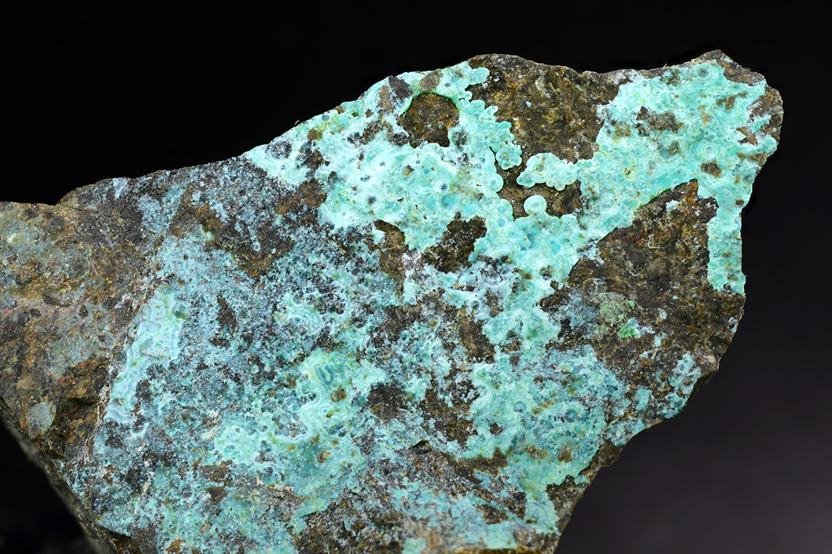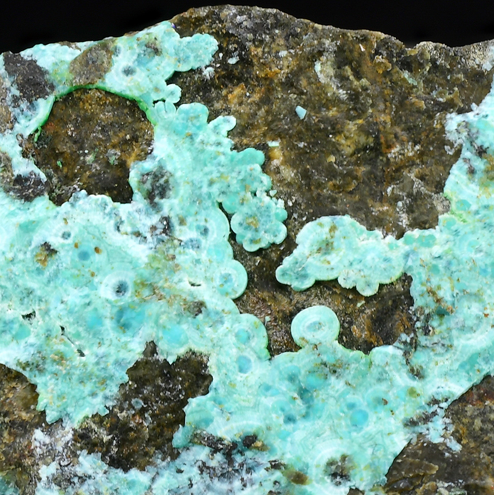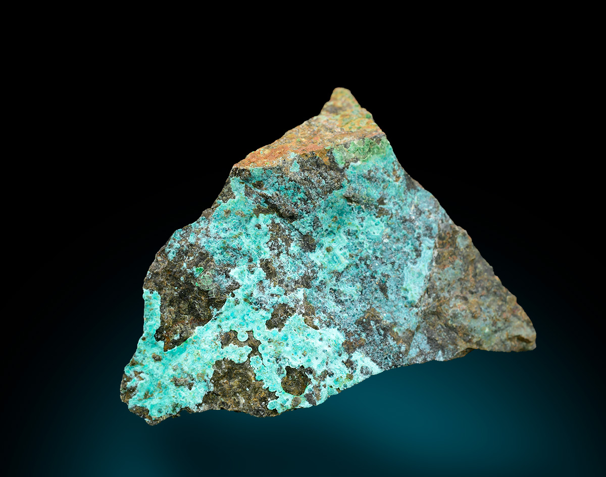 Blue green rare Mcguinnessite up to 1,5 mm scattered on matrix from the type locality with minor vuagnatite in association.