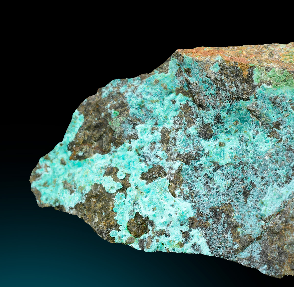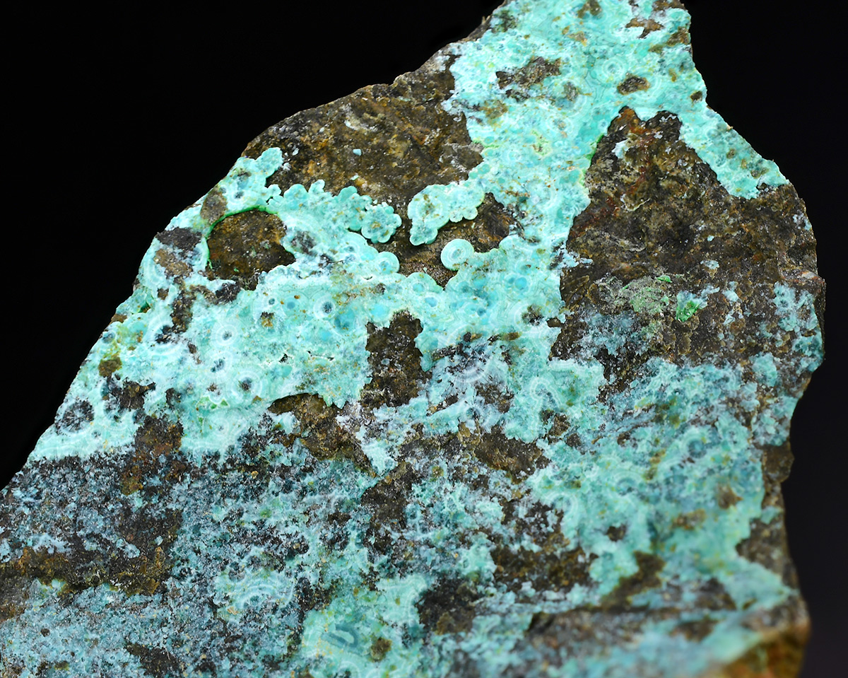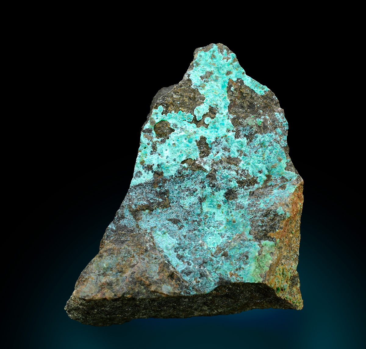 Blue green rare Mcguinnessite up to 1,5 mm scattered on matrix from the type locality with minor vuagnatite in association.