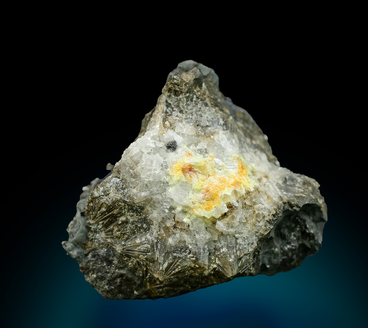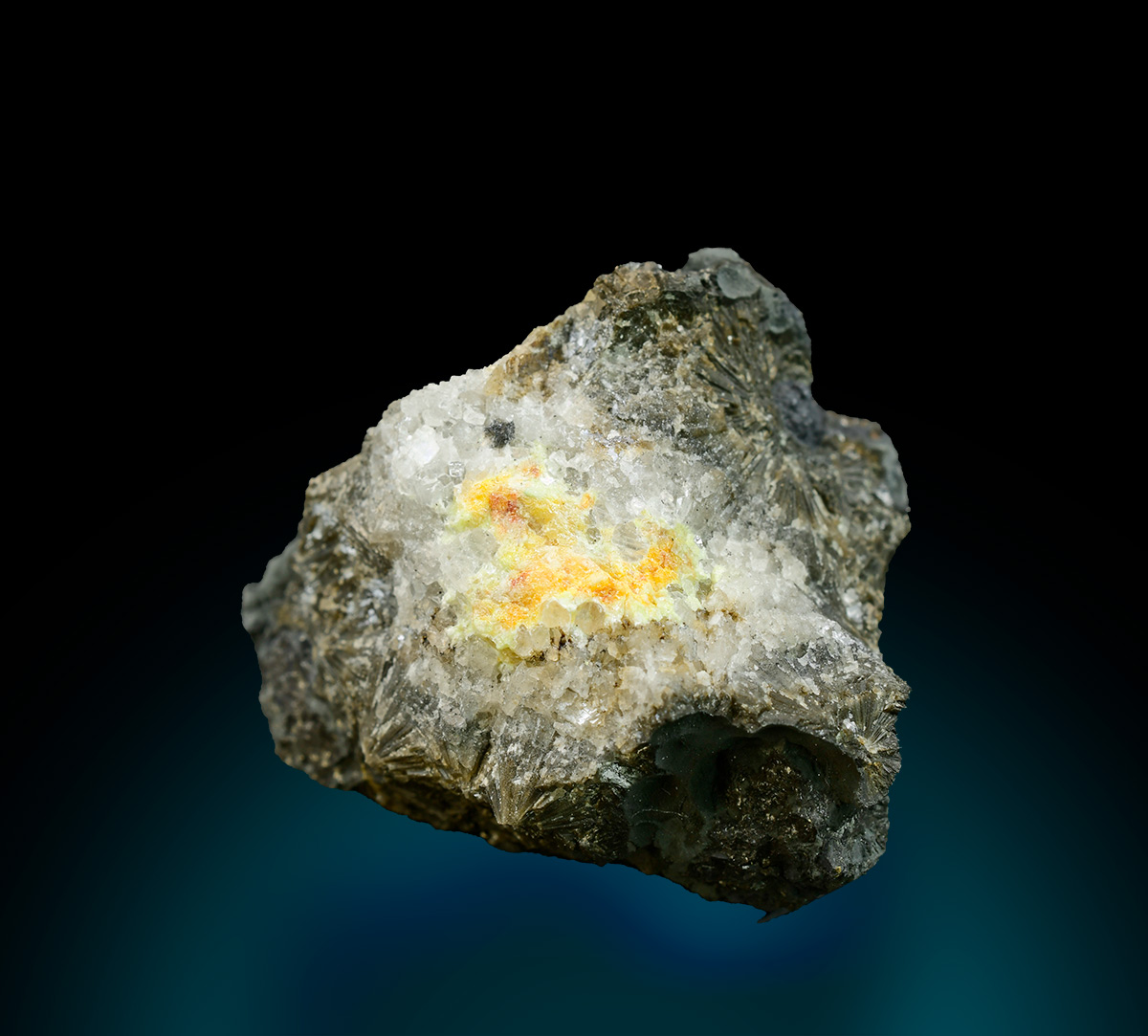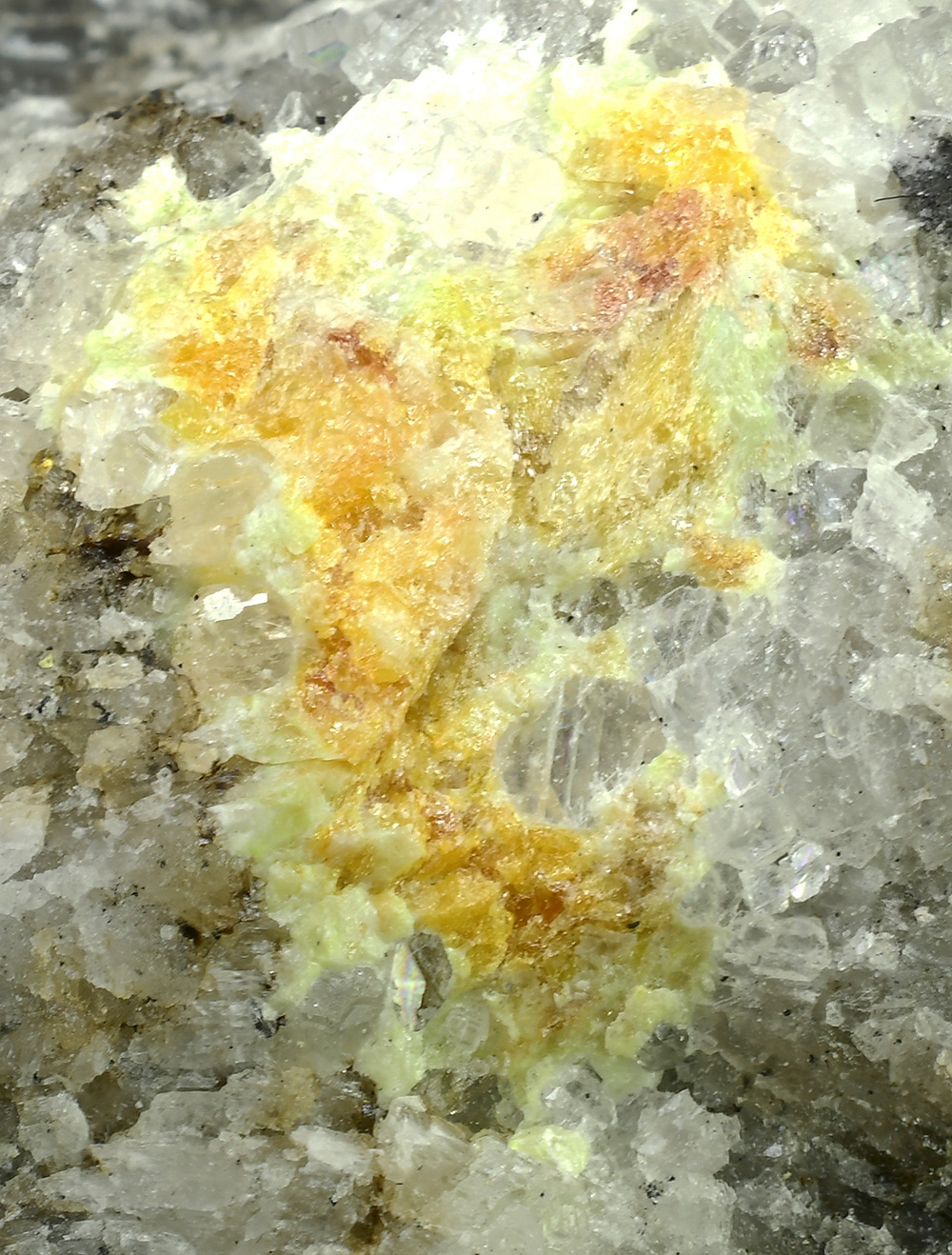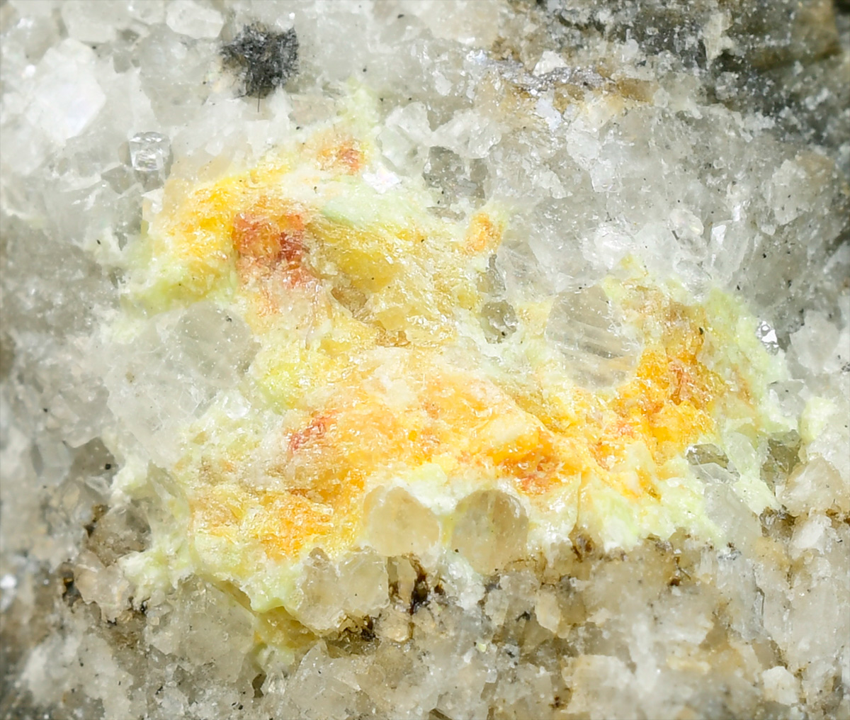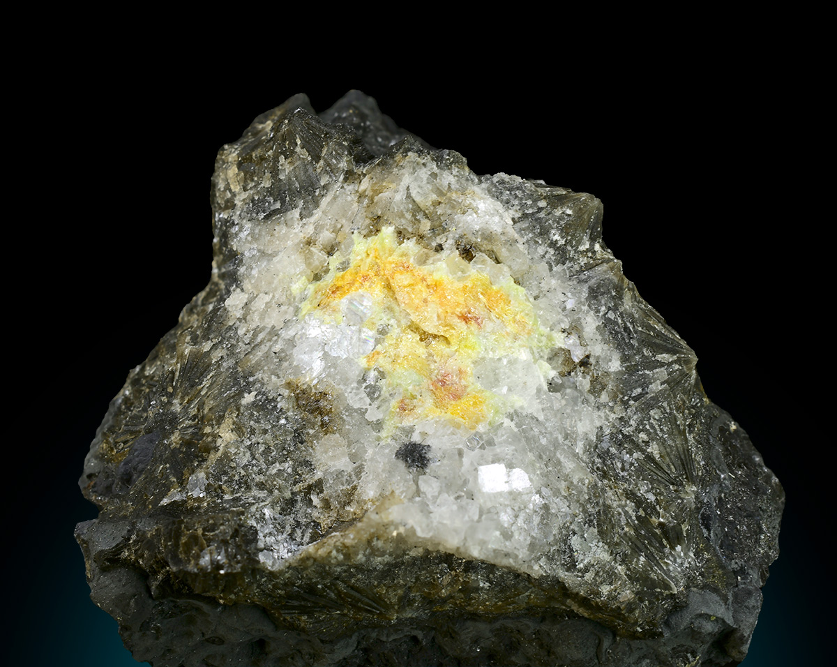 Yellow-orange, vitreous Mereheadite within a veinlet of white calcite cutting a beautifully contrasting black matrix. Rare specimen from the type locality.