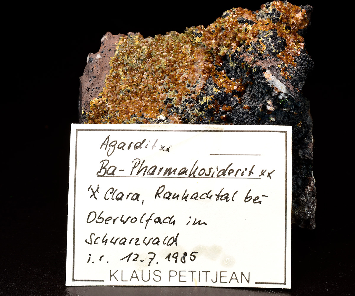 Excellent sample of Bariofarmocaosiderite in clean, lustrous pseudocubic reddish-brown xls, scattered on matrix with agardite in association. Classic german stuff! Former Klaus Petitjean collection, year 1985