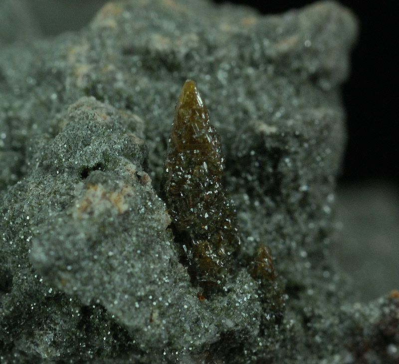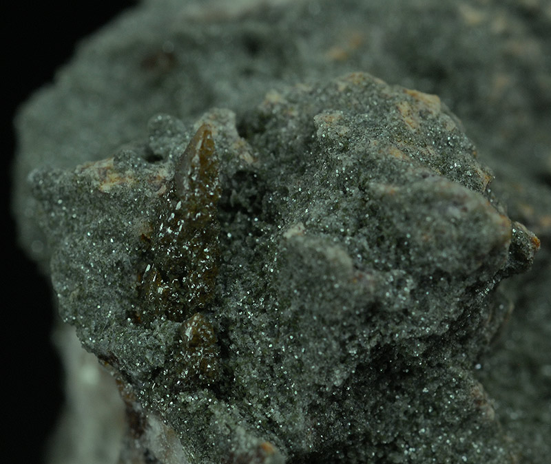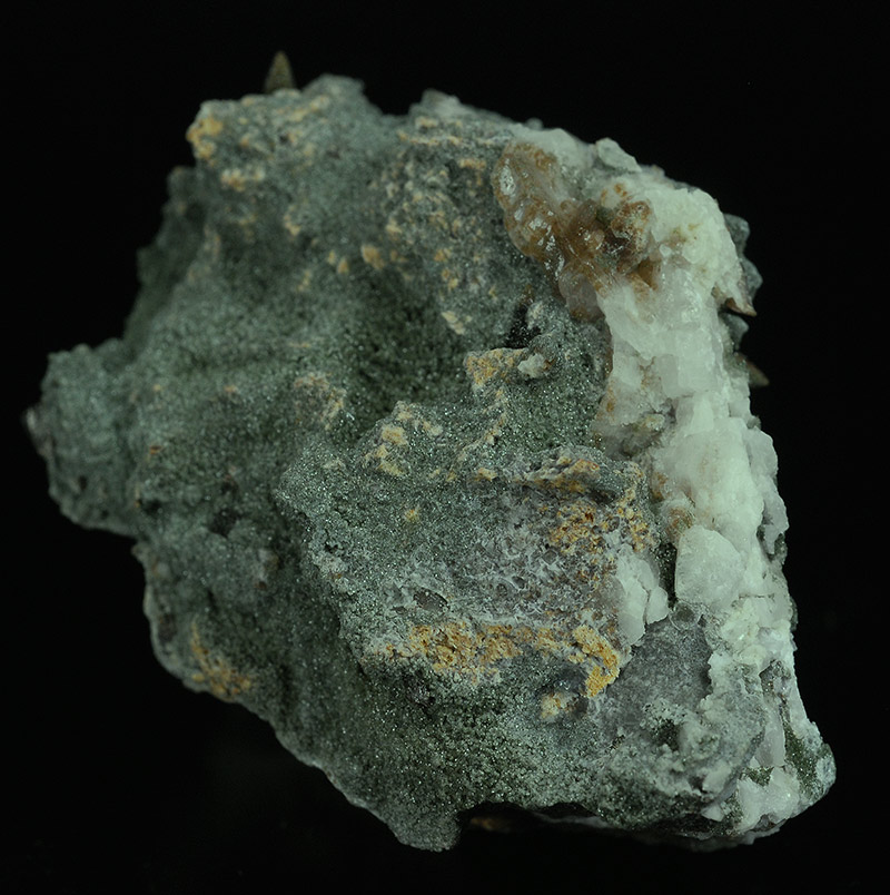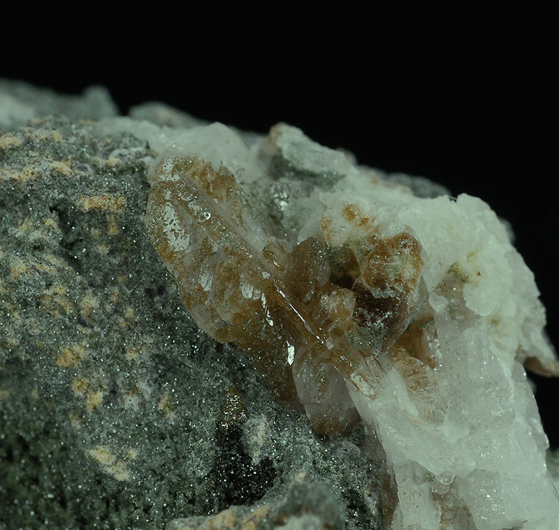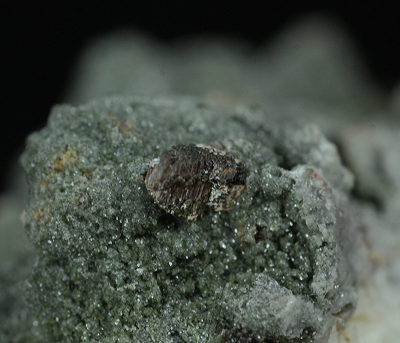 Some brown colored crystals of anatase are seeded over the bulky quartzitic matrix, that is covered by a green chloritic crust.