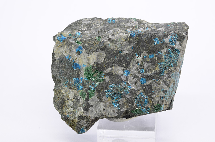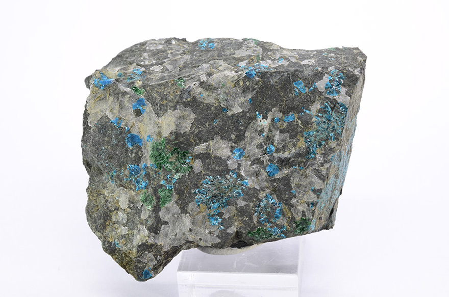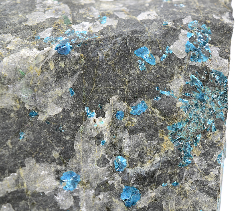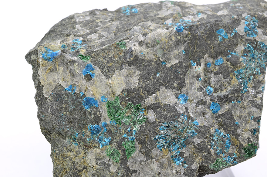 Electric-blue rosettes of sampleite xls up to 2-3 mm with green atacamite on matrix.