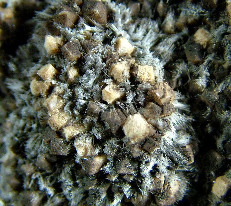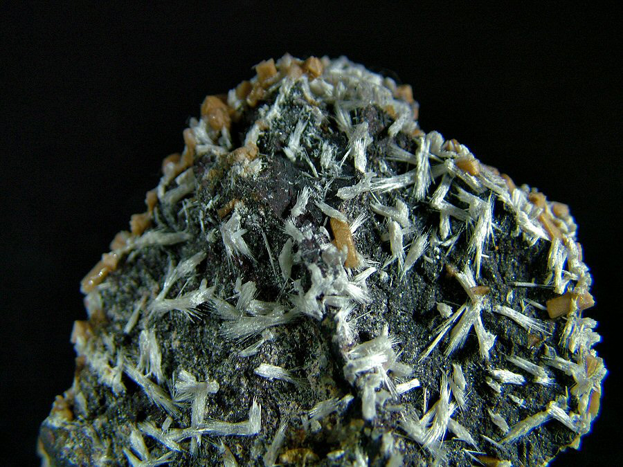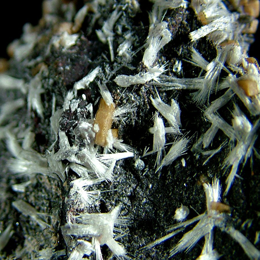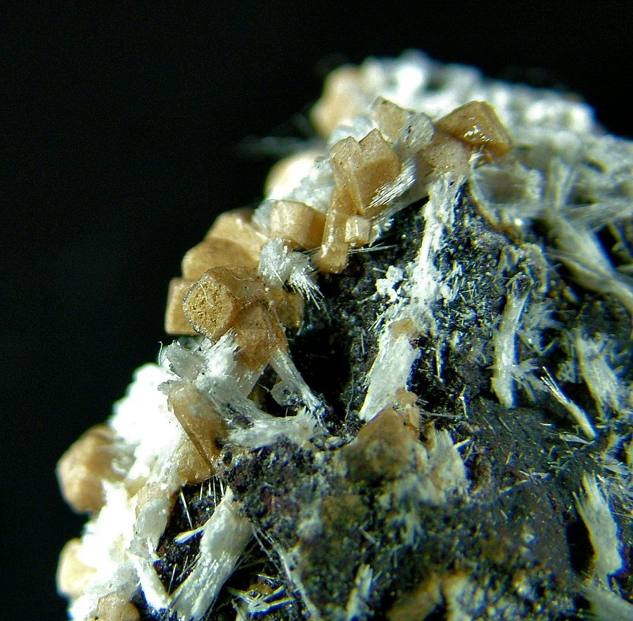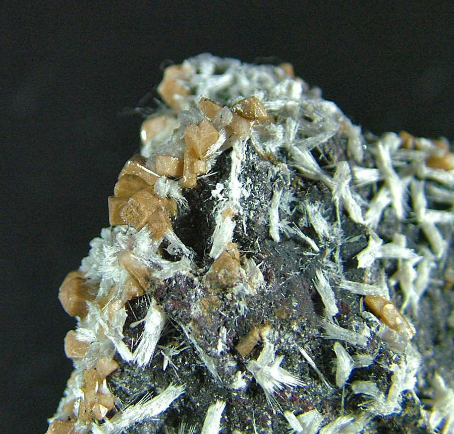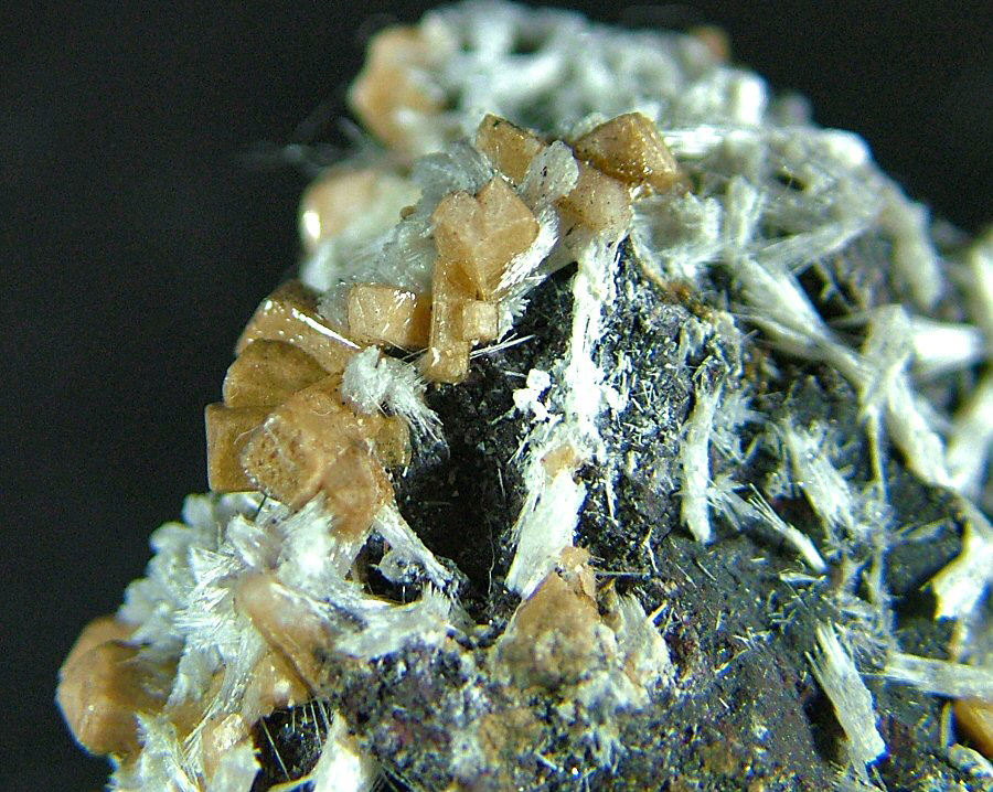 Silky tufts of Bultfonteinite up to 8 mm cover a side of the sample, accompanied by beige little Olmiite's crystals that are prevailing on the opposite side. Rare mineral, difficult to find on the market.