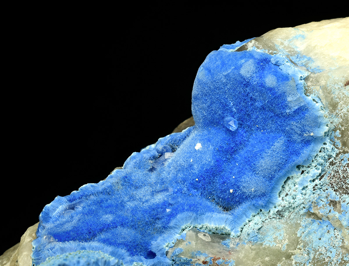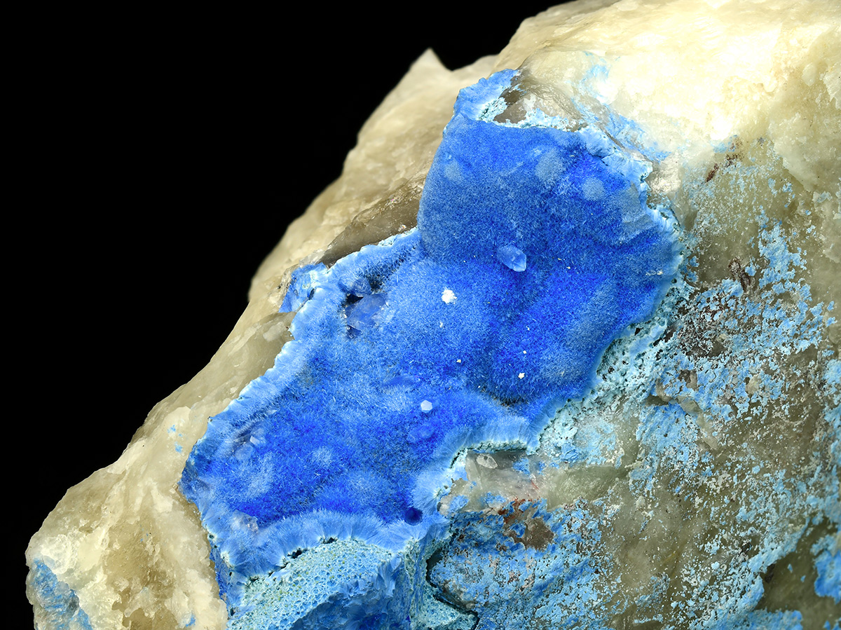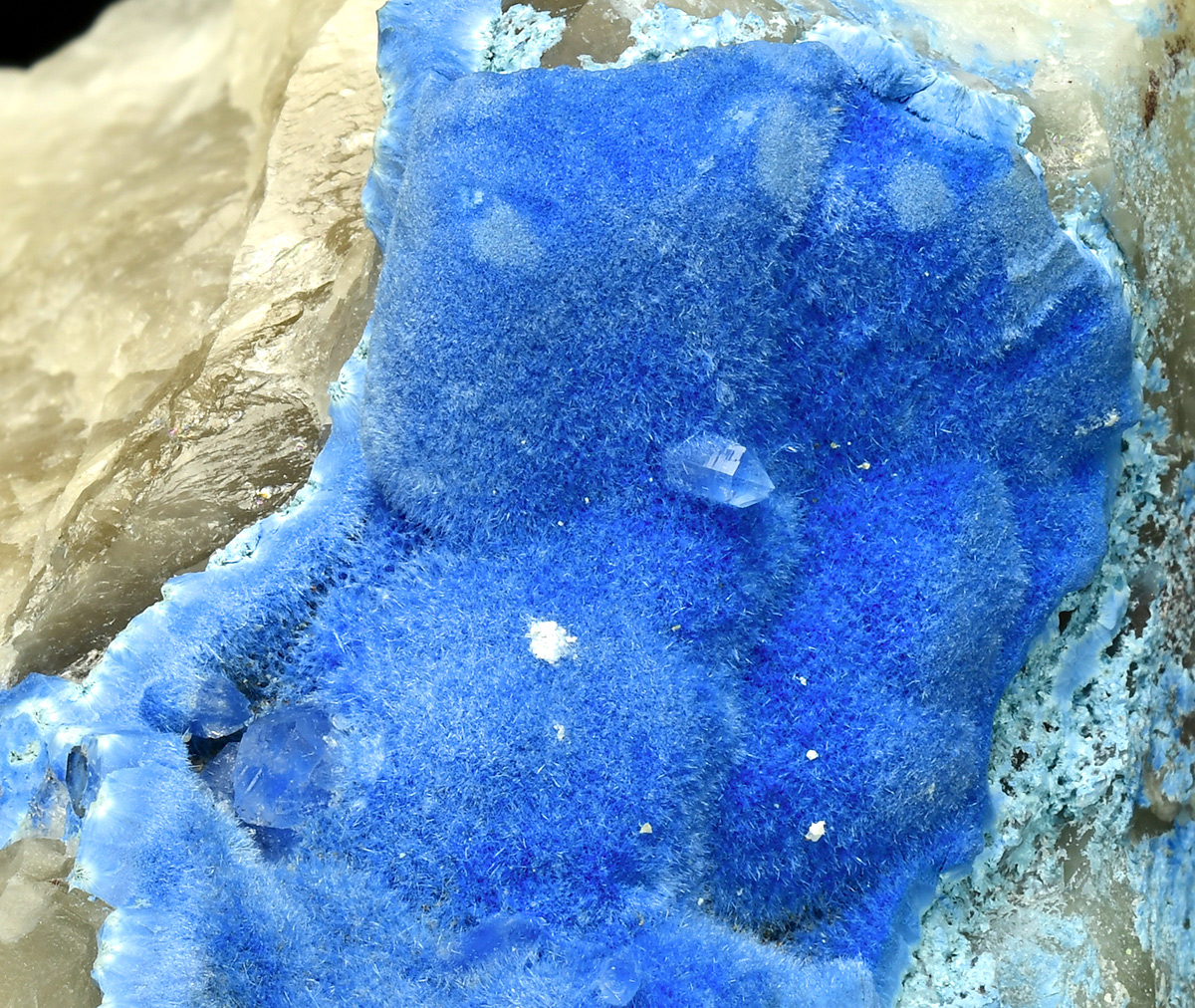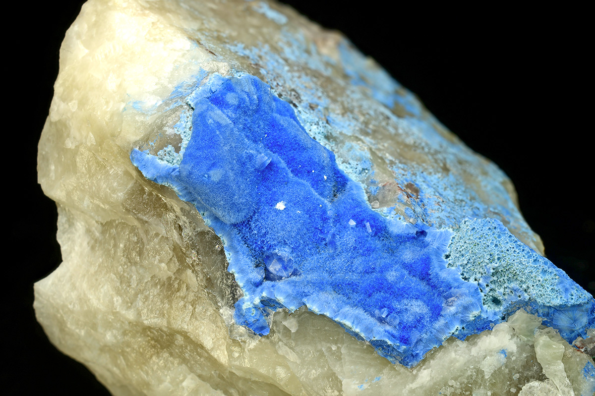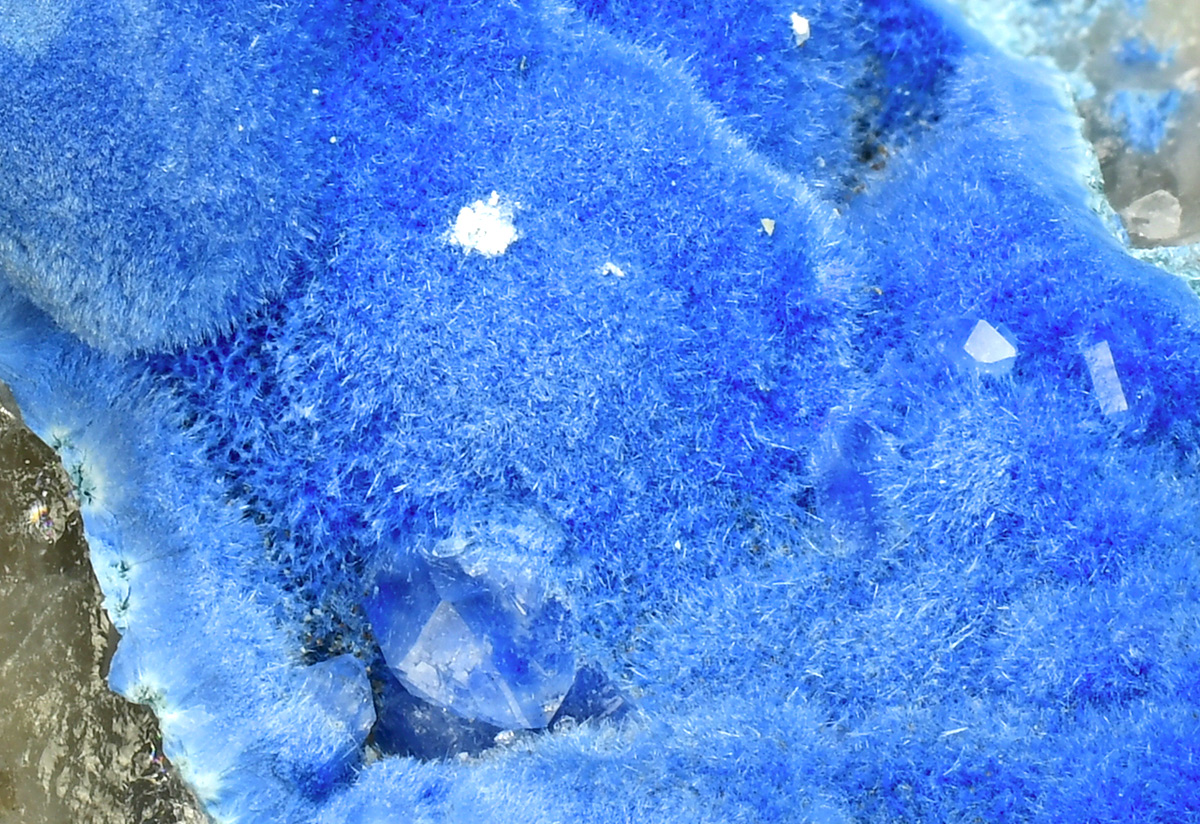 Deep blue needles of Shattuckite on quartz contrasting matrix.