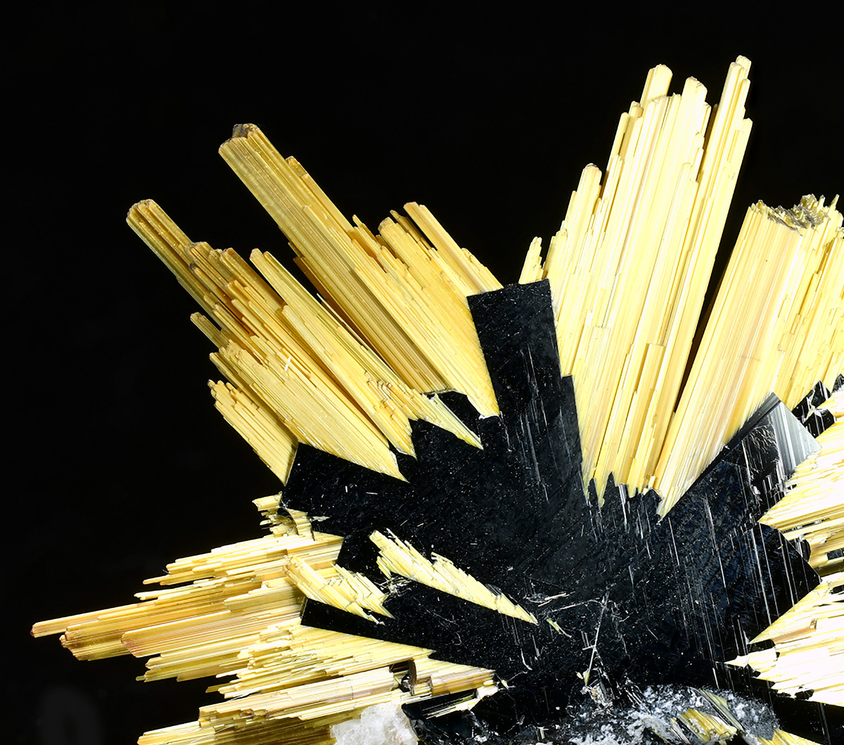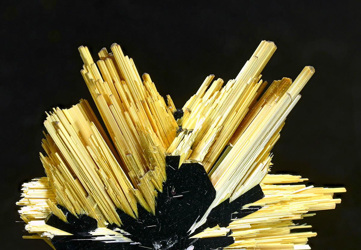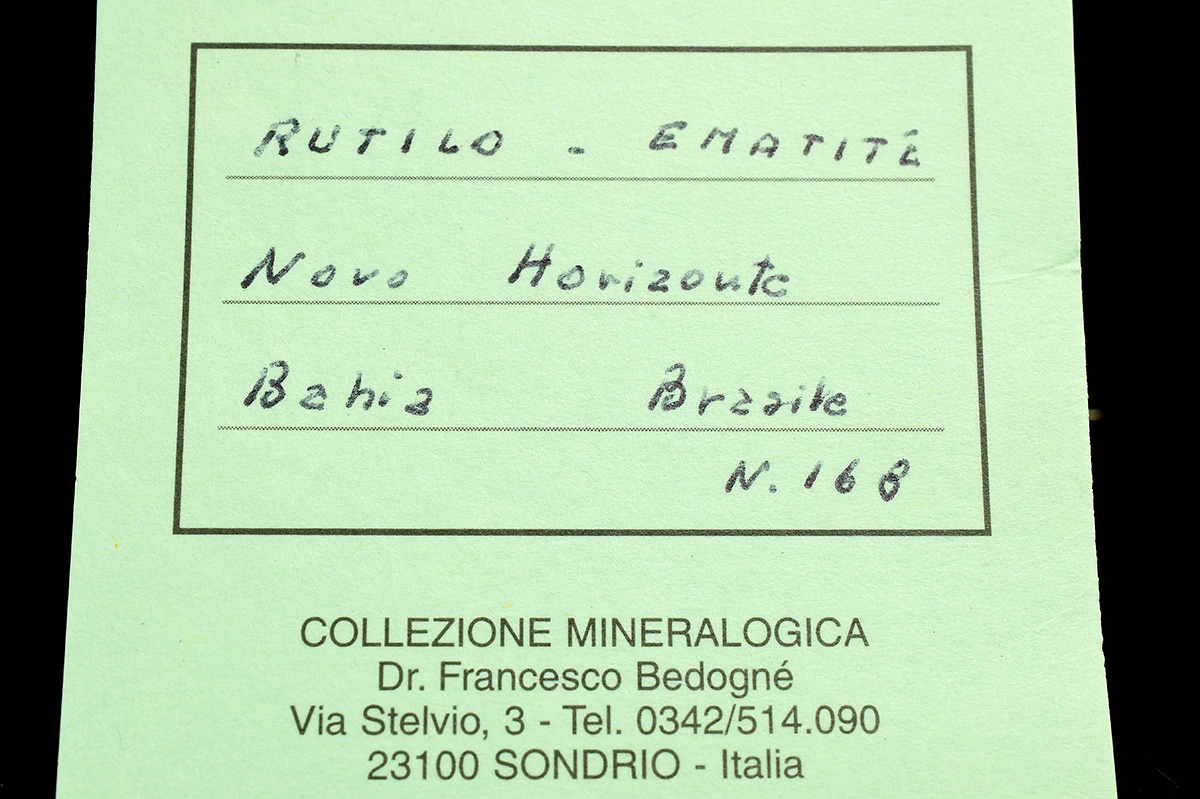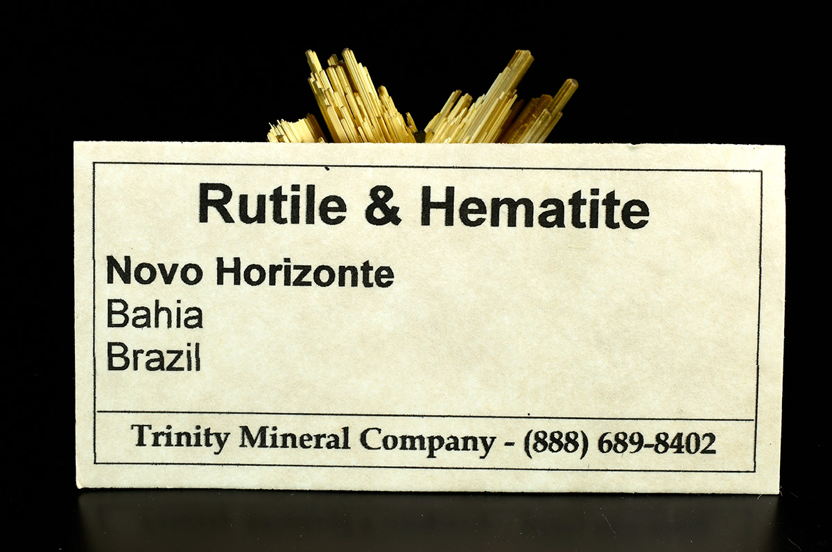 Specimen with golden rutile needle in "six star" formation up to 2,0 cm wide sticking up off shiny central hematite crystals .Really showy.