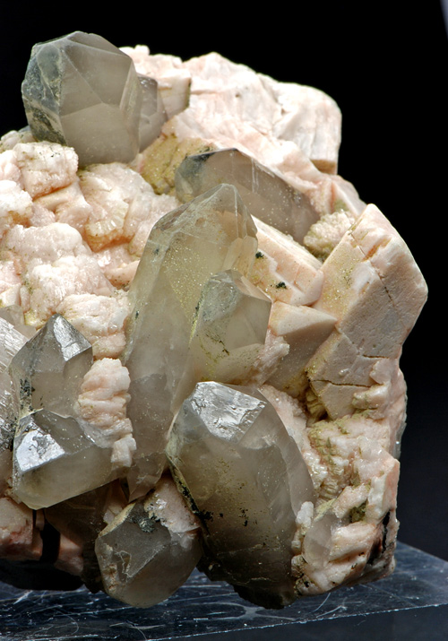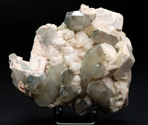 Classic cluster featuring several prismatic xls of Quartz, slightly smoky, set upon a bed of pinkish xls of Orthoclase and of Albite.