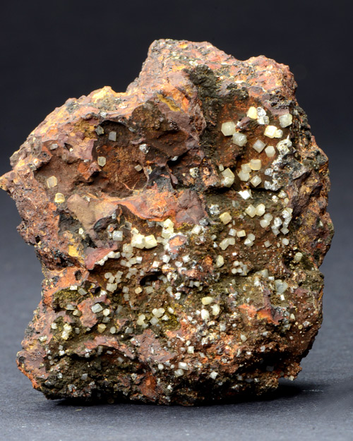 Specimen hosting several individual hexagonal prisms of Mimetite on gossan matrix, from a classic italian locale. All the specimens from there belong to past findings, as in this case (specimen coming from a collection assembled during the 60-70's, with label).