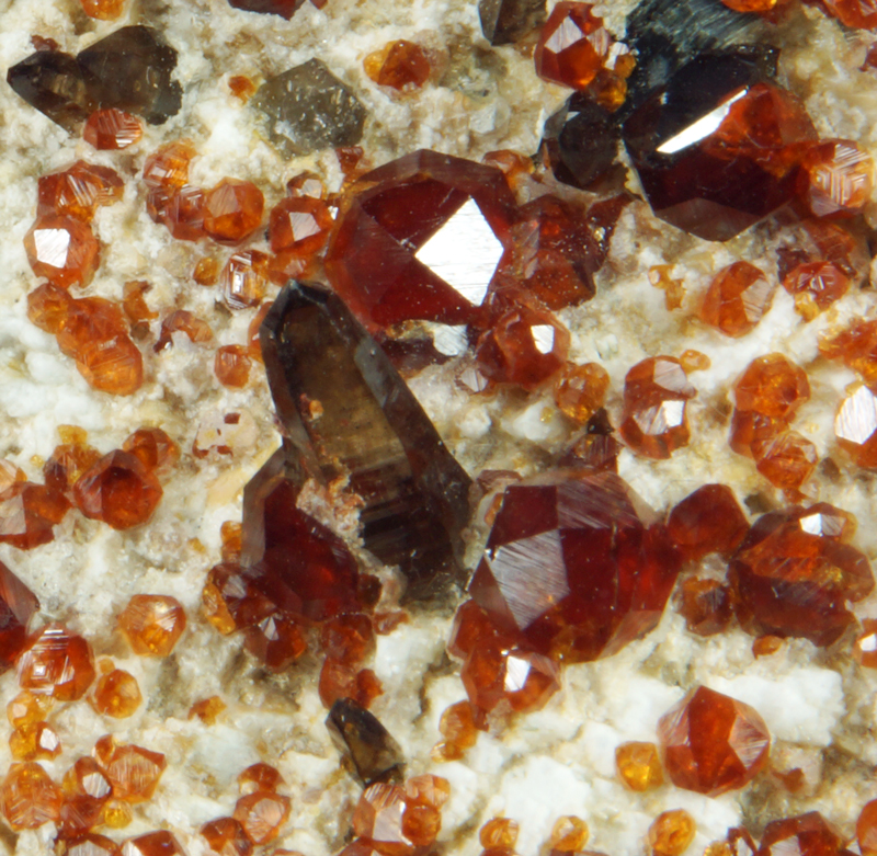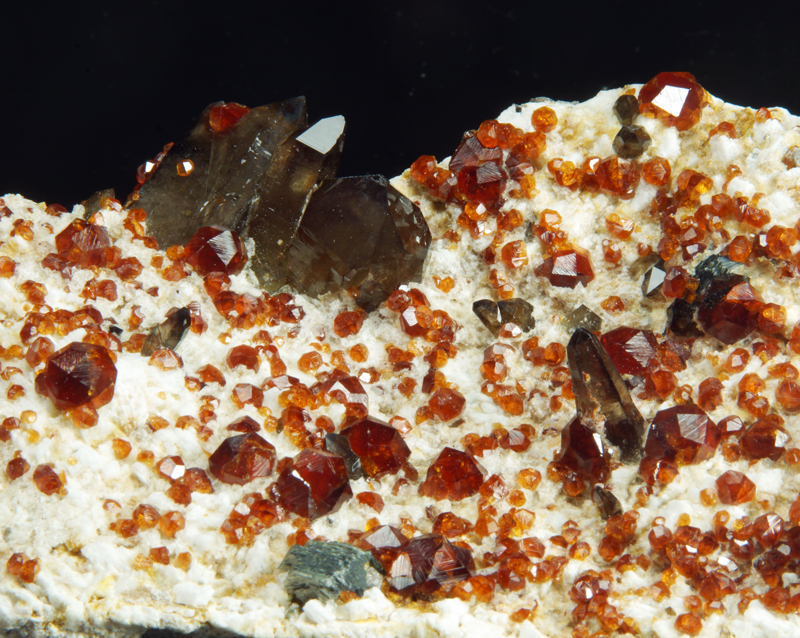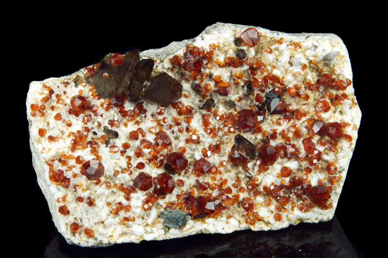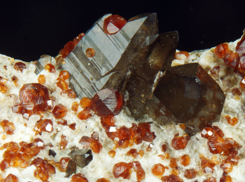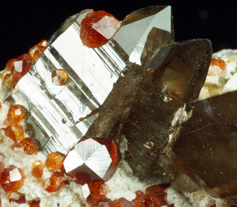 Super combo offering splendid blood red spessartine xls with smoky quartz crystals.