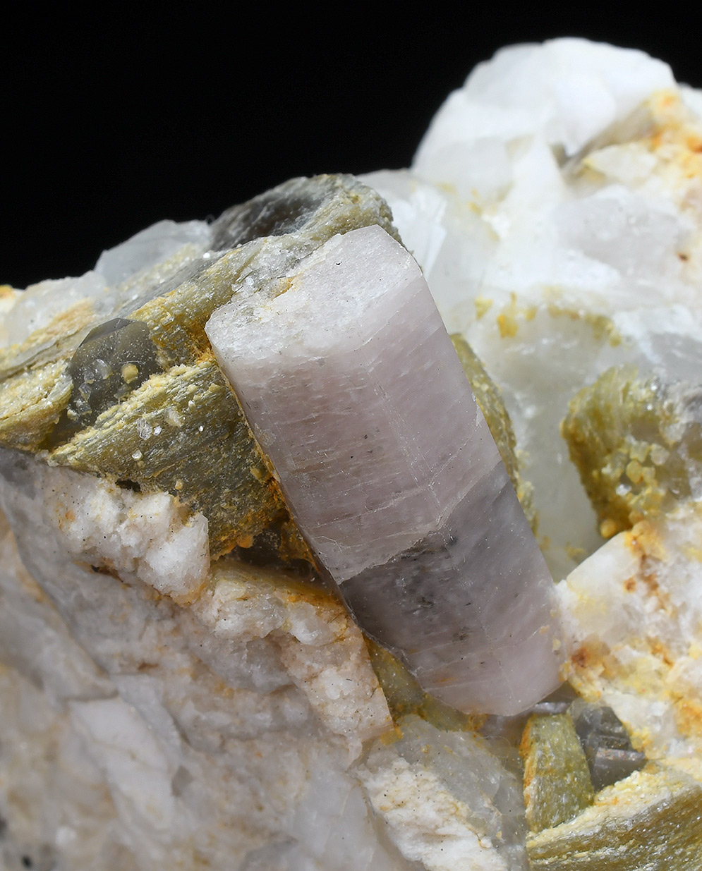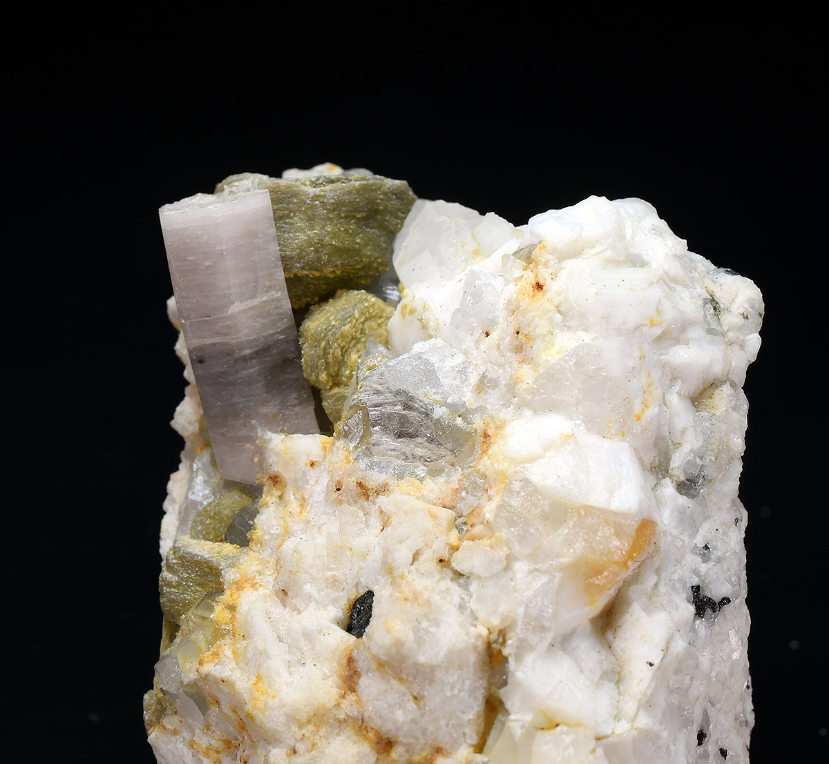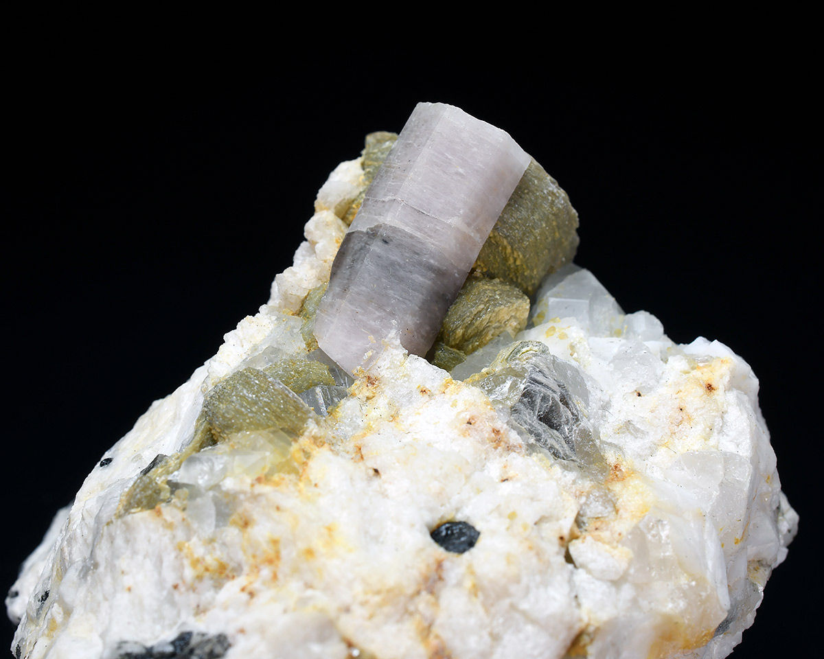 Fully terminated pinkish Apatite crystal 2,4 cm tall set on pegmatite matrix with muscovite in association.