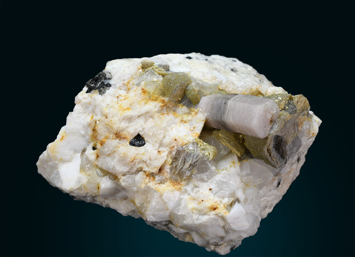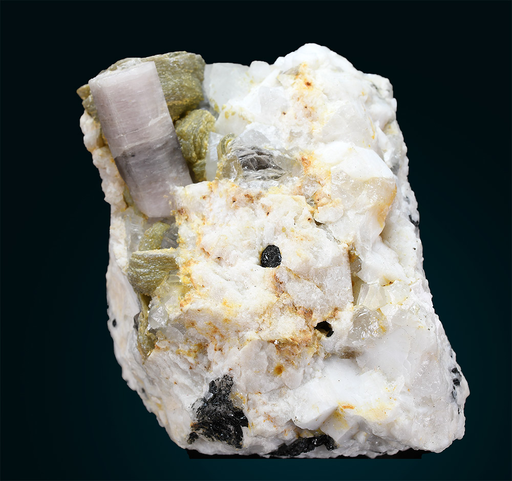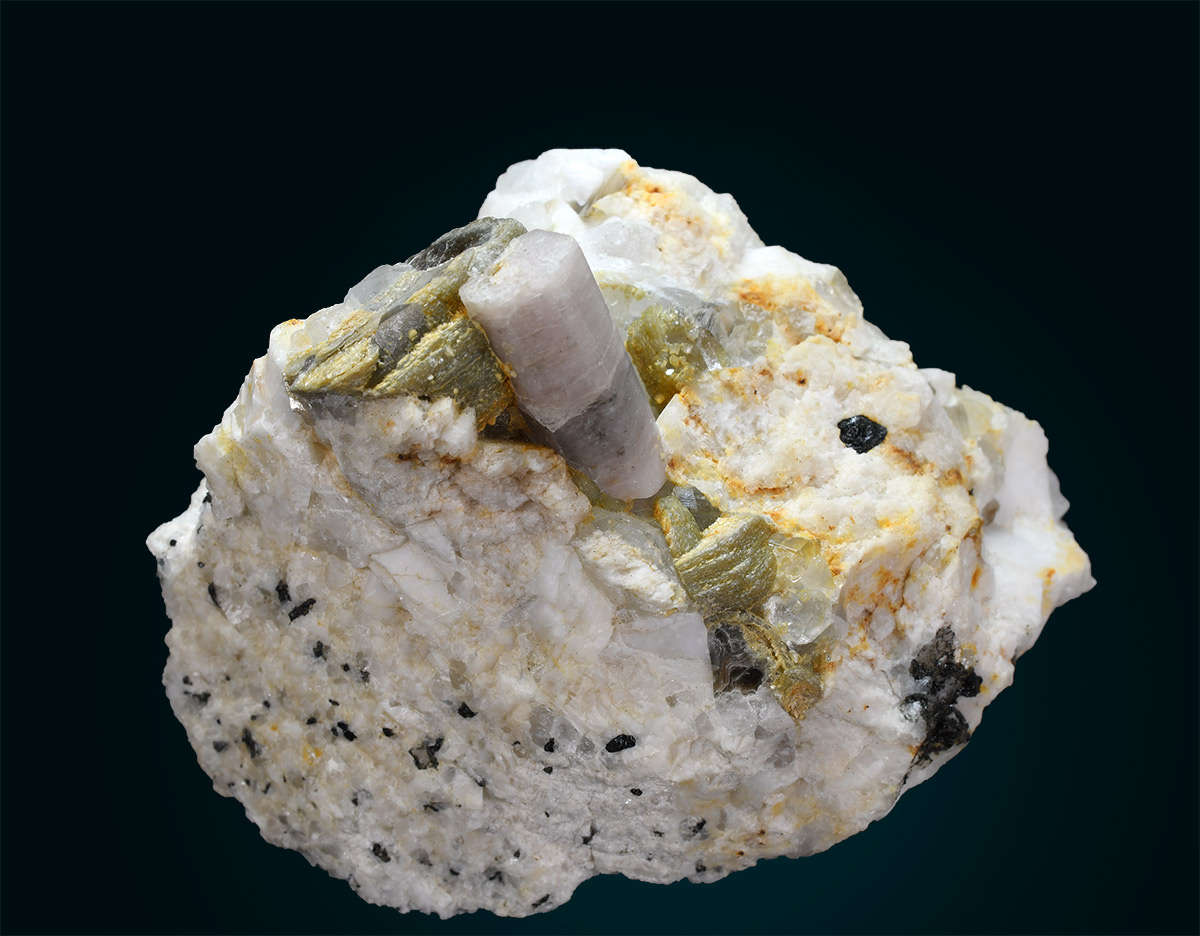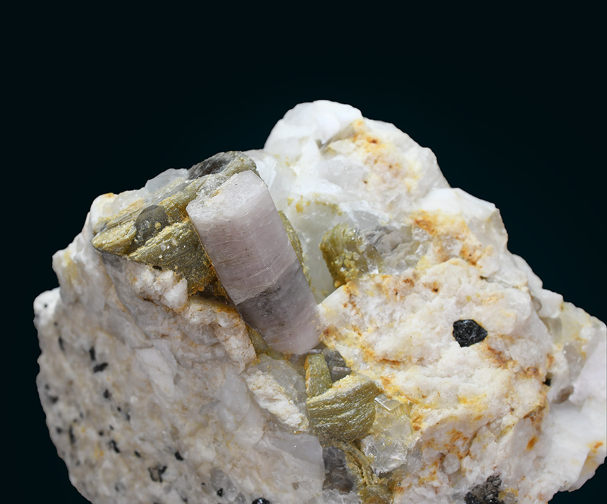 Fully terminated pinkish Apatite crystal 2,4 cm tall set on pegmatite matrix with muscovite in association.