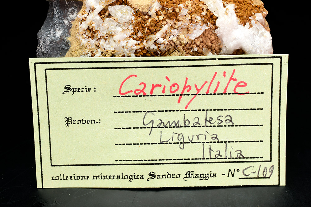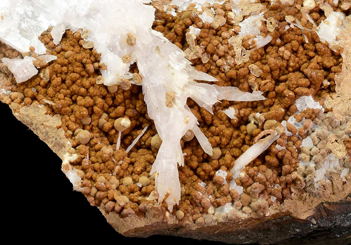 Specimen of reddish-brown Caryopilite spherules up to 1 mm richly set on black manganese matrix.