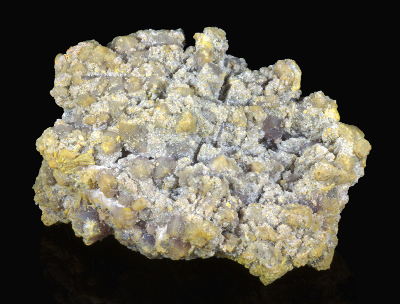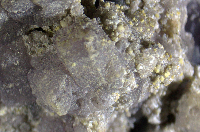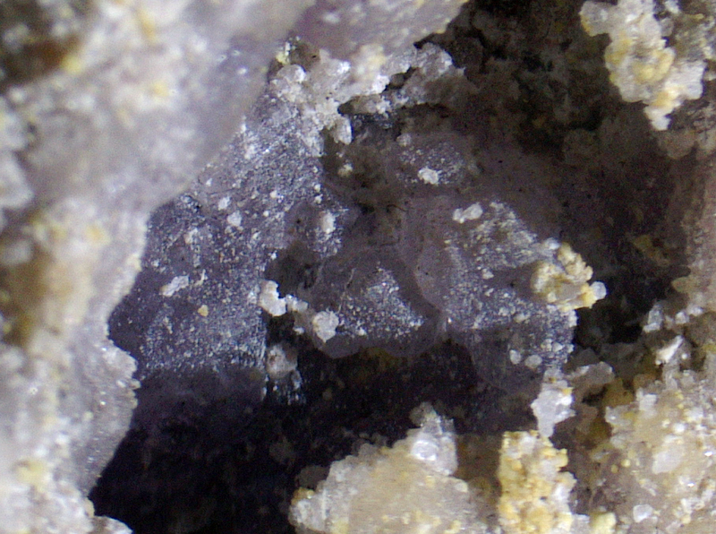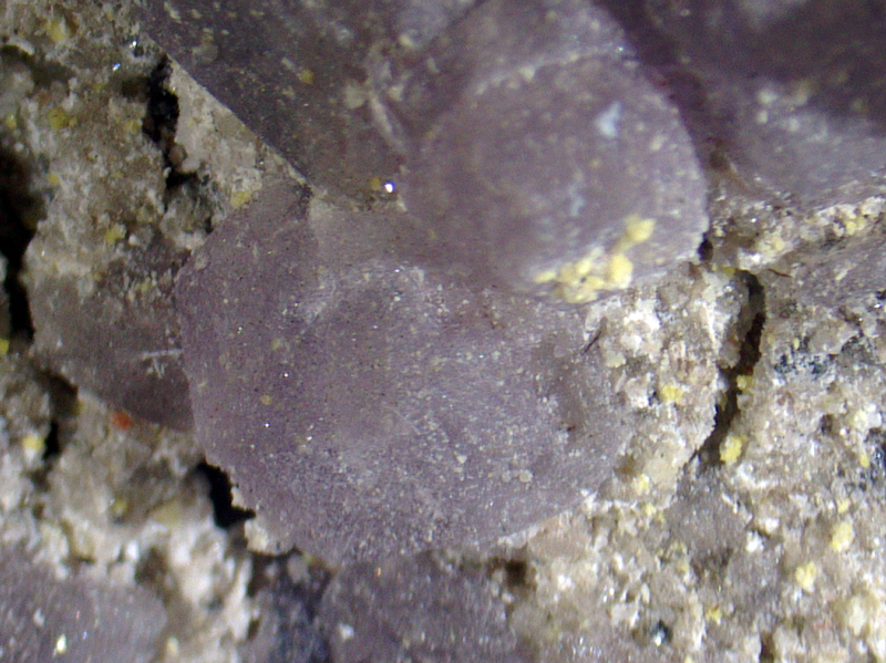 Pale yellowish/green goldichite xx with light purple coquimbite xx.