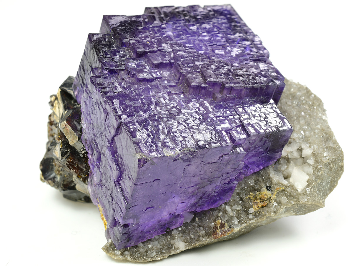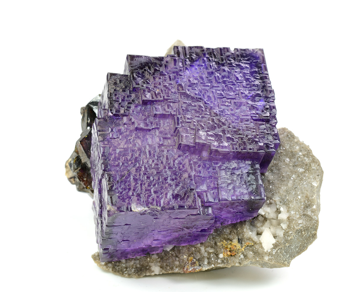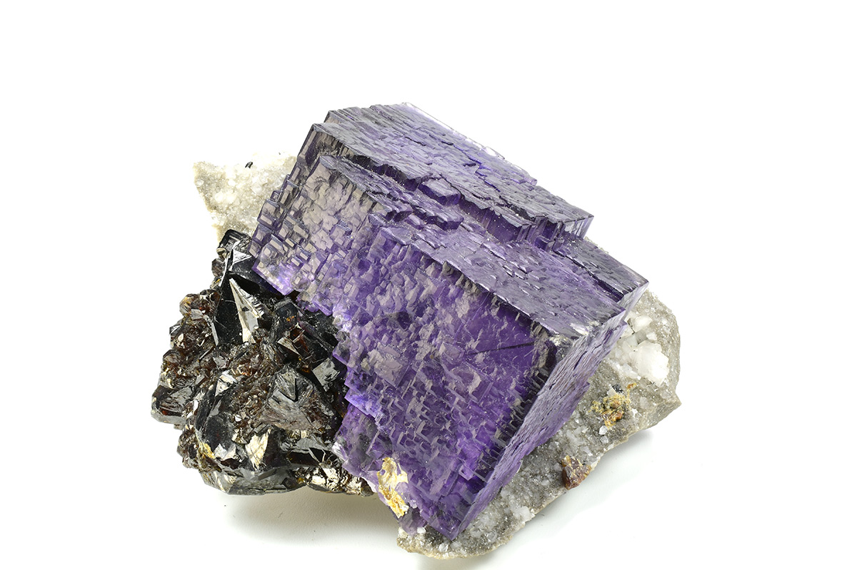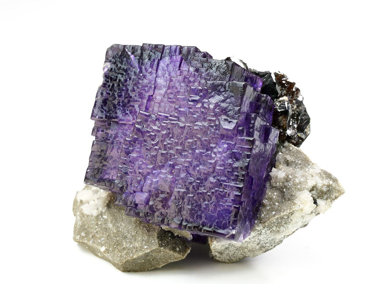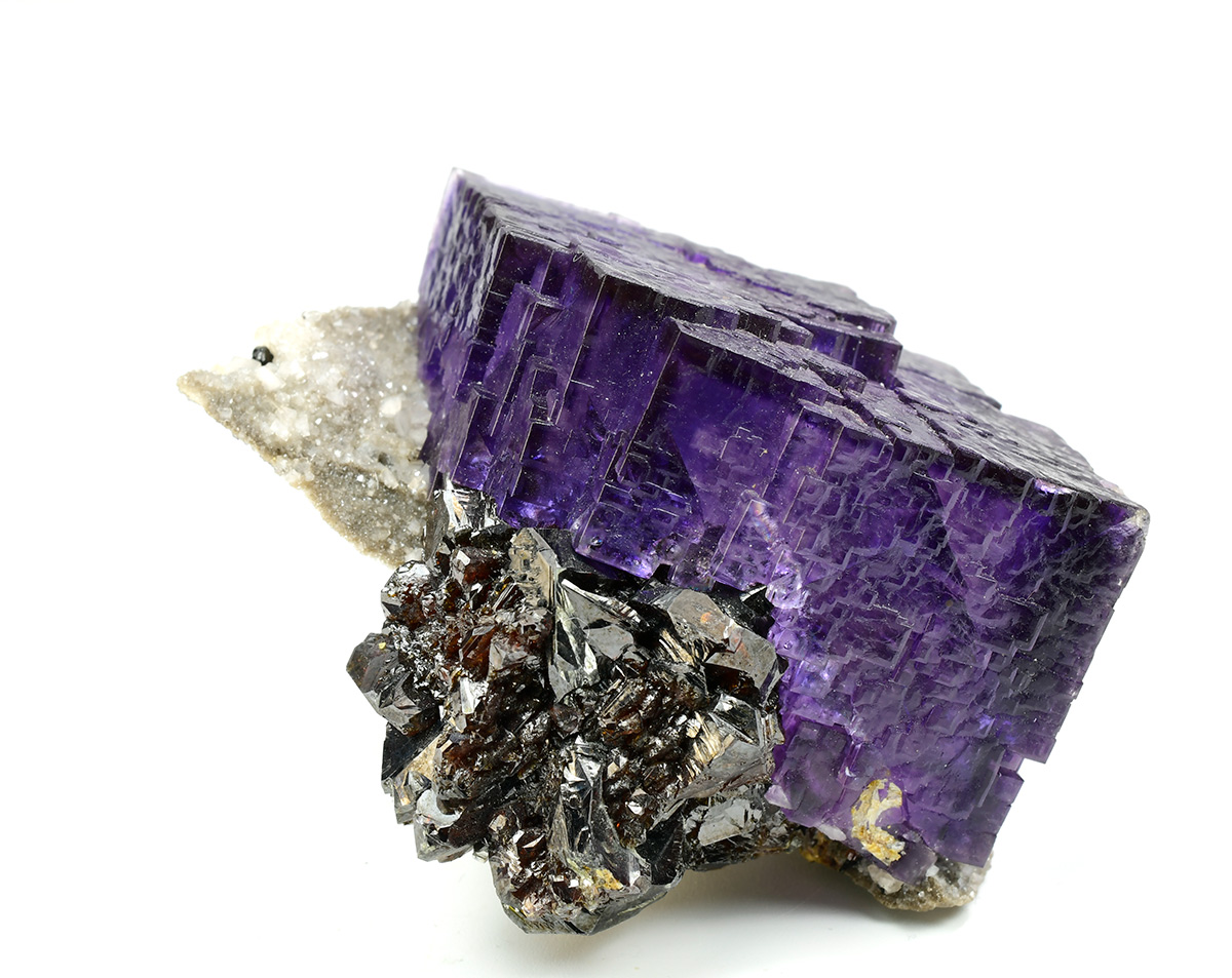 Really nice group of lustrous, translucent, dark purple Fluorite crystals measuring 44x42x30 mm with well defined deep red Sphalerite xls in association on matrix.