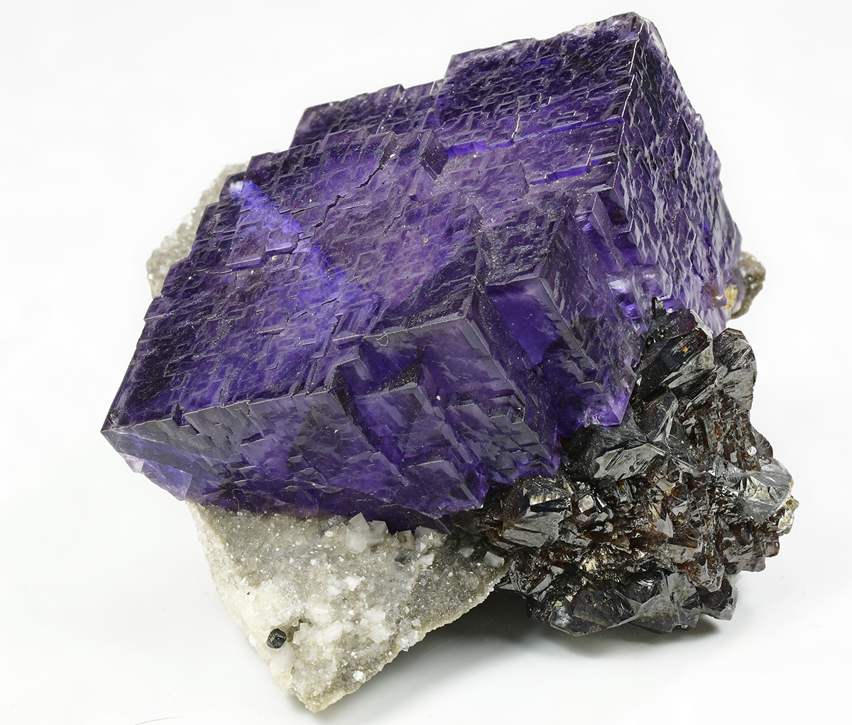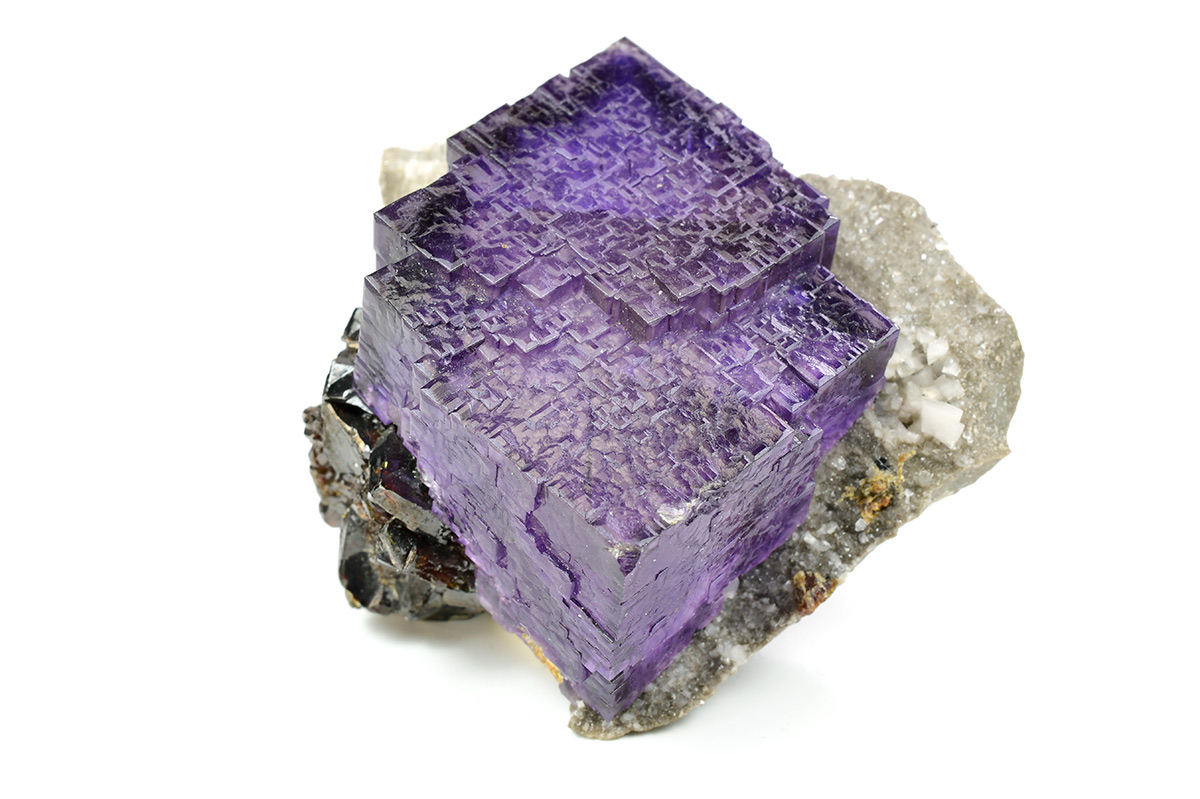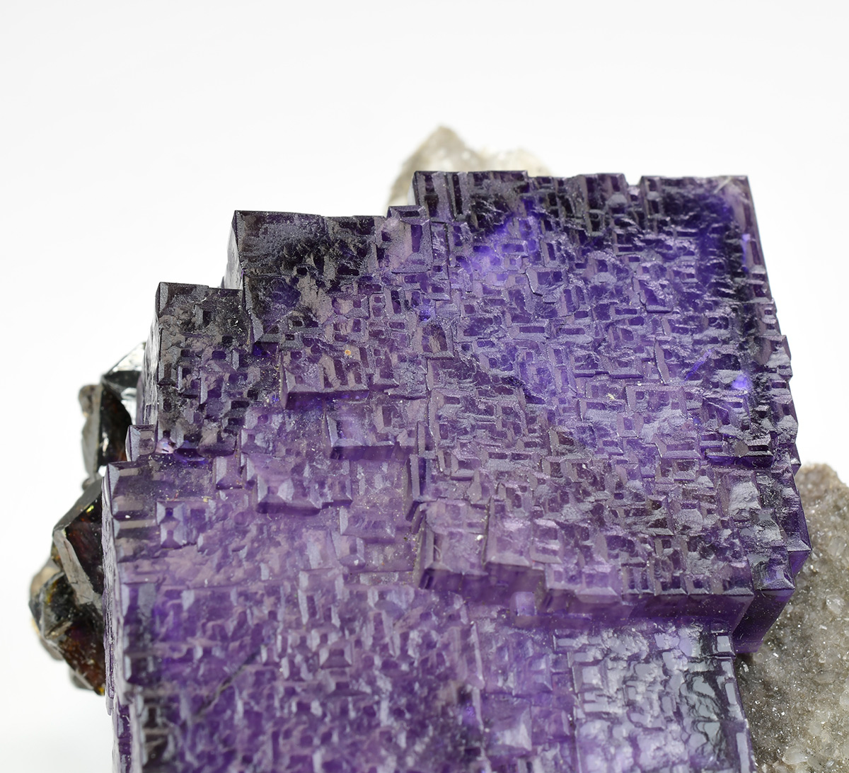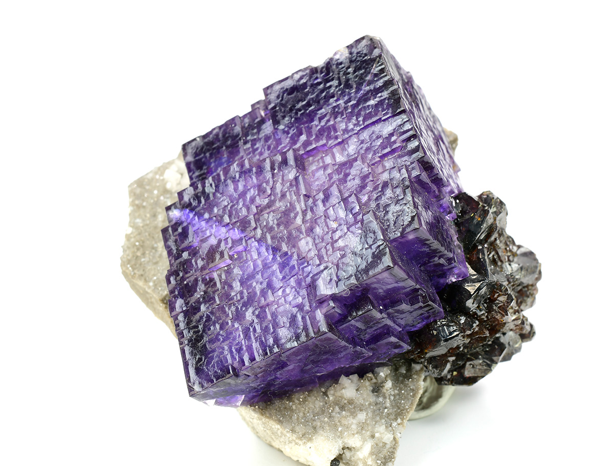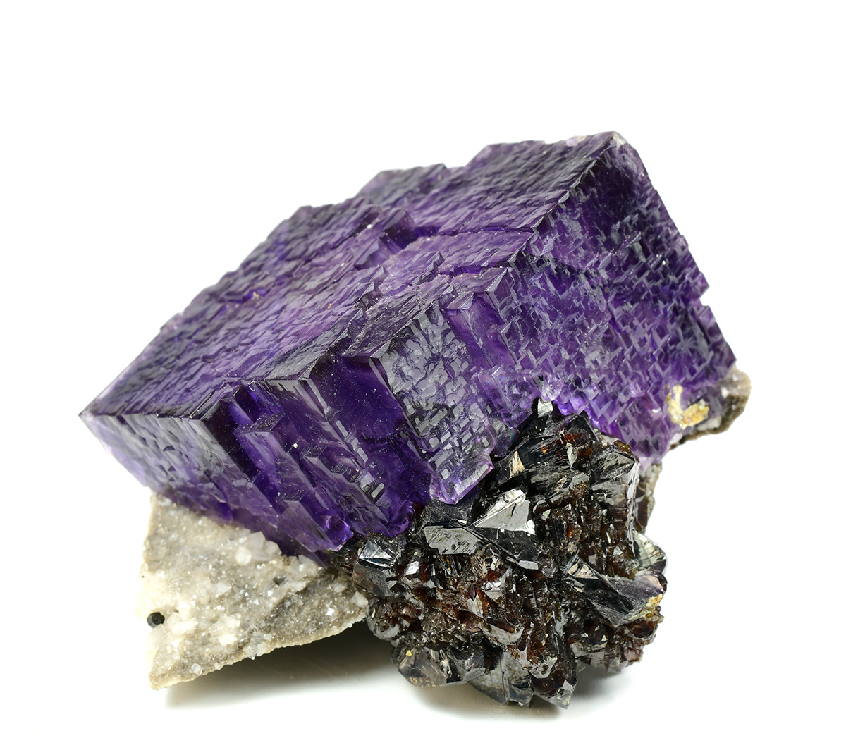 Really nice group of lustrous, translucent, dark purple Fluorite crystals measuring 44x42x30 mm with well defined deep red Sphalerite xls in association on matrix.