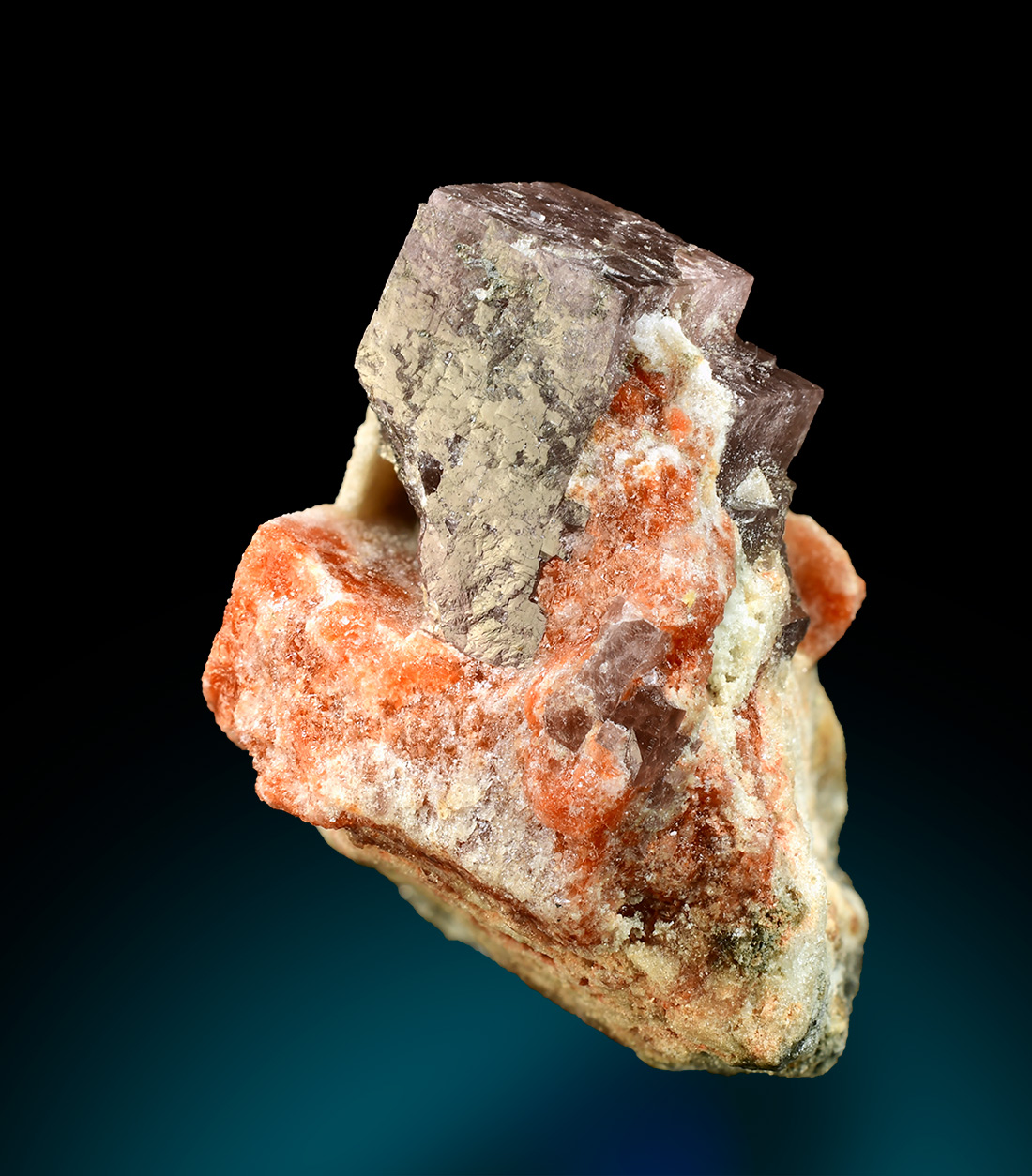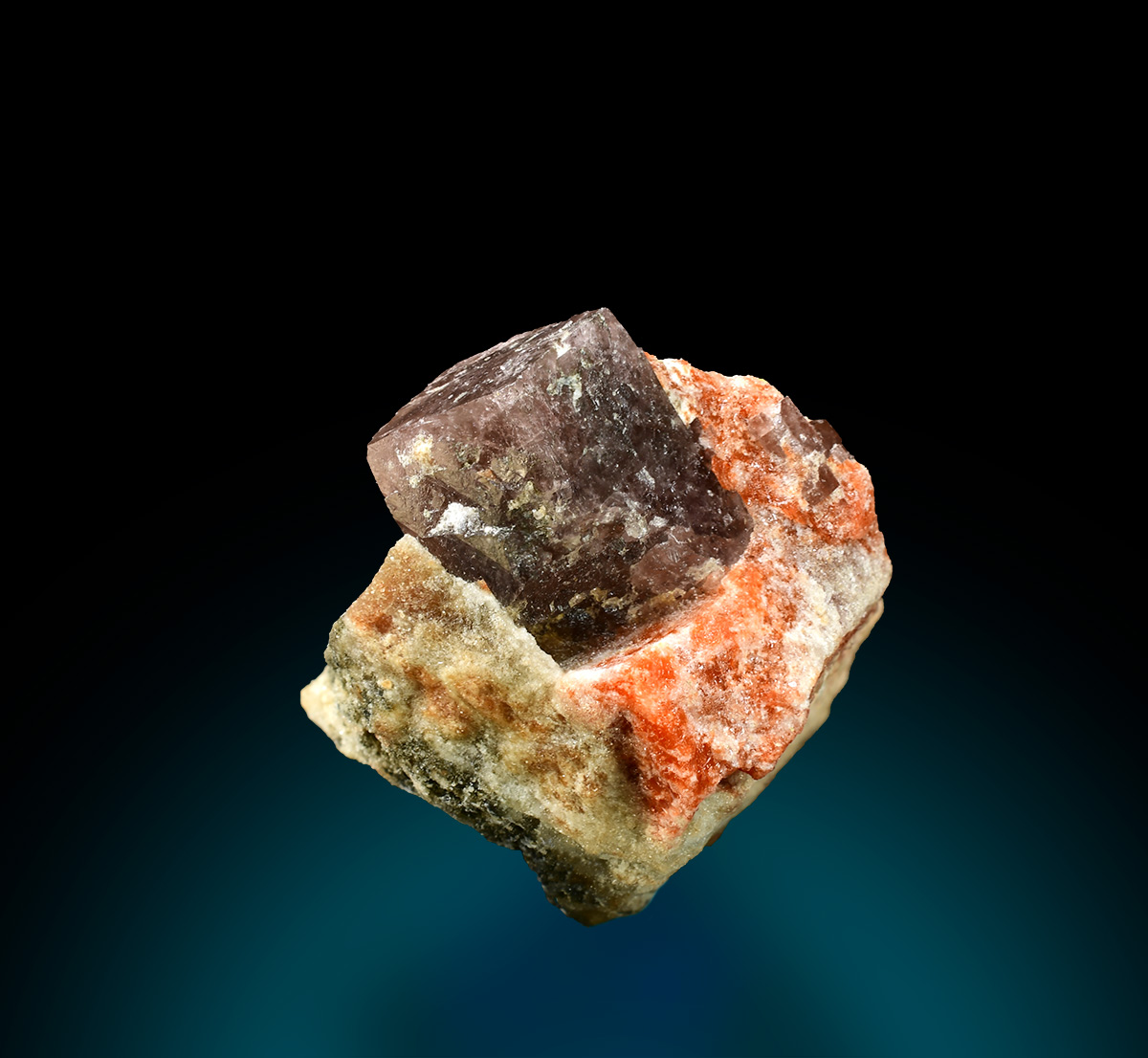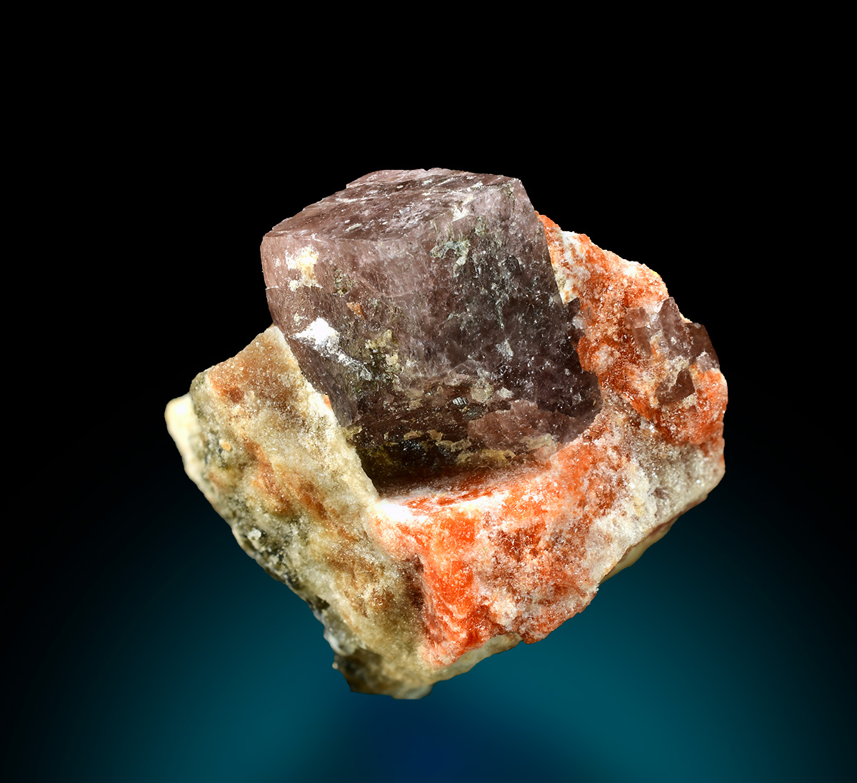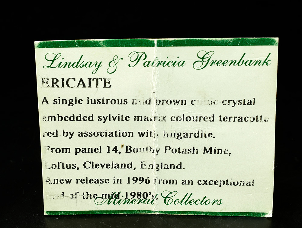 A single lustrous brownish cubic crystal of Ericaite embedded in syslte matrix coloured rerracotta red by association with Hilgardite. A new release in 1996 from an exeptional find in the mid 1980's. Ericaite is a very rare Fe-borate, a member of the Boracite Group.