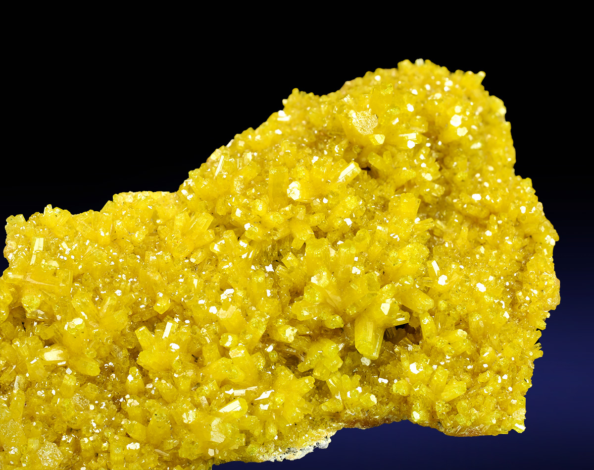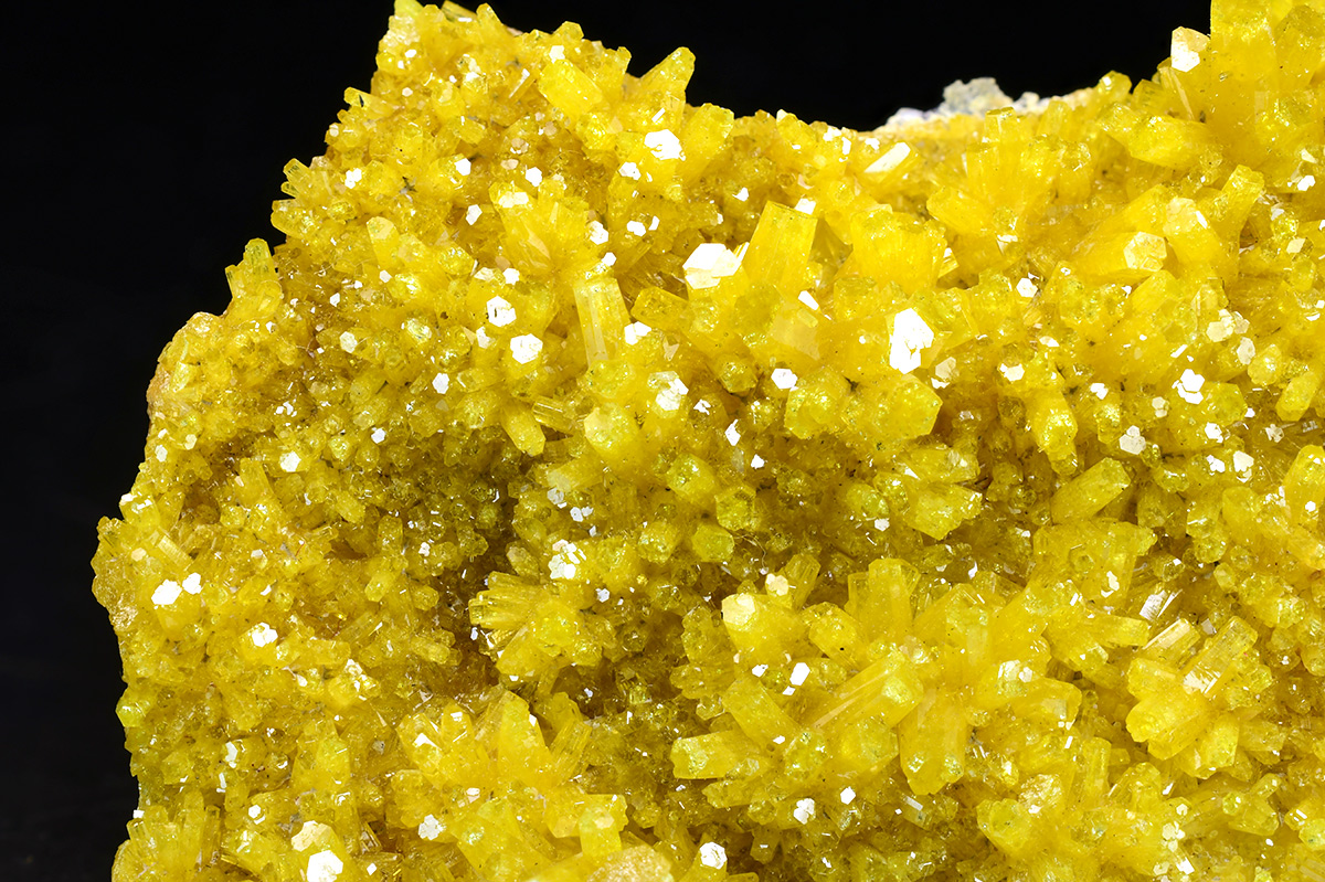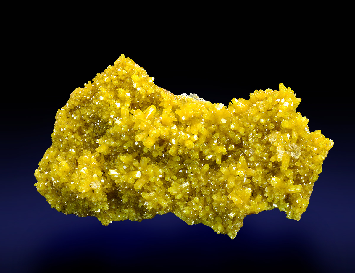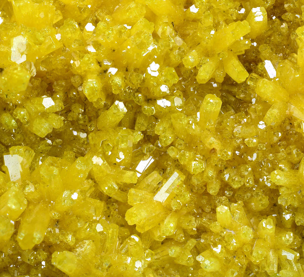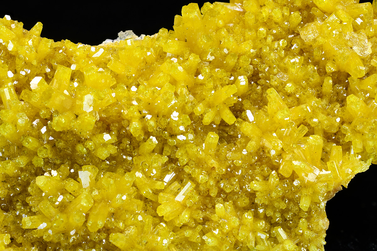 An aesthetic plate covered with lustrous, translucent, sunflower-yellow pyromorphite crystals up to 3-4 mm from the famous Bunker Hill mine.