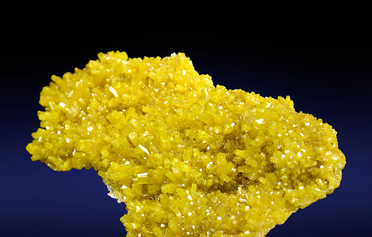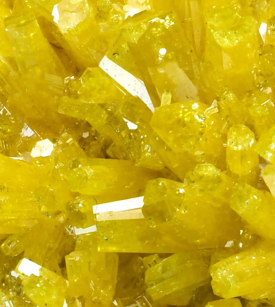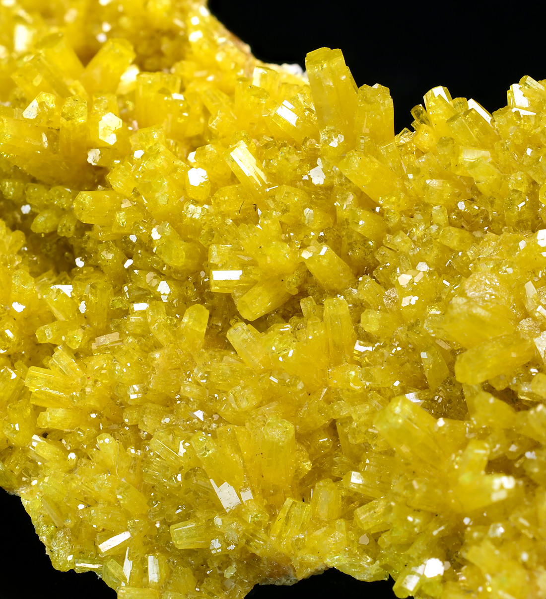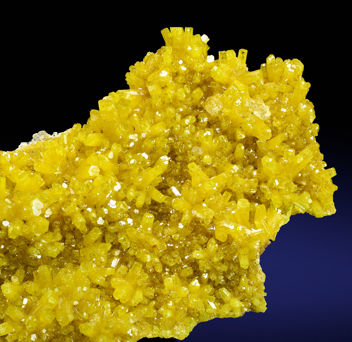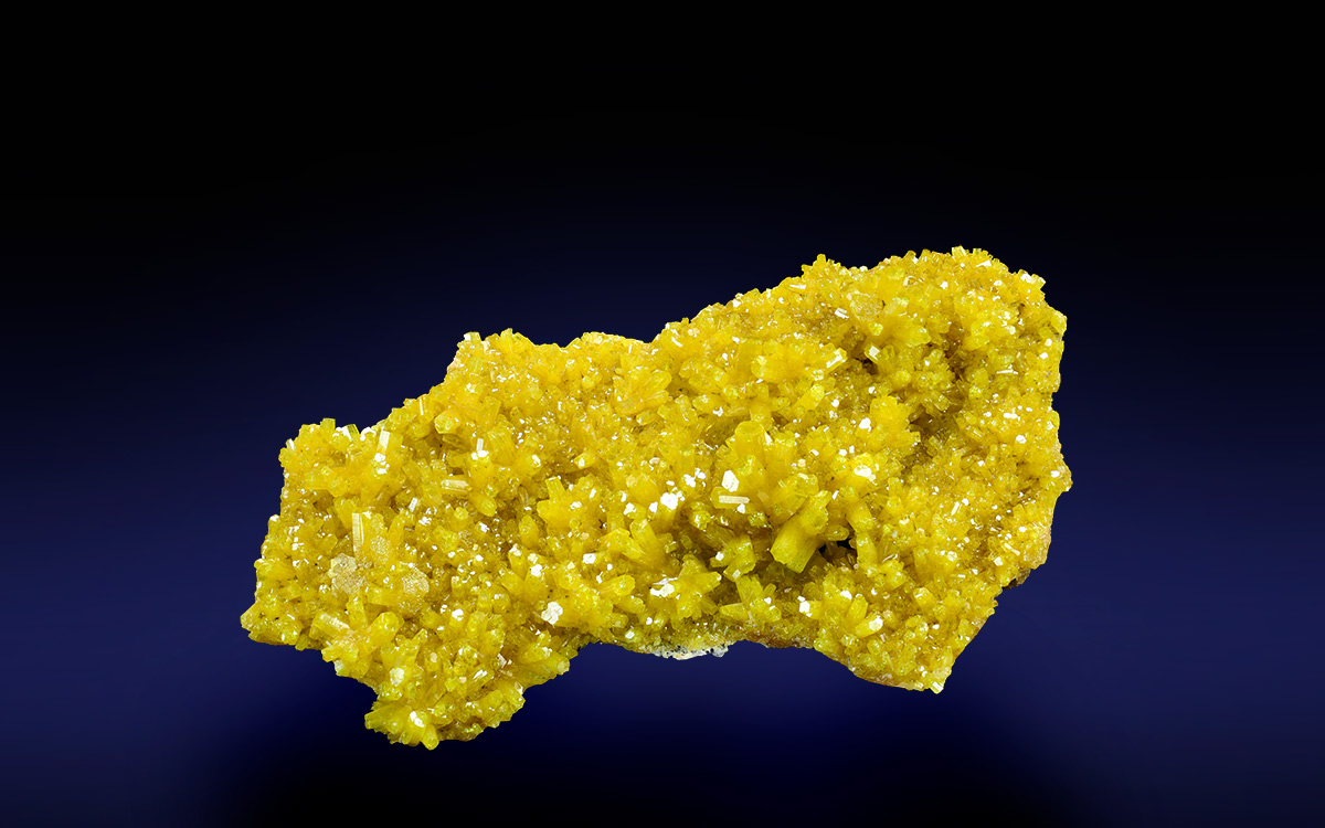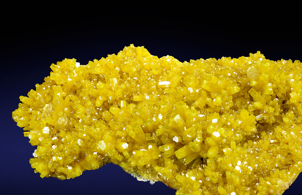 An aesthetic plate covered with lustrous, translucent, sunflower-yellow pyromorphite crystals up to 3-4 mm from the famous Bunker Hill mine.